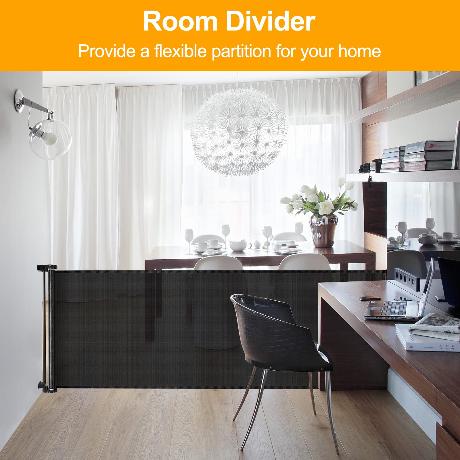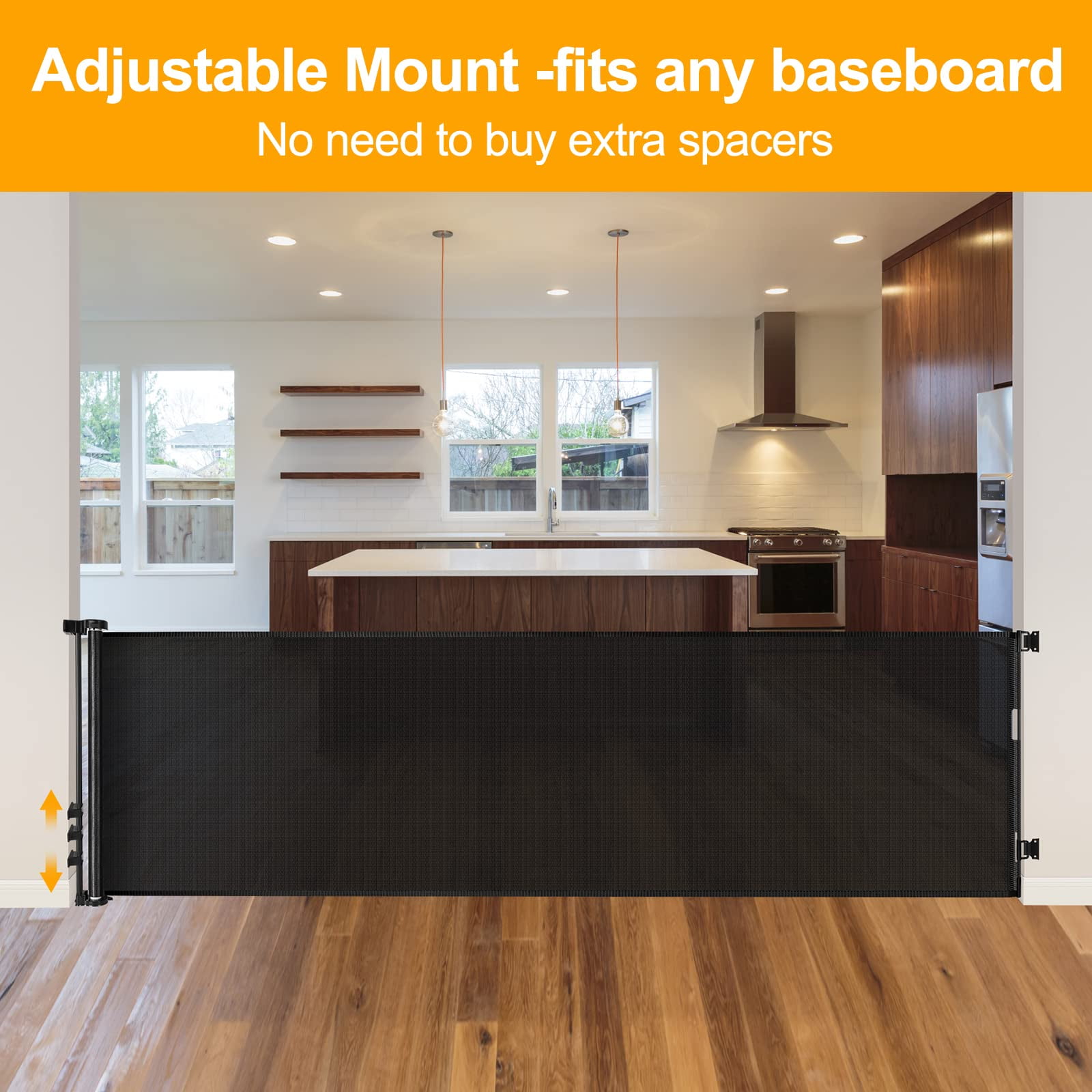 [100 Inch Extra Wide Baby Gate ] This retractable baby gates Fits openings up to 100″ wide and is 35″ tall which can be adjusted to fit your openings according to your needs.Suitable for babies and dogs. [Retractable Gate ] You can roll it up when not in use, which saving your space. Unlike iron gate rails, this new retractable gate has no bottom rails – so there’s no tripping hazard.Children and wheelchairs are easy to pass through, and elegant design works well with your home style. It is effective to stop your children from entering dangerous space. [Flexible Partition ] In addition to be a baby proofing child gate, WOMHOM extra wide retractable dog gate also works well as a semi-enclosed play yard, barrier and room divider. You can flexibly divide some space for your babies and dogs. [Fits Any Baseboard ] No need to buy extra spacers, our extra wide retractable pet gate accessories can be adjusted up and down to fit Any Baseboard. [One-Handed Operation ] the extra long baby gate can easily open and close the gate with one hand while holding the baby. Easy to open for adults, but difficult for babies. [Perfect Fit Indoor and Outdoor ] extra large baby gate can be used both indoors and outdoors, such as open kitchens, at the bottom of stairs, doorways, decks etc. the baby gates extra wide Works as both a mesh baby gate and a mesh dog gate to providing a safe environment to play.