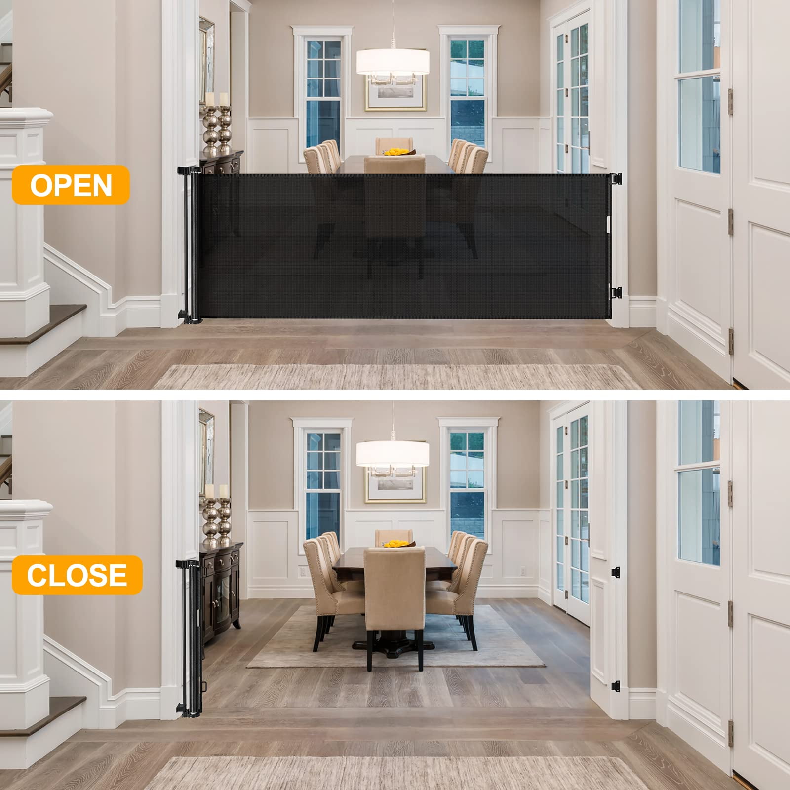 Feature Retractable Design – saving your space : the long gates for kids or pets is easy to use in high traffic areas, and the baby proofing mesh pet gate can be completely retracted when not in use without taking up a large space. Fits openings up to 100″ wide : this child gate for doorway Fits openings up to 100″ wide and is 35″ tall which can be adjusted to fit your openings according to your needs. Easy to Open for Adults, But Difficult for Babies : the gates for dogs indoor gate can easily open and close the gate with one hand while holding the baby. Easy to open for adults, but difficult for babies. Room divider : an extra long dog gate may double as a room divider or barrier, giving you some extra configuration options. Suitable for Babies and Pets : the baby gate retractable Works as both a baby gate and a pet gate to providing a safe environment to play.