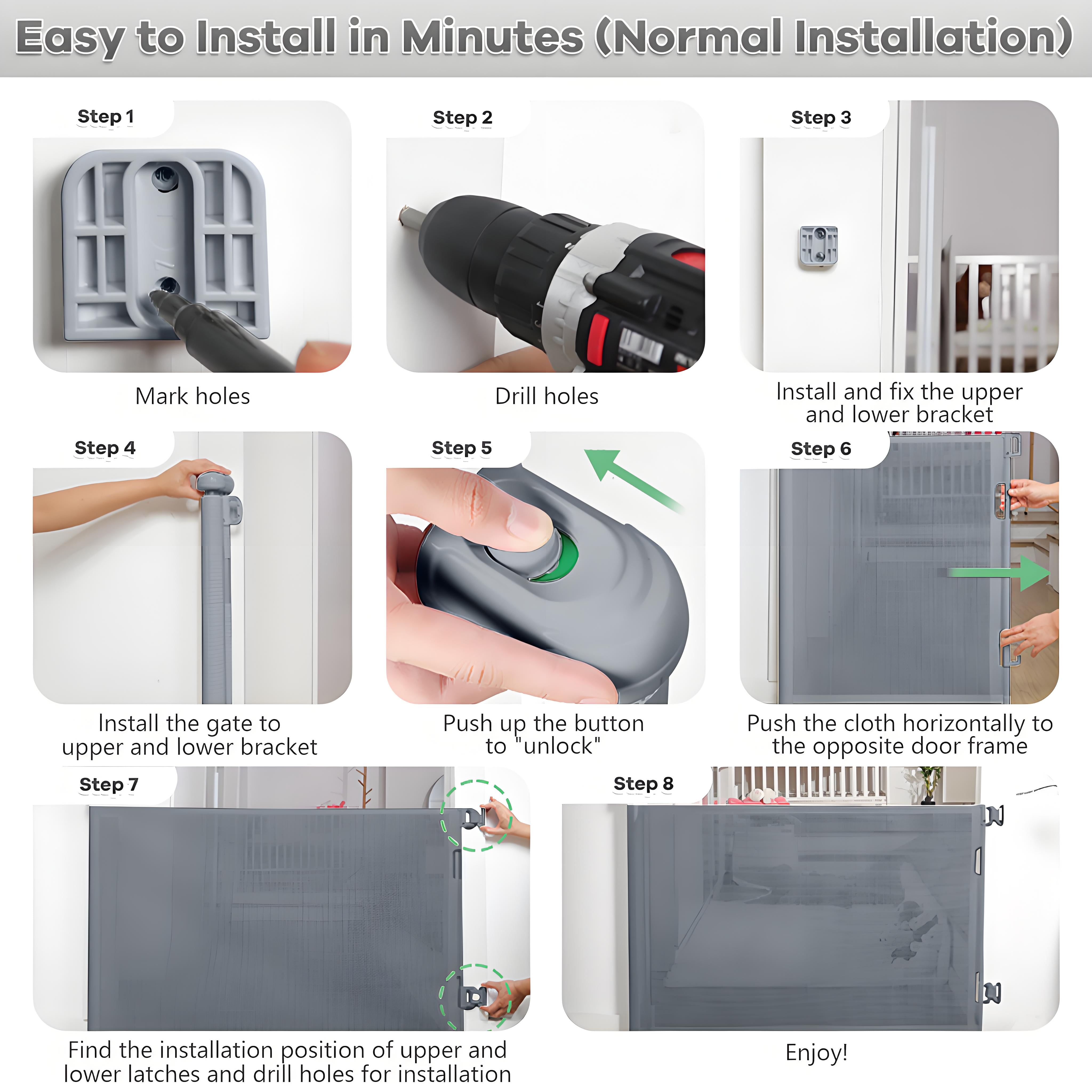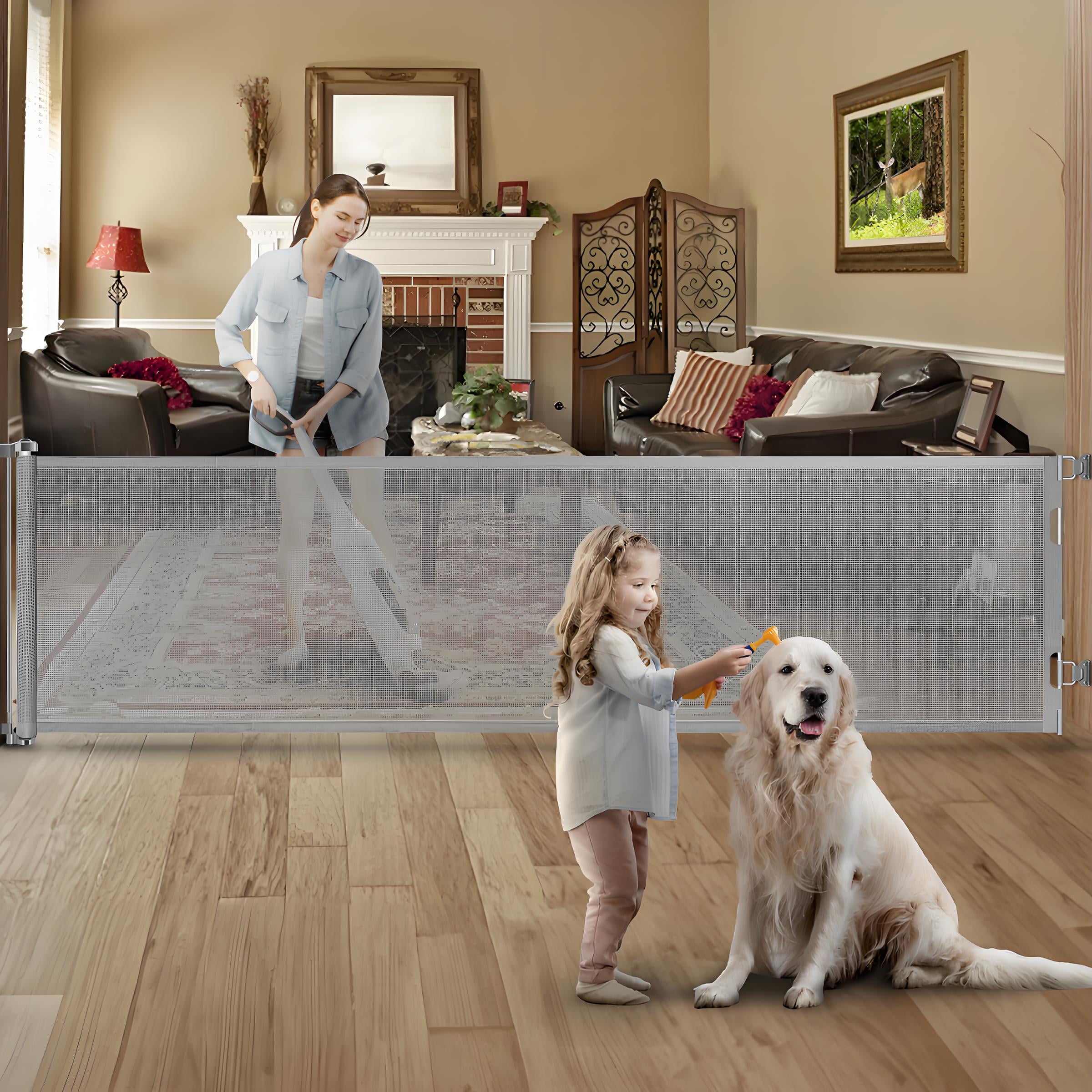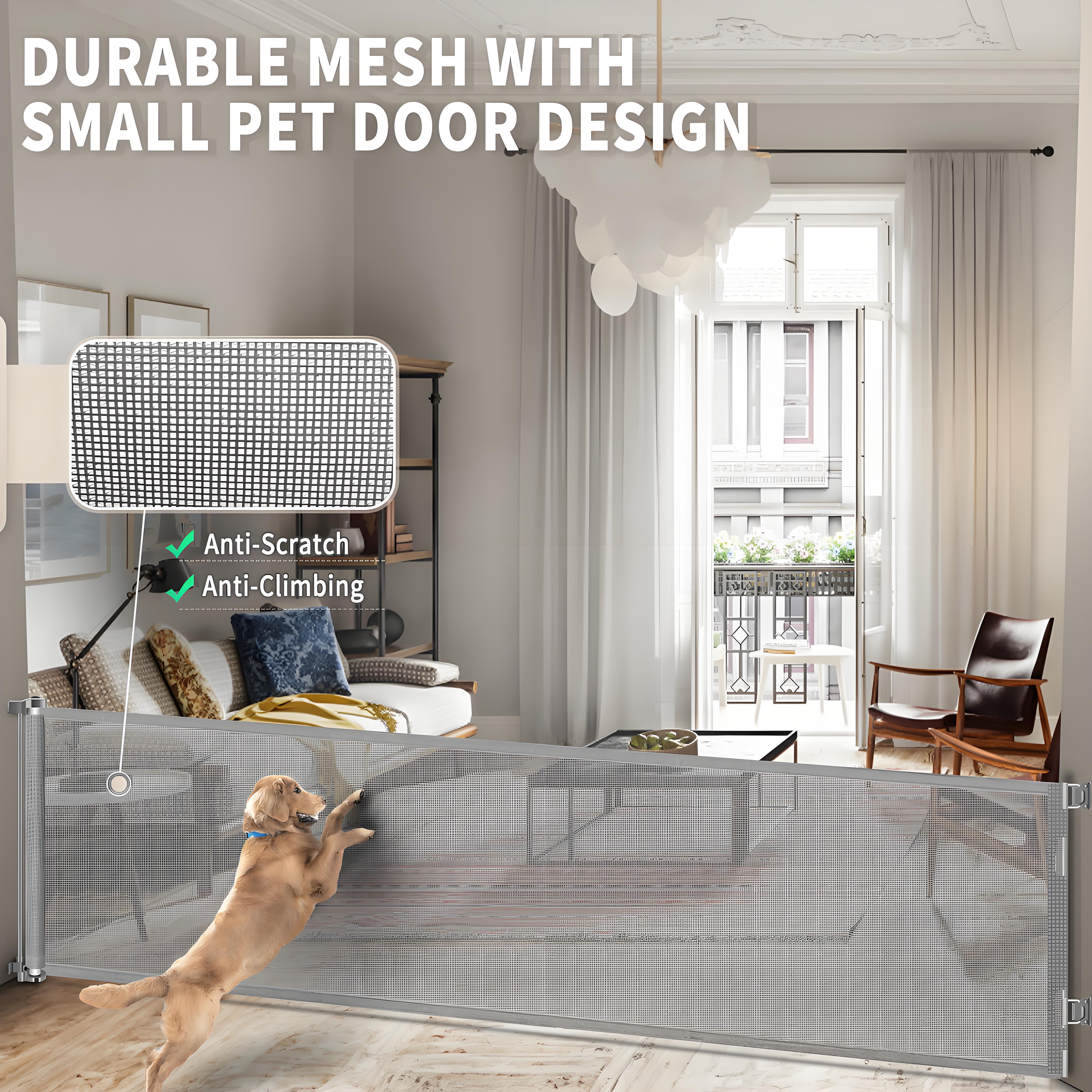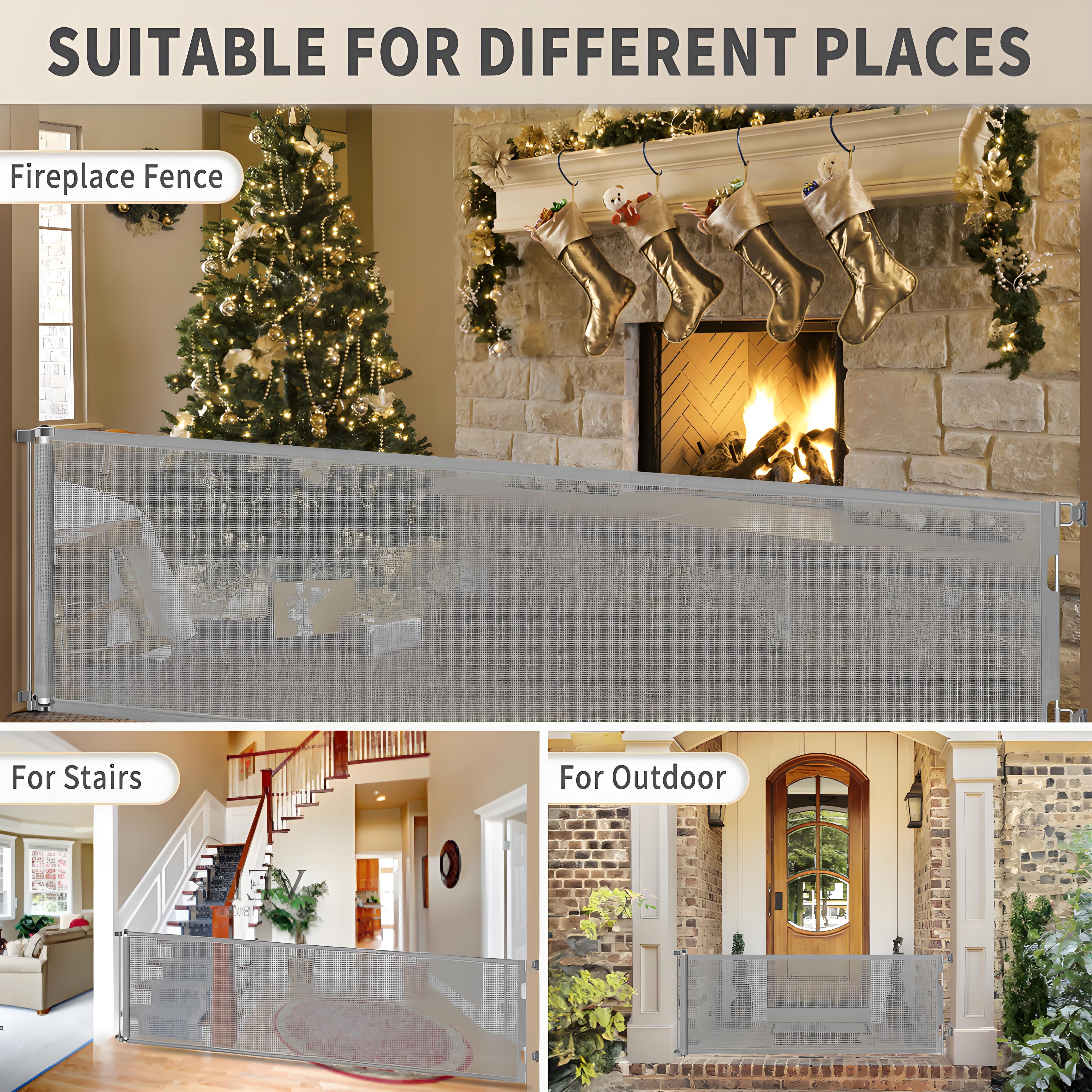 ✅120 Inch Extra Long Baby Gate✅ POPO extra wide retractable gate fits large openings up to 120″ wide and 34″ tall. The extra wide baby gate can be adjusted according to your needs to fit your opening. ✅Retractable Design – Space Saving✅ Retractable baby gates are easy to use in high-traffic areas, such as easily separating a dining room from other open living areas. The gate can be completely retracted when not in use, taking up no space.Children and wheelchairs are easy to pass through, and elegant design works well with your home style. It is effective to stop your children from entering dangerous space. ✅Upgrade Locking System for Easy One-Handed Use✅ Designed with a safety locking function, even the extra wide mesh baby gate is as easy to use. Adults can easily open it with one hand but difficult for babies. ✅Indoor and Outdoor Safety Gate✅ Each set includes 1 extra long retractable baby gate and required mounting accessories. Toddler gate is perfect for Indoor and Outdoor doorways, stairs, hallways, decks, etc. ✅Suitable for babies and pets✅ The extra wide dog gates Works as both an baby gate and a pet gate to providing a safe environment to play.