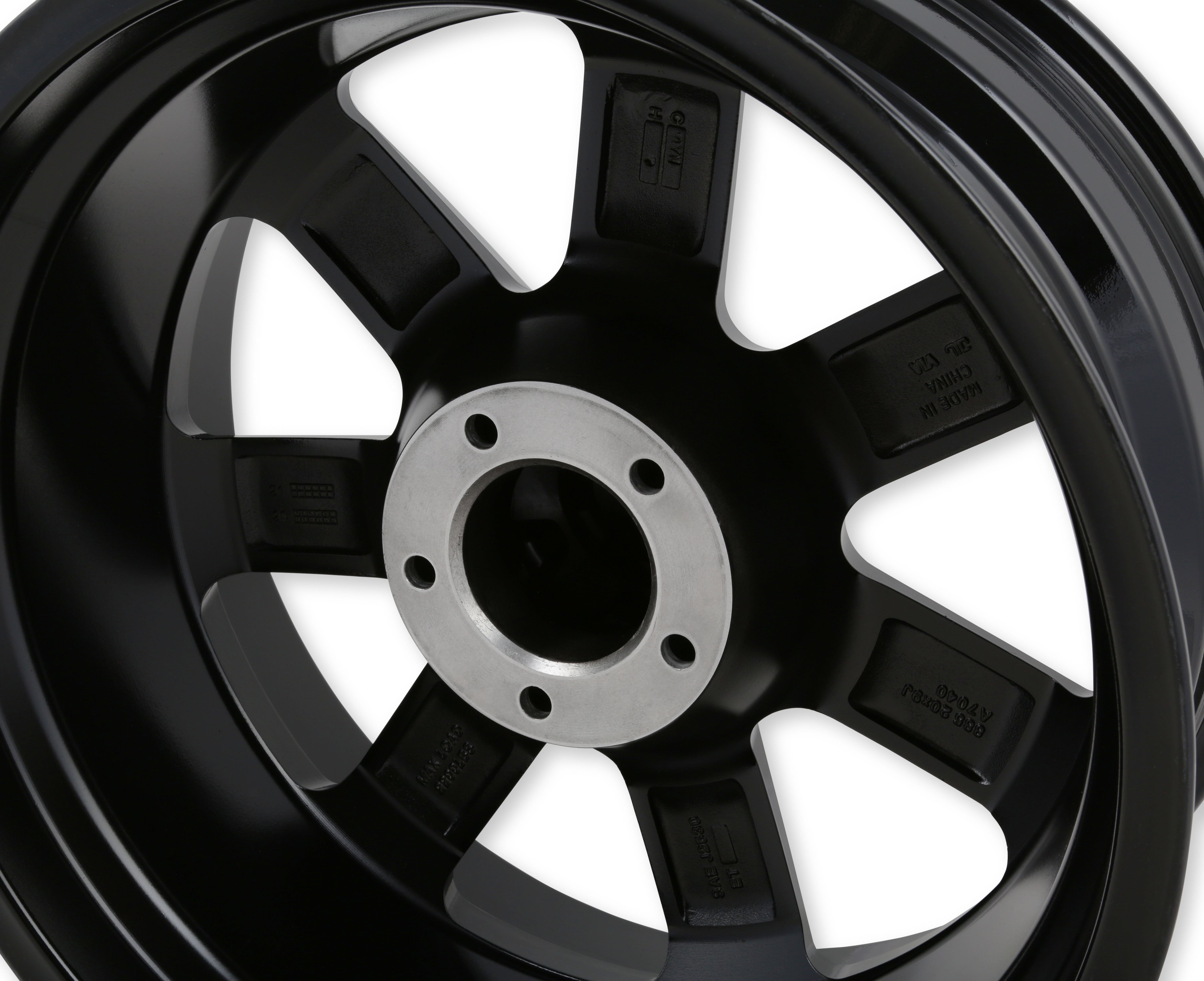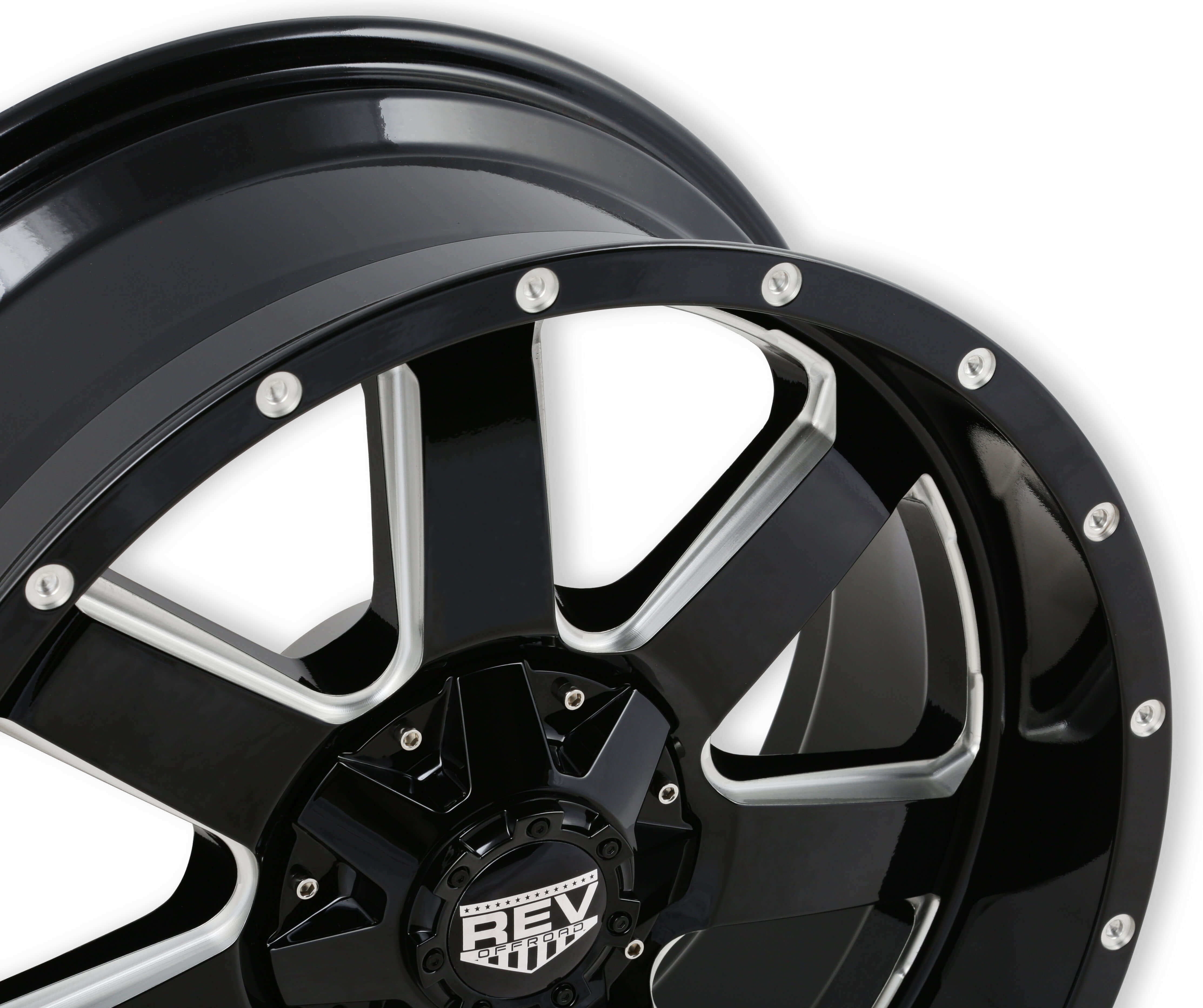 Aggressive Off-Road Design Cast Aluminum Wheel Construction Black with Machined Spokes and Simulated Rivets 4.53″ Wheel Backspacing 5 x 5 and 5 x 5.5 Dual Wheel Bolt Patterns