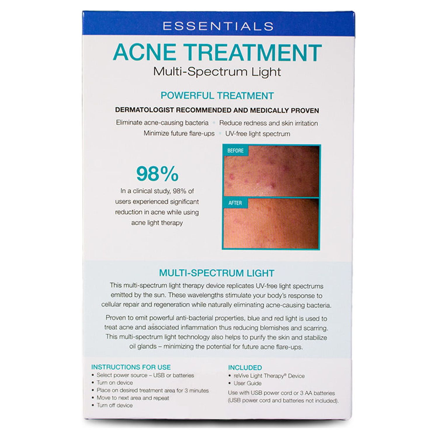ReVive Light Therapy® Essentials Kills acne-causing bacteria, clears existing breakouts, a prevents future flareups Calms redness and inflammation 3-minute treatment time; visible results in just a few days Non-UV blue and red LED light pentrate to treat acne from within Portable design fits easily in purse, bag, or luggage 0.4 lbs Battery powered – requires two AA Batteries