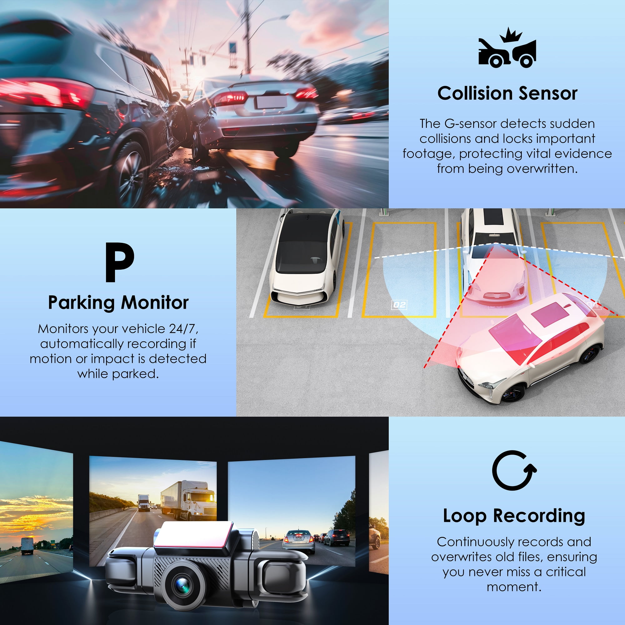 4-Channel Coverage: Capture every angle with front, rear, left, and right views in 1080p. IR night vision for cabin and side cameras ensures clear footage in low-light conditions. 1080p Resolution: Record crystal-clear footage from all sides. Important details stay sharp even when zoomed in. Wi-Fi & Advanced App Control: Connect seamlessly to the Rexing Connect App to download, view, and share videos directly from your smartphone. Use the app to adjust settings, format the SD card, and access live view without removing the dash cam. Loop Recording & G-Sensor: Ensures continuous recording by overwriting old footage. The G-Sensor locks important files when a collision is detected. Optional Upgrades: Unlock GPS tracking for speed and location details and enable Parking Mode by attaching a GPS Smart Hardwire Kit, which can be added if needed. Type-C Charging Port: Features a Type-C port for fast and reliable power via your vehicle’s cigarette lighter socket. Dual Mount Options: Includes both adhesive mount and suction cup mount for flexible installation. 32GB Card Included: Comes pre-installed with a 32GB microSD card for out-of-the-box recording.