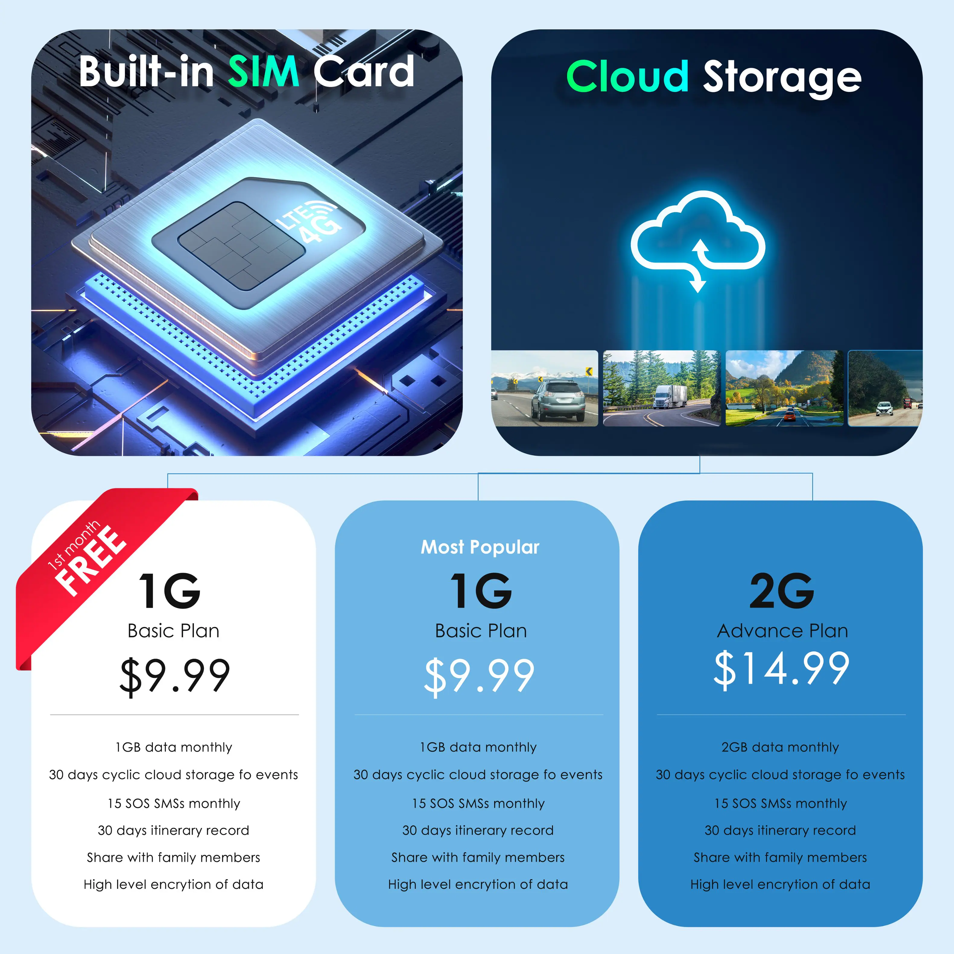 First month free, then $9.99/month with 1GB data and 30-day unlimited cloud storage, providing cost-effective and reliable coverage.