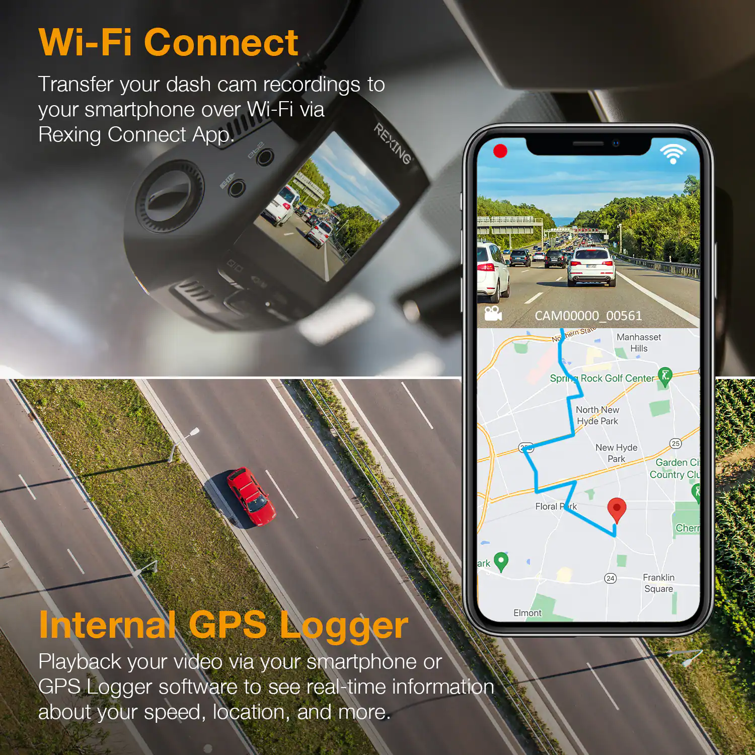 Connect your dash cam to your phone using our mobile application which uses the cameras built-in WiFi signal. Directly transfer/edit/share video updates to our community of REXING dash cam users and social media.
