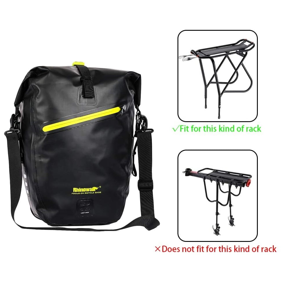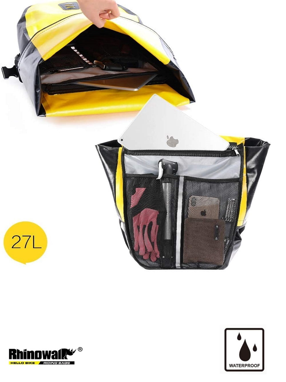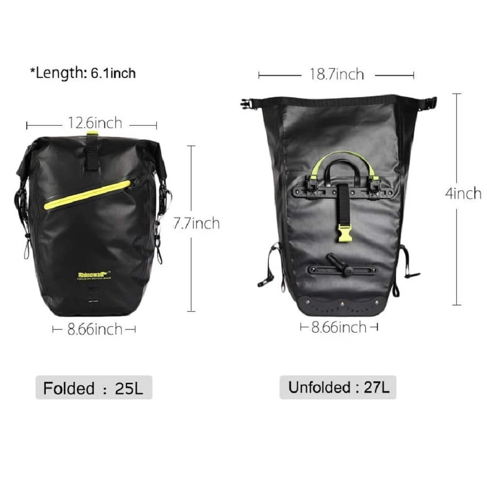 Rhinowalk 1000D Polyester Waterproof Green Bike Pannier Bag Fully waterproof design made of 1000D polyester with waterproof PVC layer on both sides Durable, anti-tear, wear-resistant, and heat-resistant material Large capacity of 25-27L when fully expanded Easy installation with a quick release system for rear seat trunk rack Includes a removable adjustable nylon shoulder strap for convenient carrying Designed with multiple compartments for organized storage Reflective strips for increased visibility