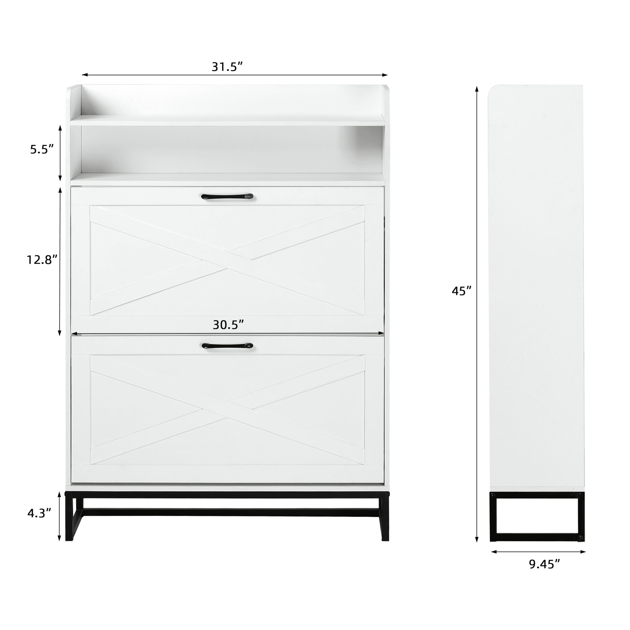 RichYa shoe storage cabinet is a very practical piece of furniture. It not only has ornamental value but also provides ample storage space. This flip drawer shoe cabinet combines retro design with a modern industrial style. It can match most decoration styles and is a versatile choice for foyers, entryways, hallways, living rooms, or porches. SPECIFICATION: Material: MDF, Metal Number of Pairs of Shoes: 20 pairs Overall Dimension: 31.5″ L x 9.45″ W x 45″ H Available Colors: White, Rustic Brown Style: Farmhouse, Retro, Modern Product Weight: 48 lbs Package Weight: 53 lbs