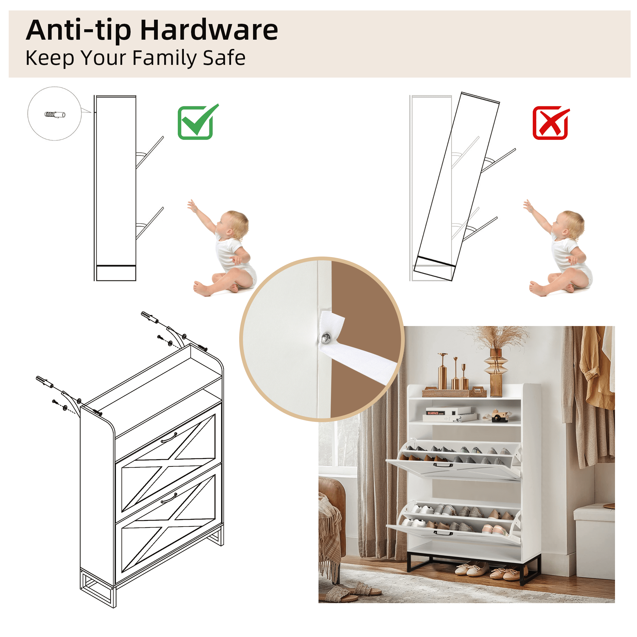 【??Entryway Shoe Cabinet】 The hidden shoe cabinet has 2 flip doors and a storage compartment, stylish and simple, neat and beautiful, and suitable for various home styles. Perfect for placement in an entryway, hallway, living room, or porch, giving your home a neat and spacious look. 【??Entryway Shoe Cabinet】 The hidden shoe cabinet has 2 flip doors and a storage compartment, stylish and simple, neat and beautiful, and suitable for various home styles. Perfect for placement in an entryway, hallway, living room, or porch, giving your home a neat and spacious look. 【??High Quality Shoe Cabinet】 The shoe storage cabinet is made of high-quality MDF wood and metal legs, the stable structure ensures super strong load-bearing capacity. It contains an anti-tip device that can be fixed to the wall to prevent tipping and protect children’s safety. 【??High Quality Shoe Cabinet】 The shoe storage cabinet is made of high-quality MDF wood and metal legs, the stable structure ensures super strong load-bearing capacity. It contains an anti-tip device that can be fixed to the wall to prevent tipping and protect children’s safety. 【??Large Capacity Shoe Cabinet】The drawer shoe cabinet can store up to 20 pairs of shoes. There are two upper and lower drawers, each containing two layers of storage space. The panels can be adjusted or removed in two grooves to accommodate flat shoes, outdoor boots, or high heels of different heights and sizes! There is a rail on the top, perfect for potted plants and decorations, and the middle compartment can hold books and documents. The bottom can hold slippers or a robot vacuum cleaner. 【??Large Capacity Shoe Cabinet】The drawer shoe cabinet can store up to 20 pairs of shoes. There are two upper and lower drawers, each containing two layers of storage space. The panels can be adjusted or removed in two grooves to accommodate flat shoes, outdoor boots, or high heels of different heights and sizes! There is a rail on the top, perfect for potted plants and decorations, and the middle compartment can hold books and documents. The bottom can hold slippers or a robot vacuum cleaner. 【??Flip Drawer Design】The modern freestanding shoe cabinet features a space-saving flip drawer for easy opening and closing. Unlike ordinary shoe racks, this shoe cabinet is perfect for small spaces and keeps shoes clean, away from dust, bugs and pets. No wooden panel on the back allows for ventilation and keeps the shoe odor-free. 【??Flip Drawer Design】The modern freestanding shoe cabinet features a space-saving flip drawer for easy opening and closing. Unlike ordinary shoe racks, this shoe cabinet is perfect for small spaces and keeps shoes clean, away from dust, bugs and pets. No wooden panel on the back allows for ventilation and keeps the shoe odor-free. 【??Easy to Install】 This Shoe Cabinet comes with detailed assembly instructions and installation parts, each part is numbered as an indication. You can assemble it easily with the detailed instructions and tools. If you have any questions before or after purchase, please feel free to contact us, we will reply as soon as possible within 24 hours. 【??Easy to Install】 This Shoe Cabinet comes with detailed assembly instructions and installation parts, each part is numbered as an indication. You can assemble it easily with the detailed instructions and tools. If you have any questions before or after purchase, please feel free to contact us, we will reply as soon as possible within 24 hours.