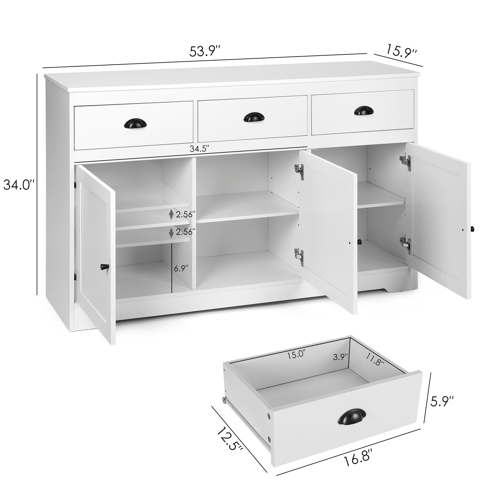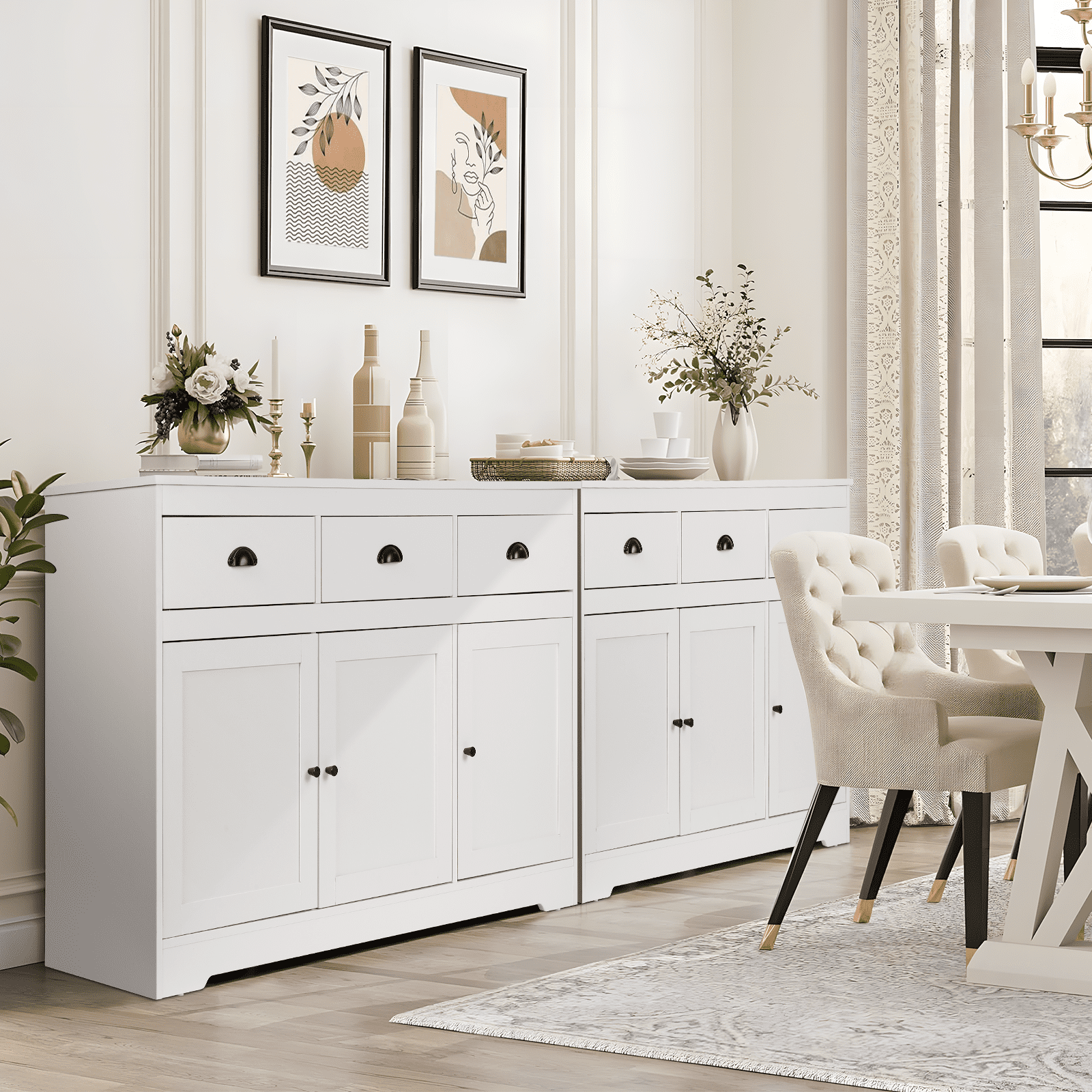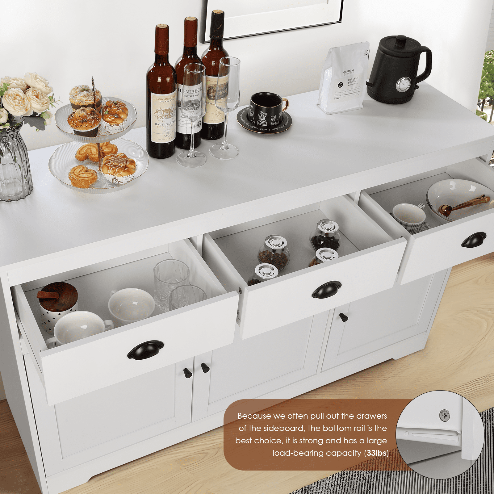 【Sturdy Stable Sideboard】The top surface of our sideboard can support up to 300lbs, each shelf can bear 33lbs.The entire cabinet structure is designed to be unique and stable, with support structures in both vertical and horizontal directions, so it will not sway. Made of high quanlity MDF mateiral, the sideboard buffet storage cabinet will not easy to deform after years of use. 【“ALL-PURPOSE” Cabinet】Classic white suits any home style, bars, kitchens, living rooms, dining rooms or coffee bars. Top three drawers are great for coffee storage, quick access of all type of tea bags / loose tea leaves( hold up the jars). Also can put utensils, potholders, dish towels, etc. Lower cabinet shelves(Adjustable) are perfect for pantry items or appliances, like a crockpot! Bottom cabinets care very spacious you can put coconut water/ box milk /nuts and some cookies 【Large Storage Buffet Cabinet】Perfect addition to your kitchen, long enough to fit the microwave and kettle. 53.6×15.8×33.9in, each drawer: ,each shelf(Adjustable): , 3 drawers on top and 3 cabinet doors on the bottom. Provide large storage space that can hold some wine bottles, seasoning cans, cutlery, food, pots and pan,etc, maximized your storage space keeps your kitchen and dining room clean and tidy. 【Exquisite details】Since the drawers of the sideboard need to be used frequently, we choose bottom rails, which are strong and have good load-bearing capacity. Damping hinges are used in the door frame, relying on a brand-new technology to adapt to the closing speed of the door. Even if the door is closed with force, it will close gently, ensuring perfect and quiet movement. 【Fully Edge-Sealed Design, Prenvent Moisture Waterproof, Reduced Smell】PVC edge banding, wear-resistant, high strength and hardness, using PUR edge banding technology, not easy to fall off, stable, odorless. Environmentally friendly, passed CARB certification and complied with California law formaldehyde standards for composite 【Easy Assembly】 Our sideboard cabinet comes with clear step-by-step instructions and numbered parts, the page is also has 3D video, the details of the assembly process have been discussed by the team many times and the steps have been simplified greatly. Feel free to contact the service team if you have any issues or concerns during the installation process. 【Reinforce Package,Reduce Breakage】We made 4 improvements to address the issue of sideboards cracking when they arrived.①The bursting strength of the five-layer carton is increased to 275 pounds (usually 180-200 pounds); ②The density of the surrounding filled Styrofoam is 35.3lb (usually 16.73lb); ③The component package is packaged separately in a kraft box, then placed in a carton to prevent it from running around and scratching other panels; ④The slide rails are also packed separately in the same kraft box 【No Worry】Check the goods as soon as possible after you receive them. If you have any questions, please feel free to contact us via the order number. If you have any problems during use, please contact us immediately and we will provide you with a perfect solution within 24 hours.