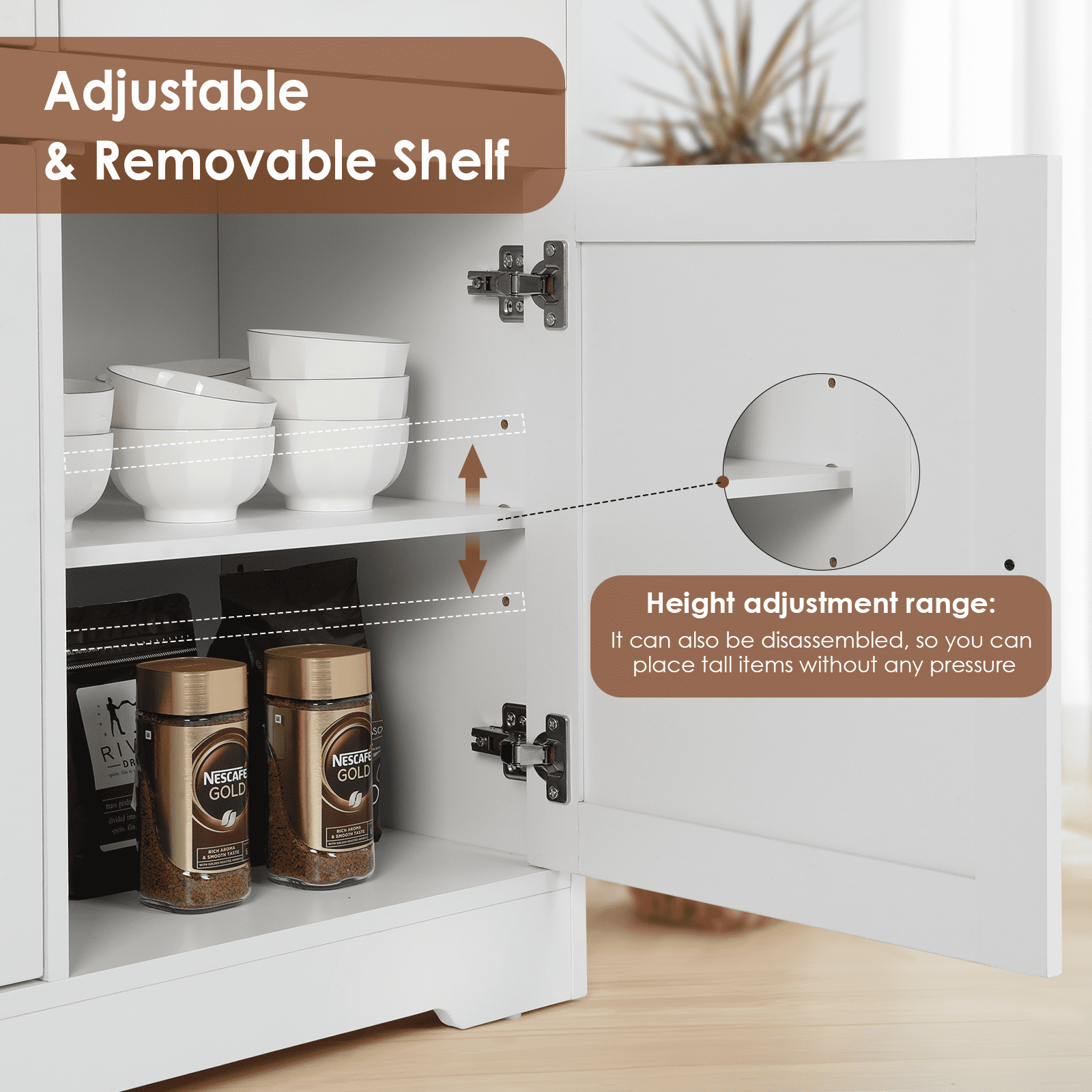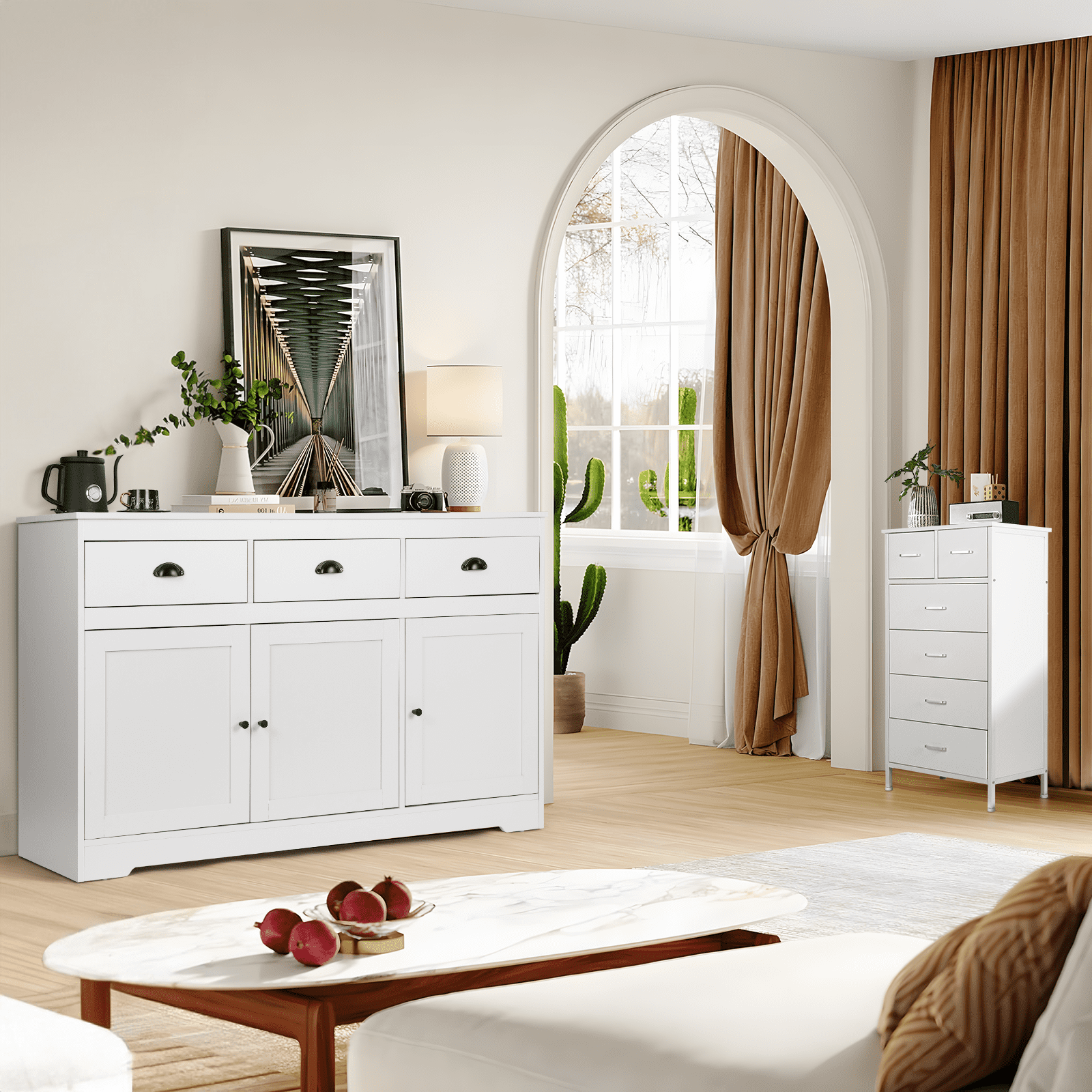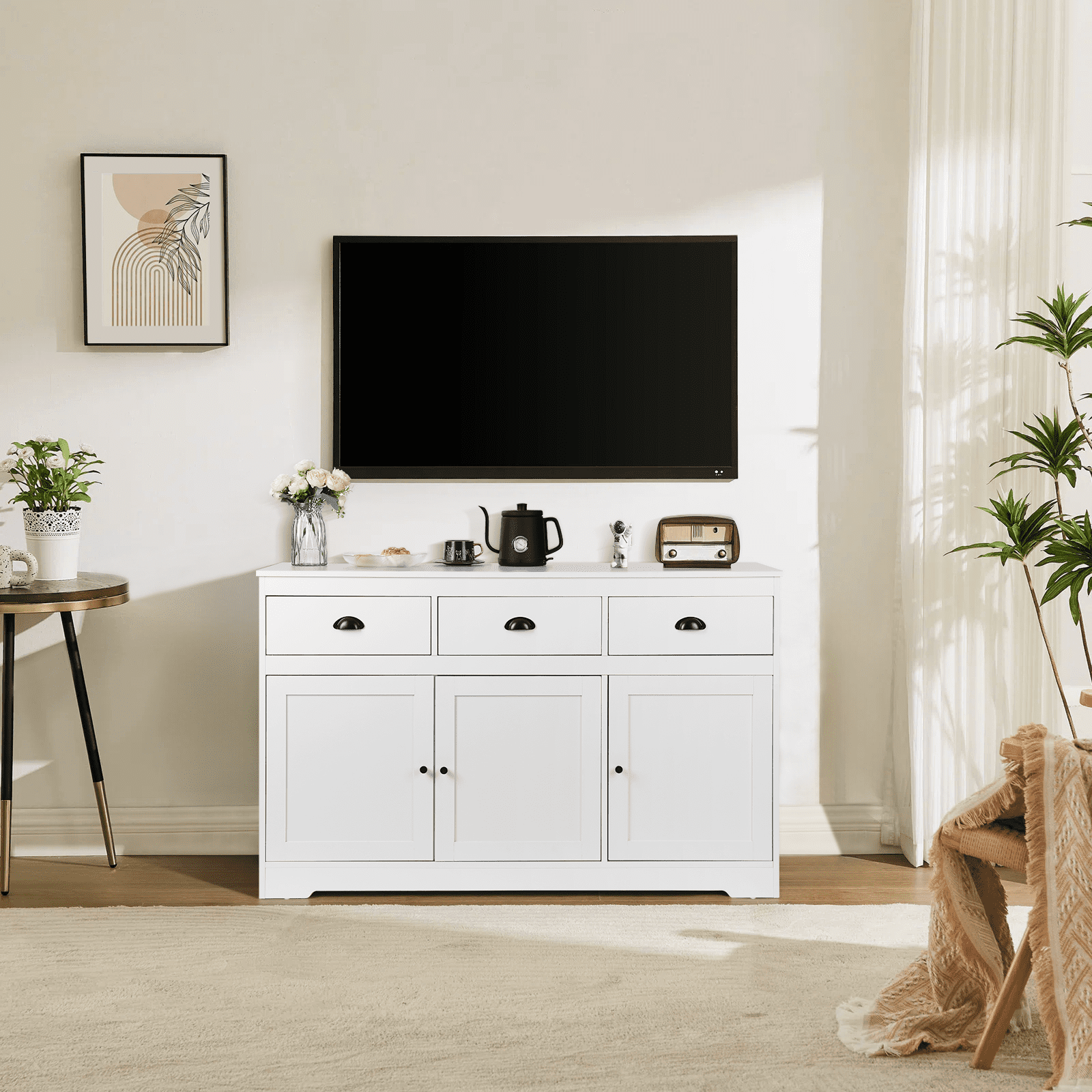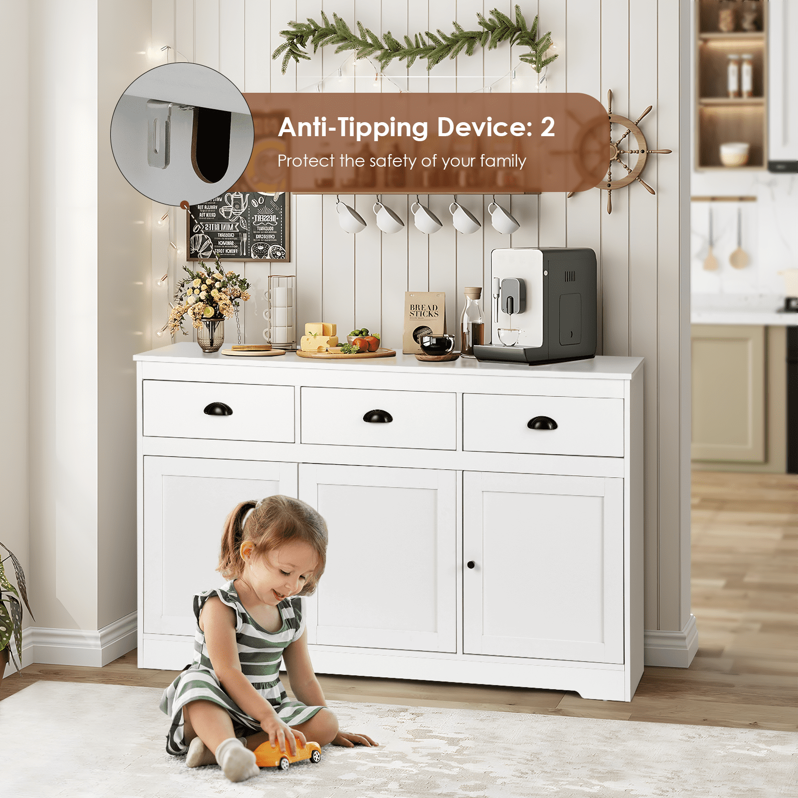 【Sturdy Stable Sideboard】The top surface of our sideboard can support up to 300lbs, each shelf can bear 33lbs.The entire cabinet structure is designed to be unique and stable, with support structures in both vertical and horizontal directions, so it will not sway. Made of high quanlity MDF mateiral, the sideboard buffet storage cabinet will not easy to deform after years of use. 【“ALL-PURPOSE” Cabinet】Classic white suits any home style, bars, kitchens, living rooms, dining rooms or coffee bars. Top three drawers are great for coffee storage, quick access of all type of tea bags / loose tea leaves( hold up the jars). Also can put utensils, potholders, dish towels, etc. Lower cabinet shelves(Adjustable) are perfect for pantry items or appliances, like a crockpot! Bottom cabinets care very spacious you can put coconut water/ box milk /nuts and some cookies 【Large Storage Buffet Cabinet】Perfect addition to your kitchen, long enough to fit the microwave and kettle. 53.6×15.8×33.9in, each drawer: ,each shelf(Adjustable): , 3 drawers on top and 3 cabinet doors on the bottom. Provide large storage space that can hold some wine bottles, seasoning cans, cutlery, food, pots and pan,etc, maximized your storage space keeps your kitchen and dining room clean and tidy. 【Exquisite details】Since the drawers of the sideboard need to be used frequently, we choose bottom rails, which are strong and have good load-bearing capacity. Damping hinges are used in the door frame, relying on a brand-new technology to adapt to the closing speed of the door. Even if the door is closed with force, it will close gently, ensuring perfect and quiet movement. 【Fully Edge-Sealed Design, Prenvent Moisture Waterproof, Reduced Smell】PVC edge banding, wear-resistant, high strength and hardness, using PUR edge banding technology, not easy to fall off, stable, odorless. Environmentally friendly, passed CARB certification and complied with California law formaldehyde standards for composite 【Easy Assembly】 Our sideboard cabinet comes with clear step-by-step instructions and numbered parts, the page is also has 3D video, the details of the assembly process have been discussed by the team many times and the steps have been simplified greatly. Feel free to contact the service team if you have any issues or concerns during the installation process. 【Reinforce Package,Reduce Breakage】We made 4 improvements to address the issue of sideboards cracking when they arrived.①The bursting strength of the five-layer carton is increased to 275 pounds (usually 180-200 pounds); ②The density of the surrounding filled Styrofoam is 35.3lb (usually 16.73lb); ③The component package is packaged separately in a kraft box, then placed in a carton to prevent it from running around and scratching other panels; ④The slide rails are also packed separately in the same kraft box 【No Worry】Check the goods as soon as possible after you receive them. If you have any questions, please feel free to contact us via the order number. If you have any problems during use, please contact us immediately and we will provide you with a perfect solution within 24 hours.