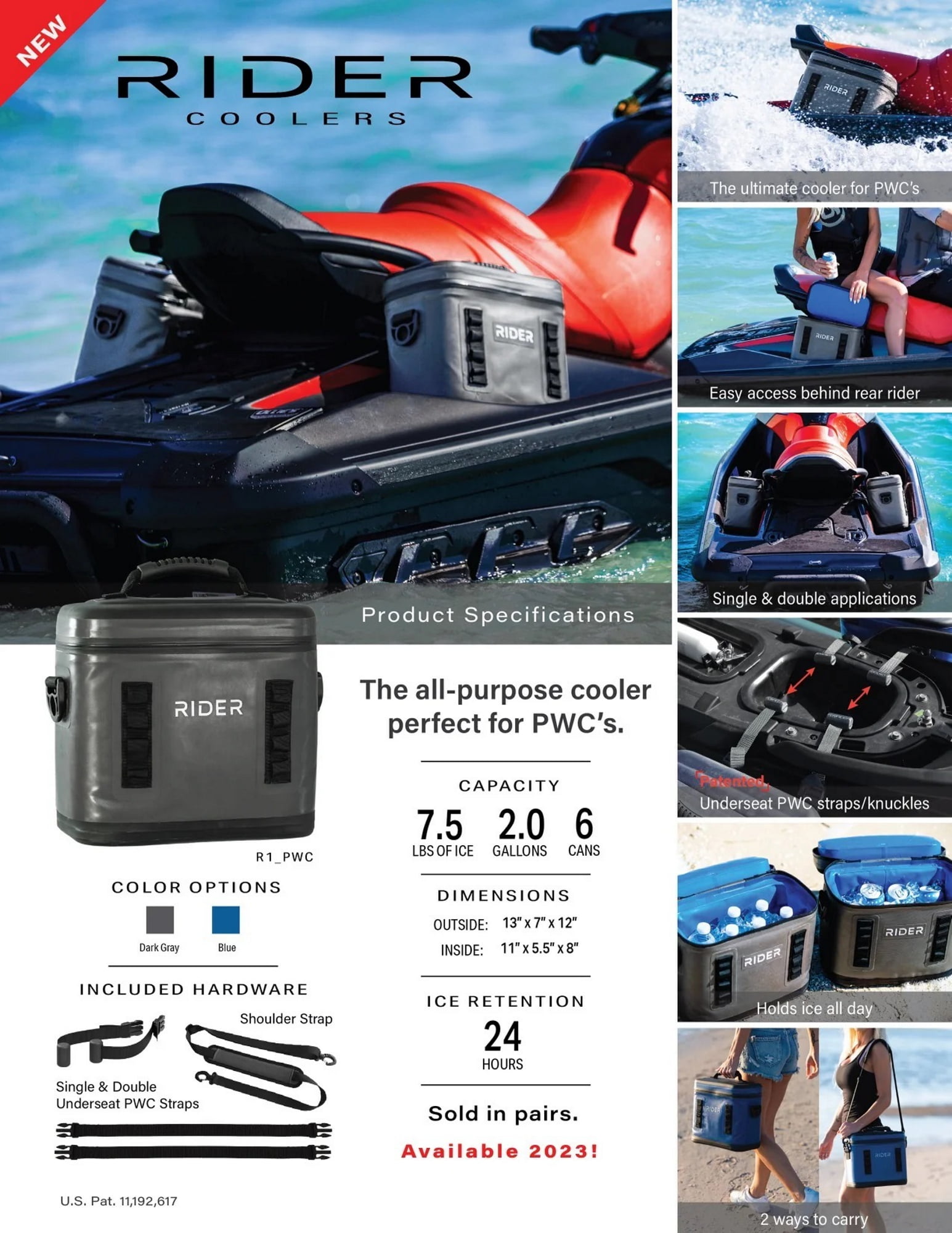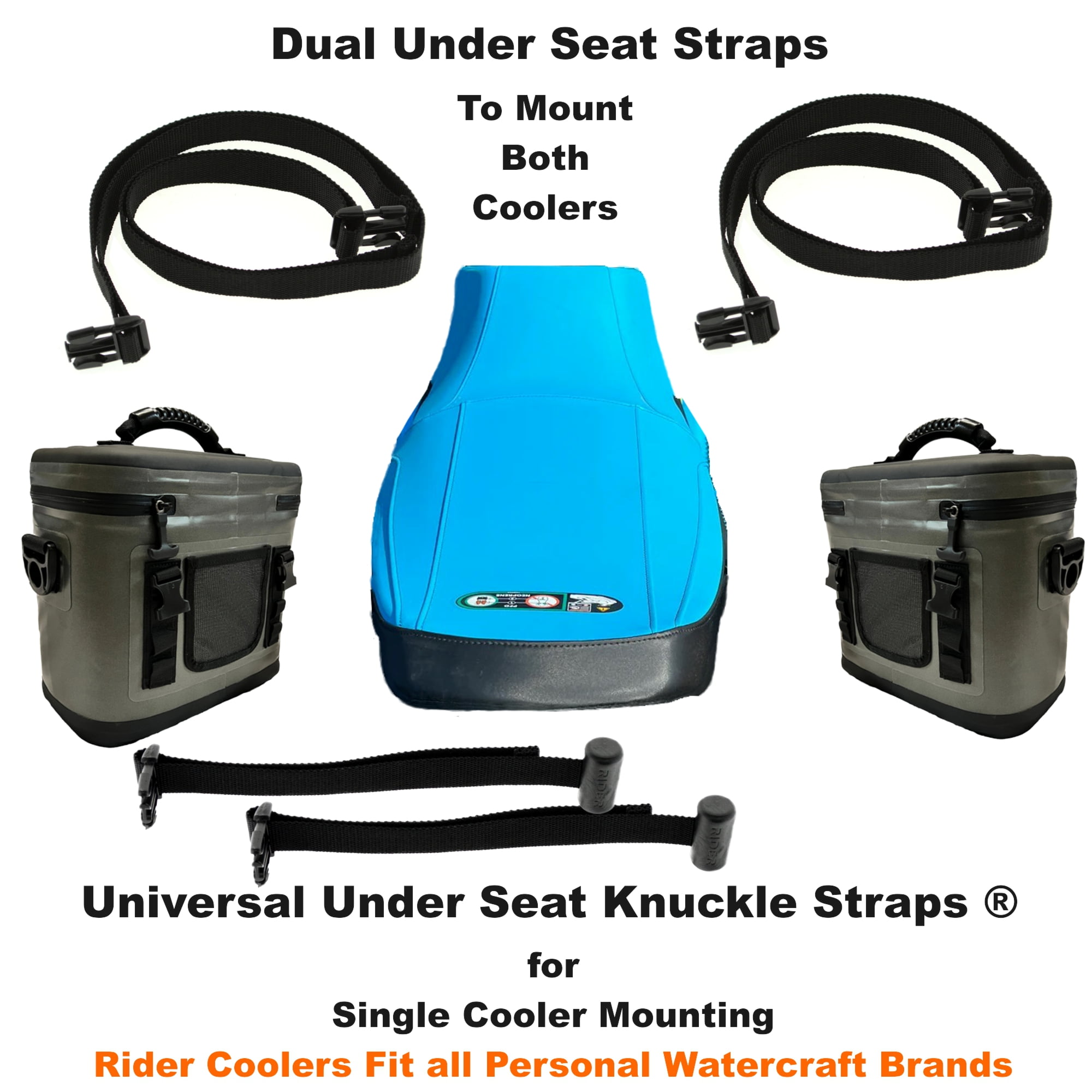 Rider coolers are the ultimate in PWC insulated ice cooling bags designed especially for Jet Ski’s, Sea Doos, and all brands of personal watercraft. The Patented® under seat straps, and straps with knuckles allow one or both coolers to be attached securely under the seat of a personal watercraft like saddlebags on a motorcycle.They are easily accessible while riding, yet stay out of the way. The ultimate in convenience ice coolers for Jet Ski riders is here! Features: * Twin Cooler bag set with special Patented® rigging for personal watercraft * Accessible by riders while riding like saddle bags Fits virtually all personal watercraft, jet ski, sea-doo, kawasaki etc. * Mount and attach both bags with adjustable under seat straps or attach one or both with special Patented® knuckle straps * Super Insulated water tight, stain resistant, soft inner lining for 24+ Hours of cooling * Use both bags for ice cooler or one as watertight protective carrier for electronics and other gear * Durable outer material is made to last a lifetime, available in two colors * Watertight zippers with large top grab handle Each bag has sturdy adjustable shoulder straps for hands free off vehicle carrying * Cell phone / accessory pocket, and accessory hang loops (front and back) Specifications: * Cooler external size: 13 in x 12 in x 7in * Cooler internal size: 11 in x 5.5 in x 8 in * Capacity of each cooler: 2 Gallons 7.5 lbs of Ice / 6 Cans What’s Included: * 2x PWC Coolers (Same Color) * 4x Under seat connector straps for twin mounting * 4x Knuckle straps for twin or single mounting