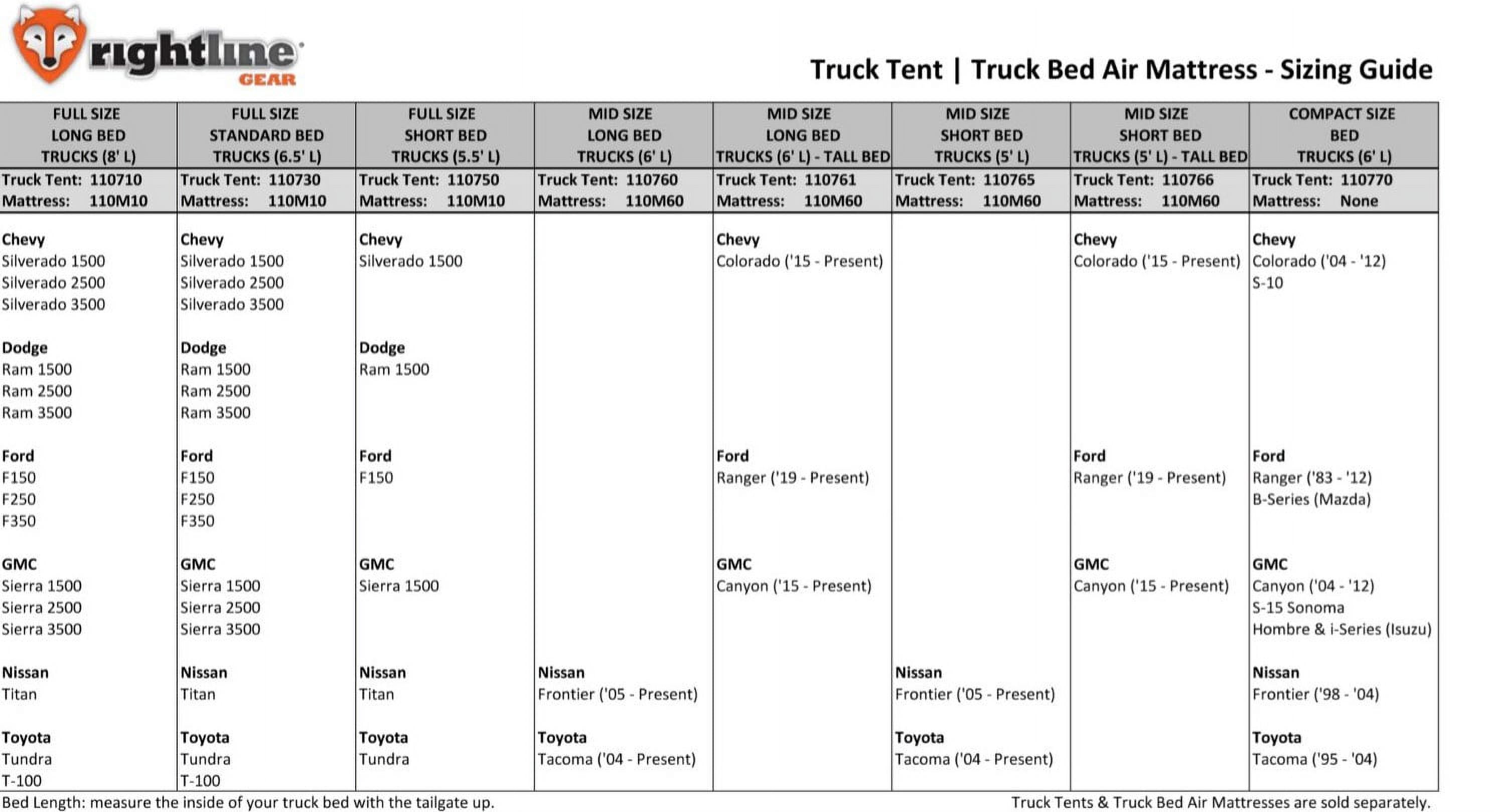 Floorless design allows for set up without removing gear from the bed Protective heavy duty straps and nylon buckles, won’t damage truck’s finish Color coded poles and pole pockets for quick and easy set up Water resistant fabric with tape sealed seams(PU 2000mm) Sky view vent for more light, ventilation, and sleeping under the stars All truck tents sleep (2) adults Includes: tent, rainfly, and stuff sack with sewn-in set up guide
