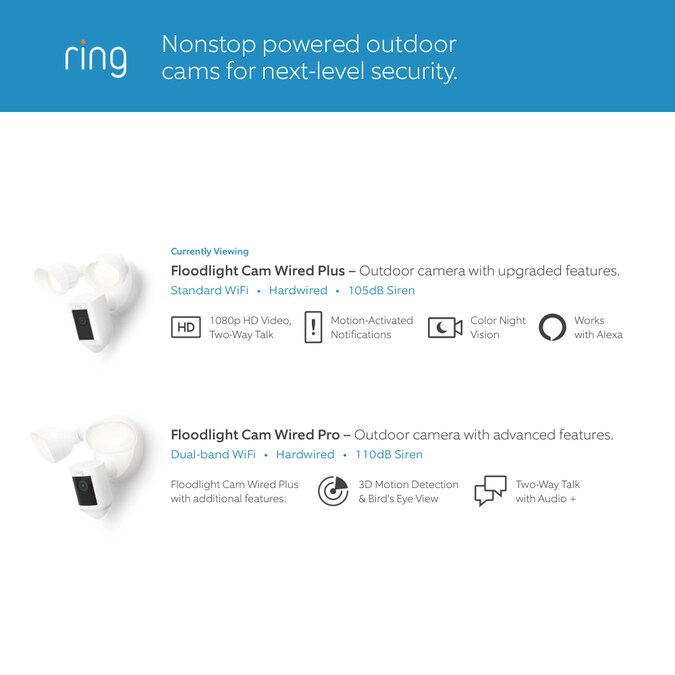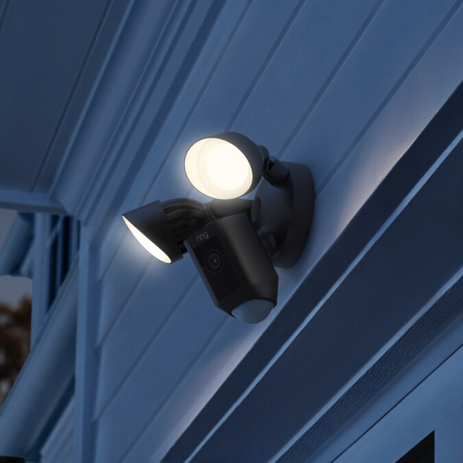 The next generation of our bestselling Floodlight Cam. Protect large outdoor areas like the driveway, garage or backyard with motion-activated LED floodlights, 1080p HD video, and a built-in security siren. Customize the motion zones to monitor specific areas and get real-time notifications when motion is detected. Use the Ring App to see what’s happening, turn on the lights, speak to visitors, and even sound the siren when you need to. It also comes with a free 30-day trial of Ring Protect Plus, so you can review, save and share all your Ring videos at anytime, with anyone.