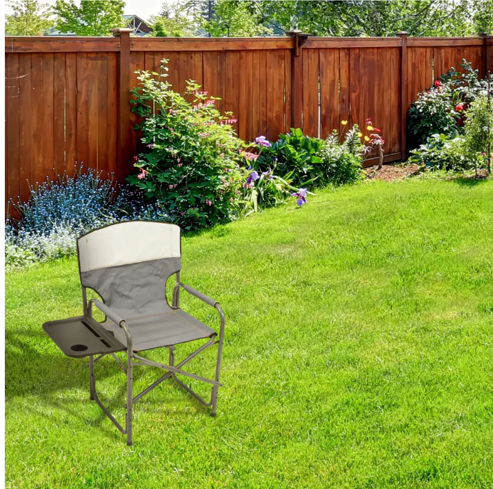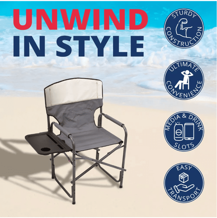 DIRECTOR’S CHAIR: Meticulously designed XXL director’s chair that can cater to your ultimate comfort and convenience WEIGHT CAPACITY: Engineered to support an impressive weight capacity of up to 400 pounds to ensure it can comfortably accommodate individuals of various sizes ESSENTIAL STORAGE: Comes with a convenient fold-out table that provides a dedicated space for your snacks, tablet, or other essentials; Includes thoughtfully integrated media and drink slots, offering easy access to your devices and beverages