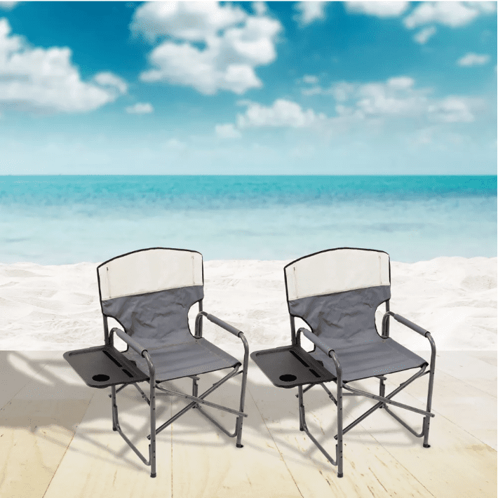 RIO Brands XXL Oversized Powder Coated Steel Frame Foldable Director’s Chair with Fold Out Side Table, Media and Drink Slots, and Carry Straps, Gray