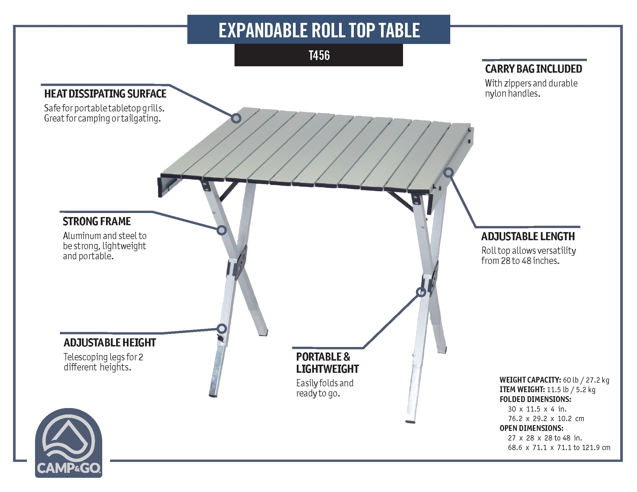 RIO Expandable Roll Top Camping Table with Zippered Carry Bag, Gray Compact design with adjustable sizes from 28 x 27 inches to 48 x 27 inches Telescoping aluminum frame for easy setup and stability Roll-top style tabletop made of heat-dissipating aluminum Push-pin adjusters allow for height adjustment to accommodate camp or standard height chairs Features the Close-It Hold-It™ Strap System for secure transport Telescoping table leg adjusts to uneven ground for added convenience Includes a zippered carry bag with handles for easy transport and storage Perfect for camping, RV’ing, and tailgating