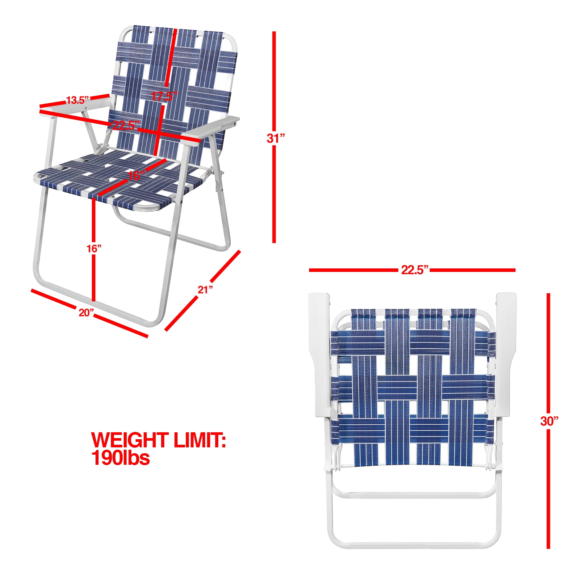 RIO BRANDS LLC blu web fold chair 6 pack: You’ll want to take a seat when you try out this convenient folding chair from Rio! Key product features: White powder-coated steel frame supports weights up to 190 pounds The blue woven webbing is breathable, discouraging sweat from forming White plastic arms are at the perfect height for comfort Great for the beach and outdoor sporting events The compact size fits well in storage compartments and vehicle trunks This classic folding chair uses polypropylene webbing for the seating and backrest, creating a durable and comfortable seat The blue and white color scheme will fit in with almost any of your current decor Great for camping, beach trips, and backyard use!