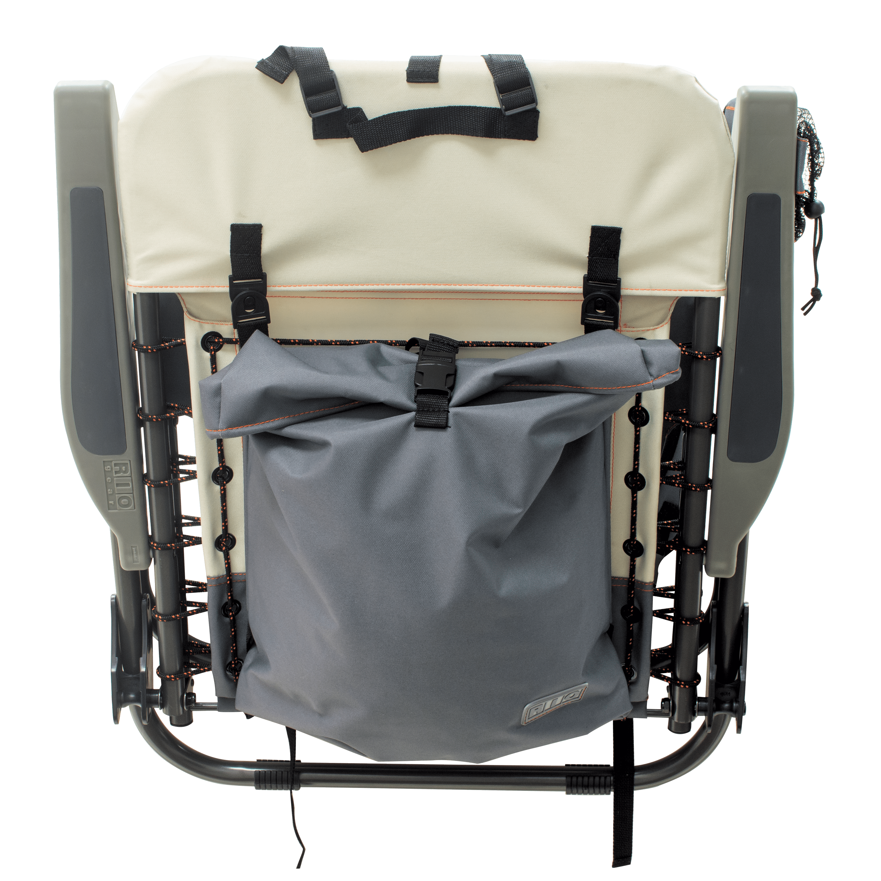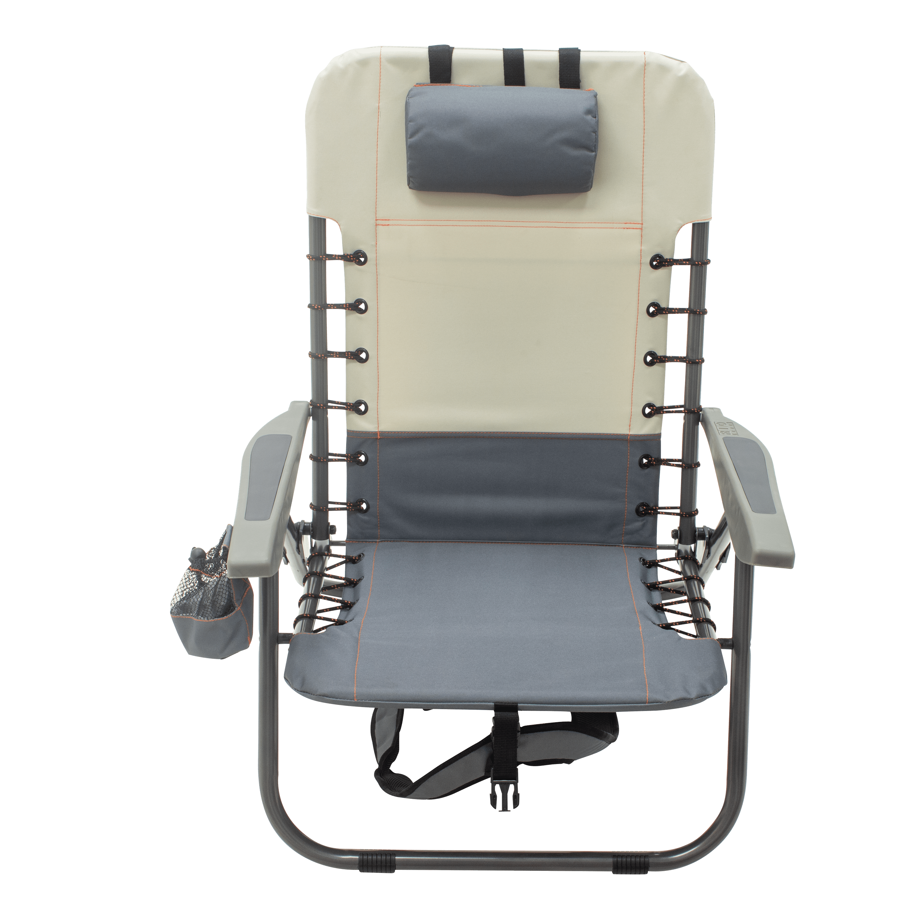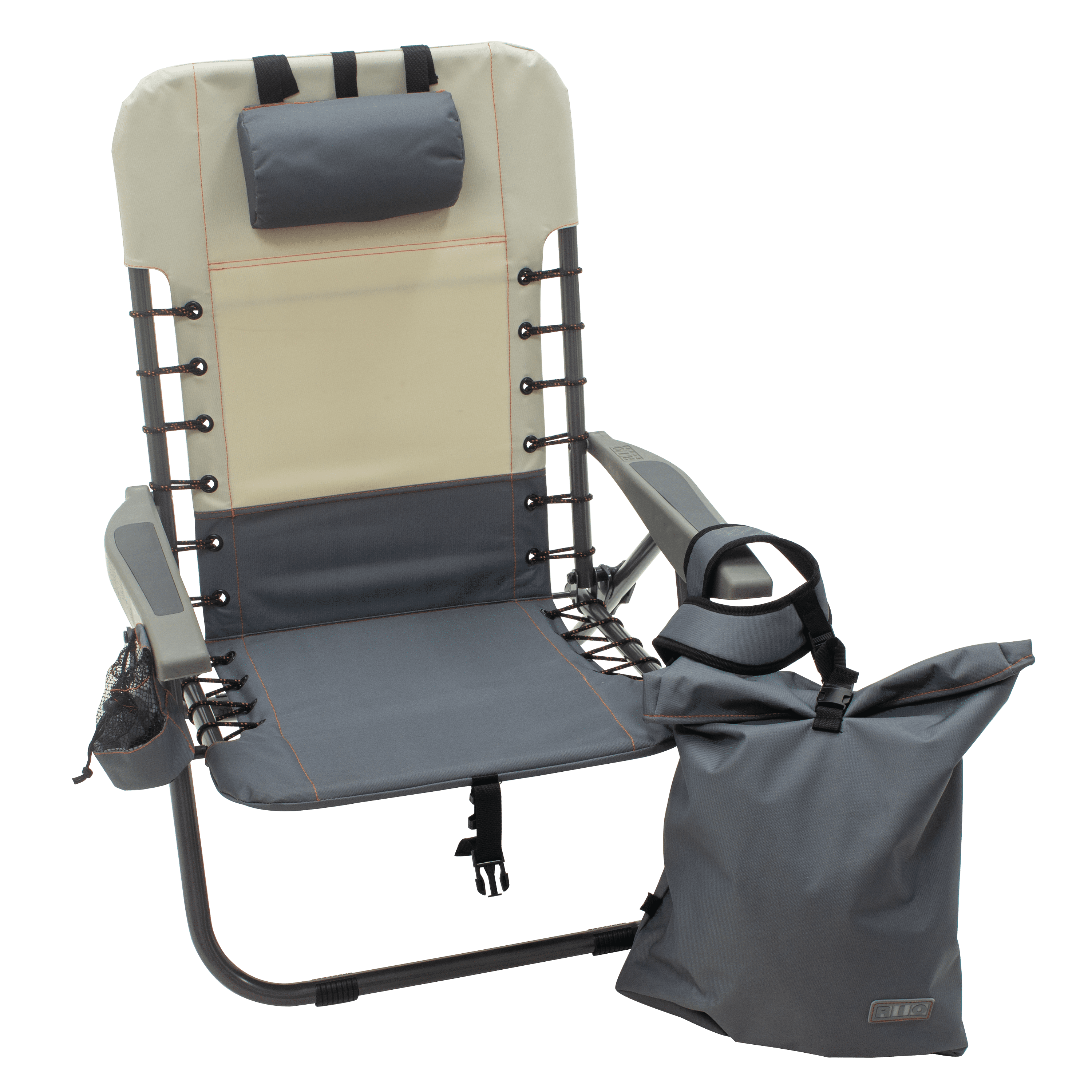 New Rio Gear 4-Position Lace-up Suspension Backpack 11″ Camping Chair in Slate/Putty Have a comfortable seat outdoors with a compact, portable Lace-Up Removable Backpack Chair. This stylish backpack chair is built for strength and convenience. You can wear it like a backpack: It has adjustable padded straps and a large, removable backpack for carrying your gear. The lace-up suspension on this backpack chair provides style and comfort, and a large adjustable foam pillow provides extra support when you’re on the go. There’s also a built-in cup holder attached to one of the comfortable molded arms. The powder coated steel frame resists rust and scratches. Features Dark powder coated steel frame with lace-up suspension Pillow head rest, cup holder, and molded arms Adjustable padded backpack straps and removable backpack Weight capacity: 250 lbs.
