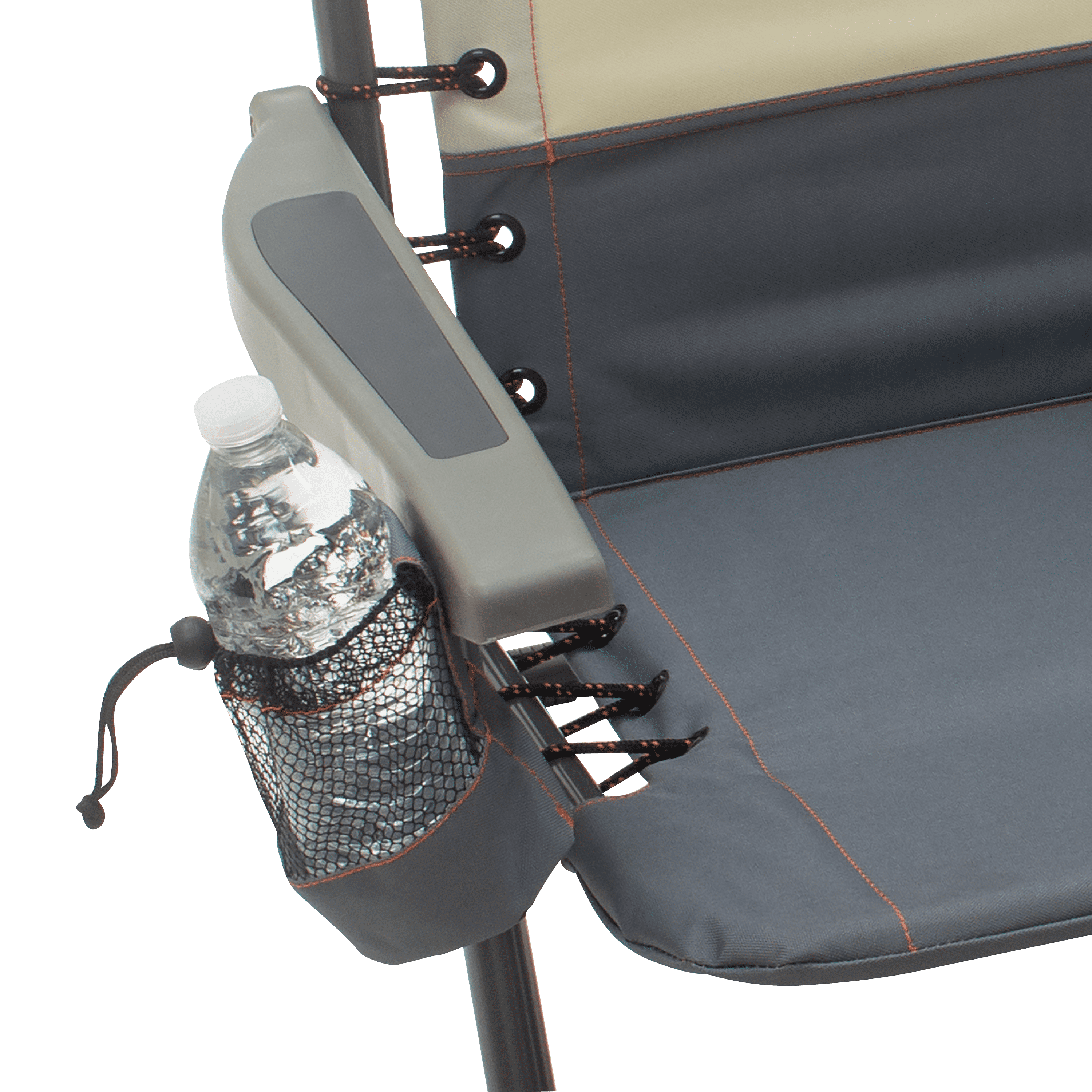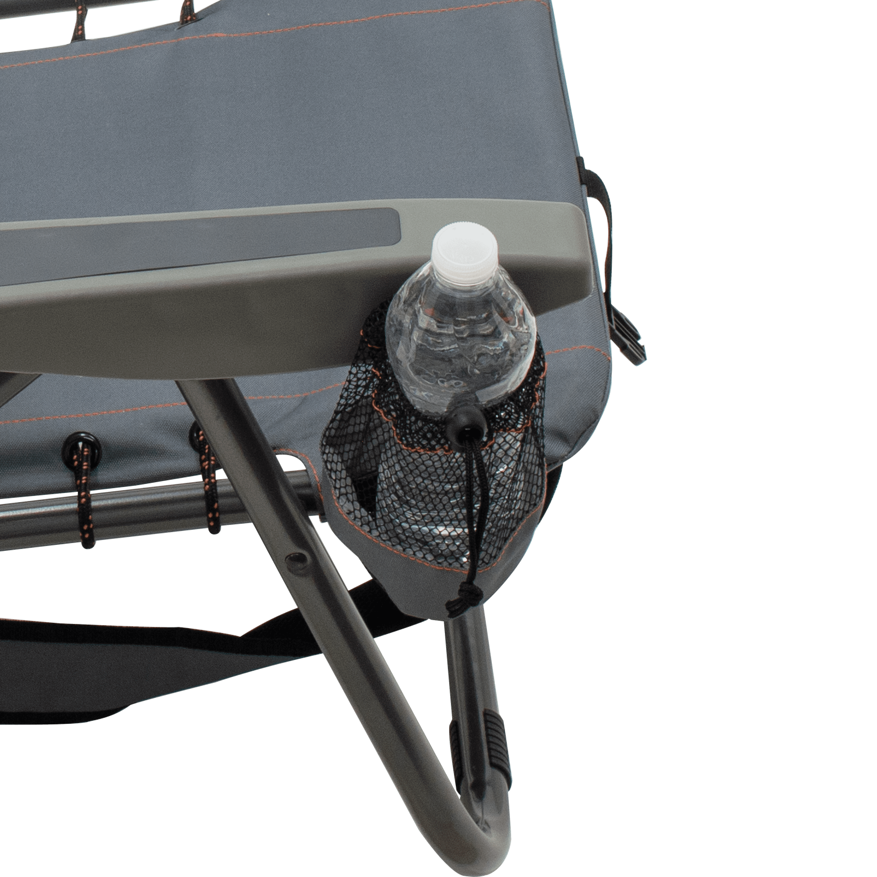 Dark powder coated steel frame with lace-up suspension Pillow head rest, cup holder, and molded arms Adjustable padded backpack straps and removable backpack Weight capacity: 250 lbs.