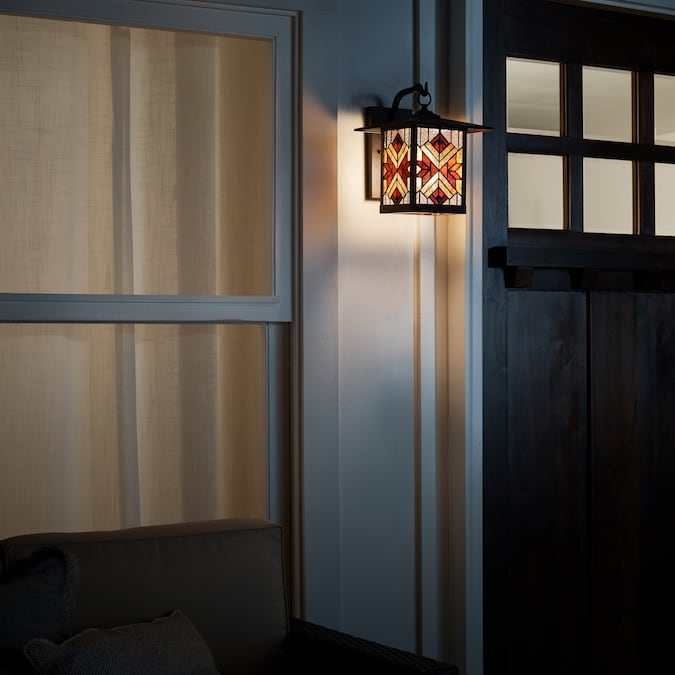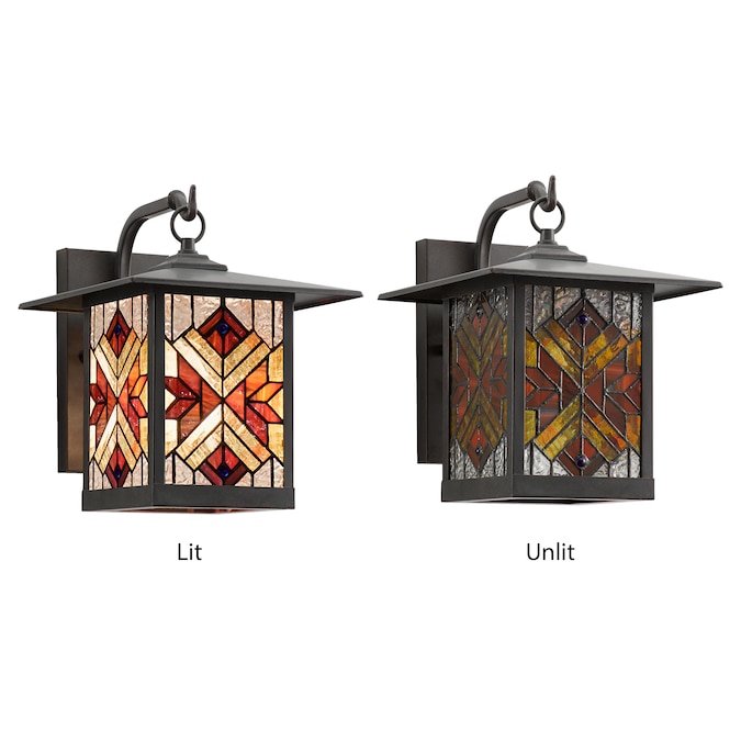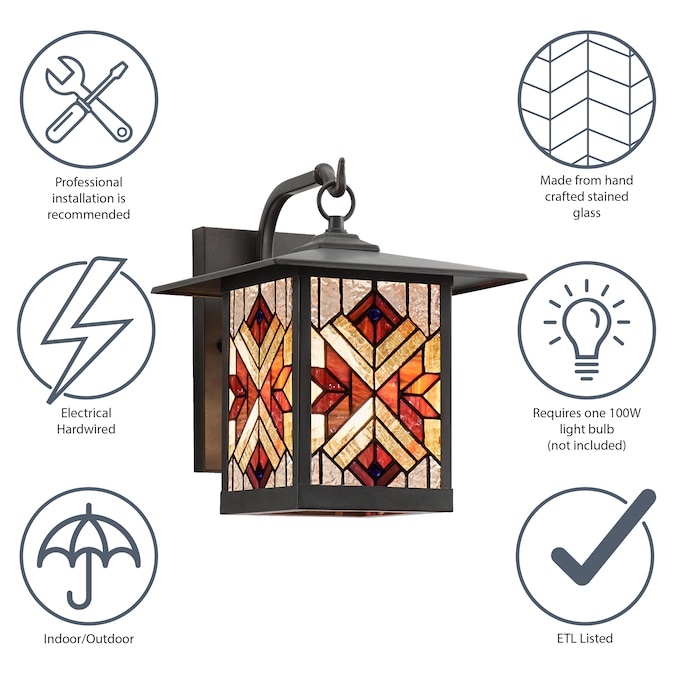 The River of Goods 11.75-in H Celeste stained glass oil rubbed bronze finish mission outdoor light fixture adds classic charm to your outdoor lighting. This weather-resistant, tiffany stained glass light fixture with oil rubbed bronze finish embodies the artisan ship of the craftsman style. The distinct patterned shade of 138 hand-cut pieces of clear, red and yellow colored glass and metal canopy provide welcoming and safe illumination. Ideal for your porch, patio, deck, garage and home entryway, the light shines downward, and the open bottom allows easy access for bulb replacement.