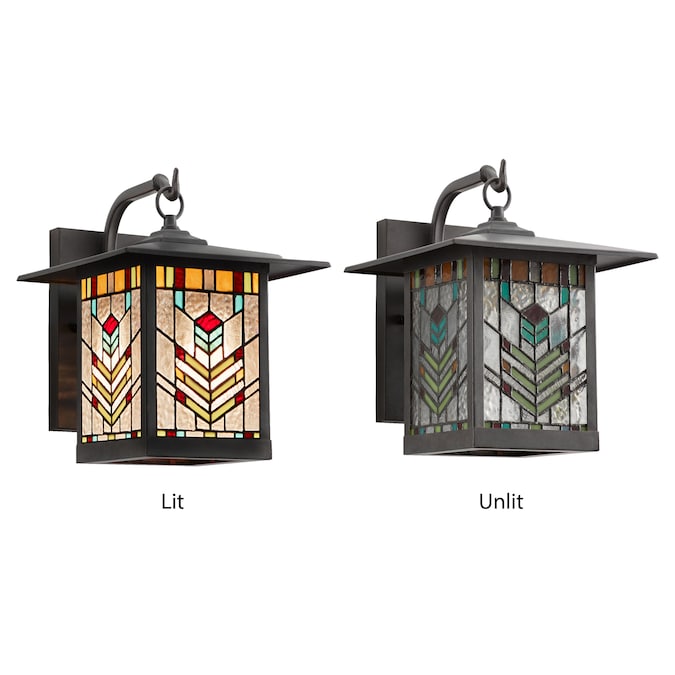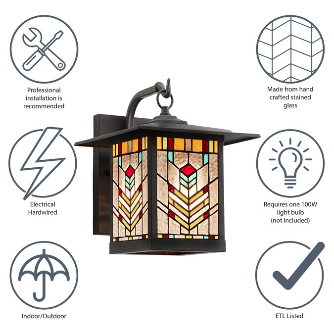 The River of Goods 11.75-in H Astrid stained glass oil rubbed bronze finish mission outdoor light fixture adds classic charm to your outdoor lighting. This weather-resistant, tiffany stained glass light fixture with oil rubbed bronze finish embodies the artisan ship of the craftsman style. The distinct patterned shade of 183 hand-cut pieces of yellow, orange, clear, red and teal colored glass and metal canopy provide welcoming and safe illumination. Ideal for your porch, patio, deck, garage and home entryway, the light shines downward, and the open bottom allows easy access for bulb replacement.