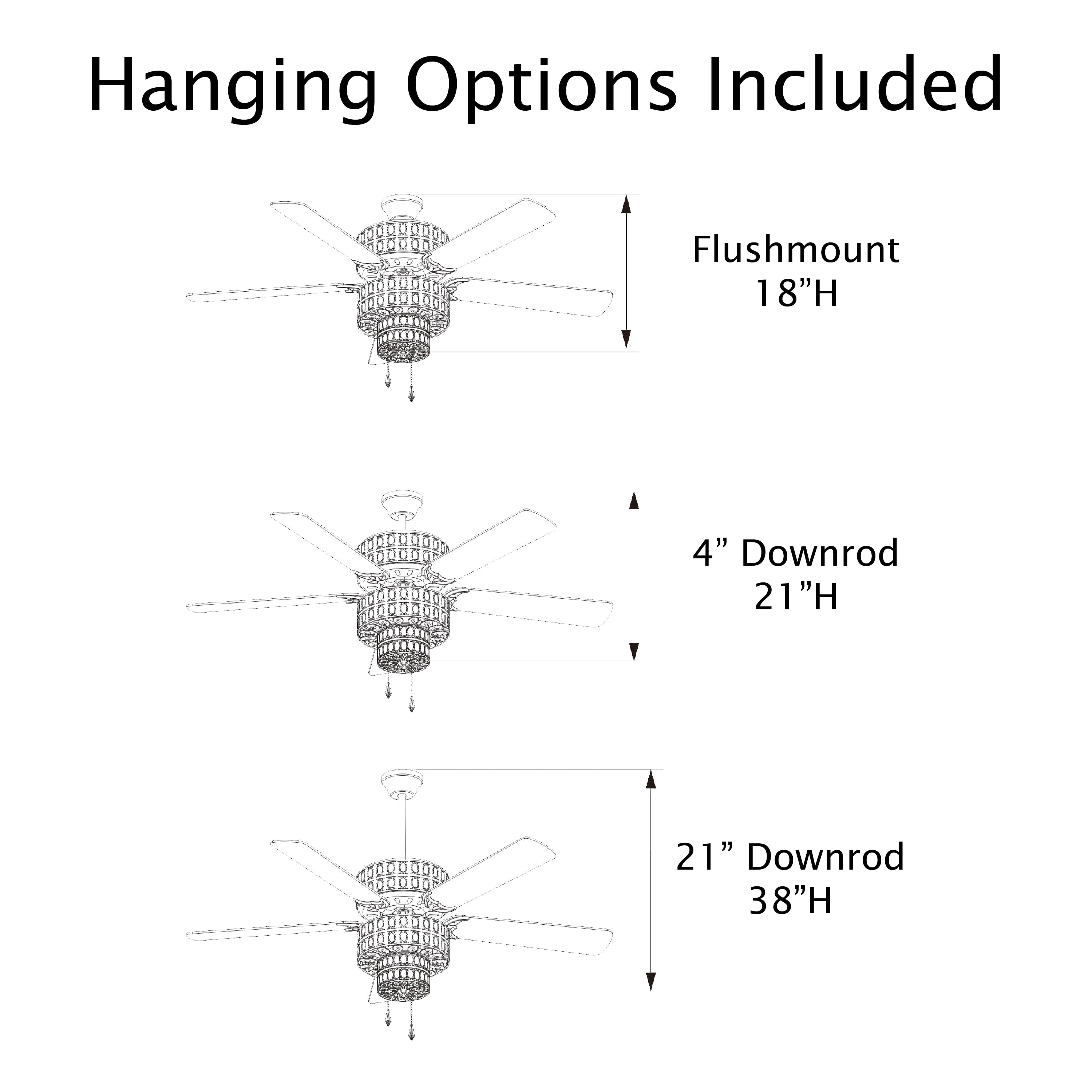 The Bohemian Pierced Metal 52 in. Clear Crystal Ceiling Fan brings design and function together in this beautifully designed lighted ceiling fan. Featuring a chrome pierced metal chandelier ceiling fan adorned with over 140 clear glass crystals; woodgrain reversible blades is black on one side while the opposite side features mahogany this fan offers a luxurious aesthetic. Three fan speeds and a reversible switch help keep you comfortable year-round. In warm weather run the fan counterclockwise to stay cool. In cold weather save money by reversing the ceiling fan direction to push warm air down. For most rooms up to 14 ft. x 14 ft. Requires two dimmable E12 LED 6W bulbs and four dimmable E12 LED 1W bulbs (included) Set flush mount or 2 optional down rods are included: 4 in. or 21 in. down rods Reversible motor control allows you to circulate cool air or heat all year round
