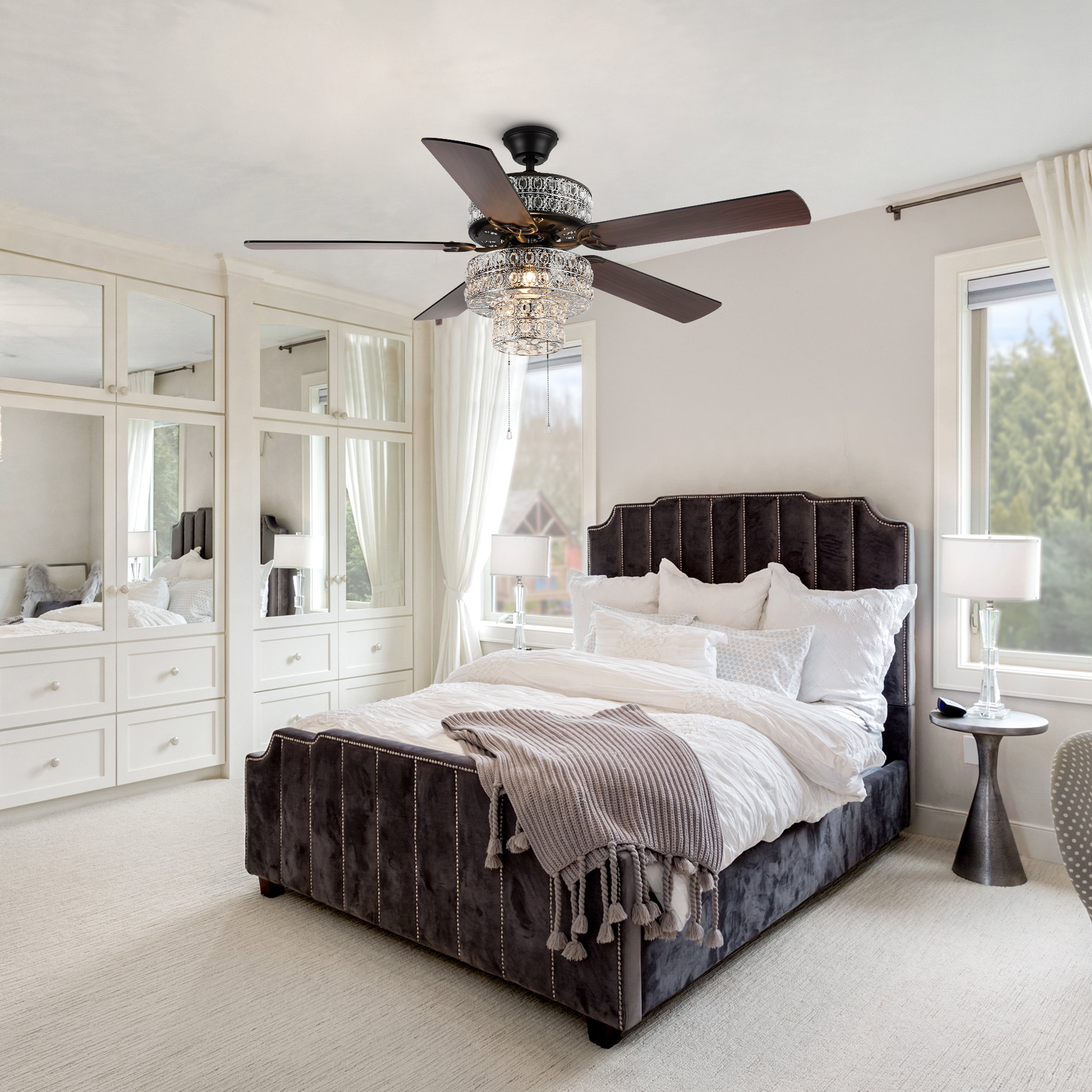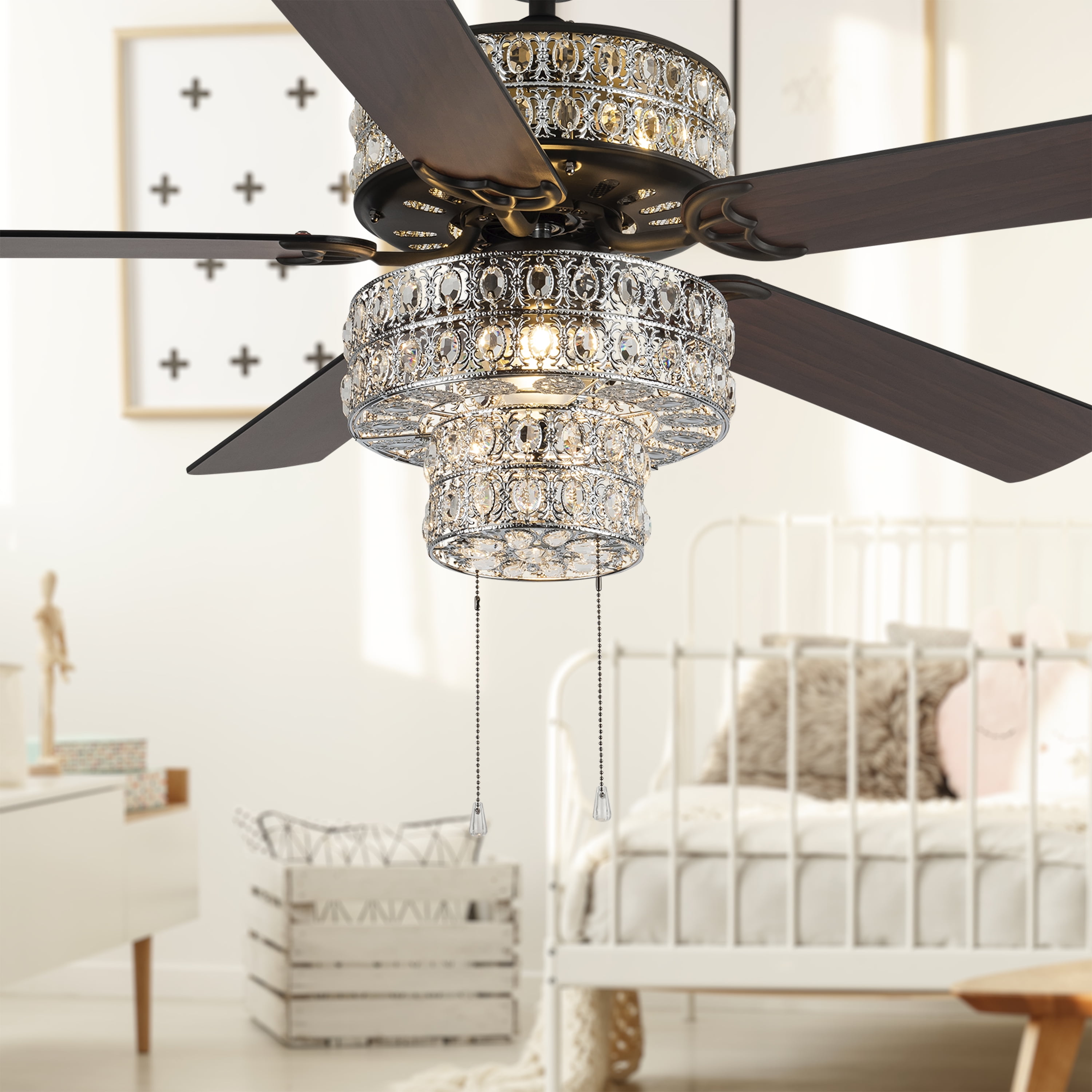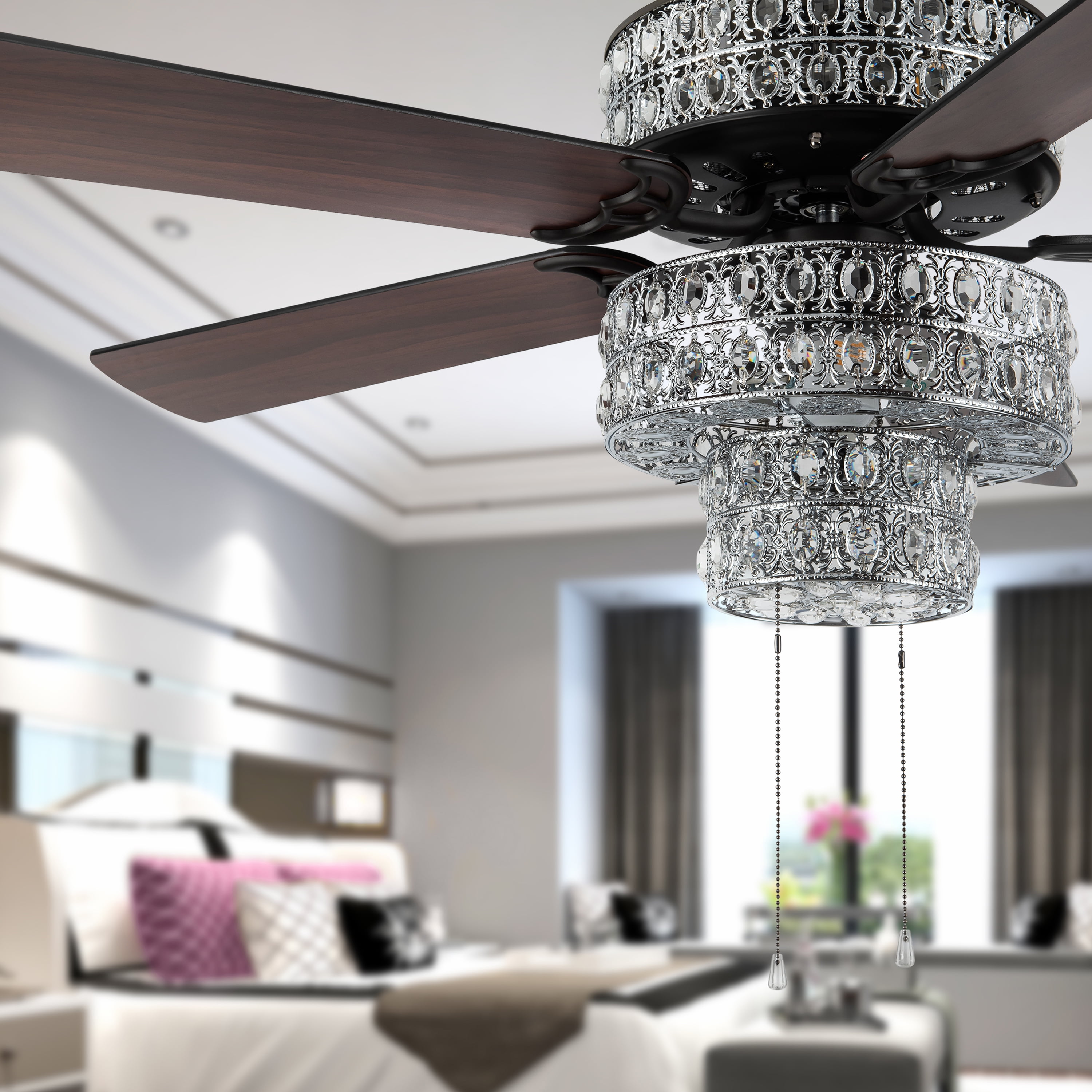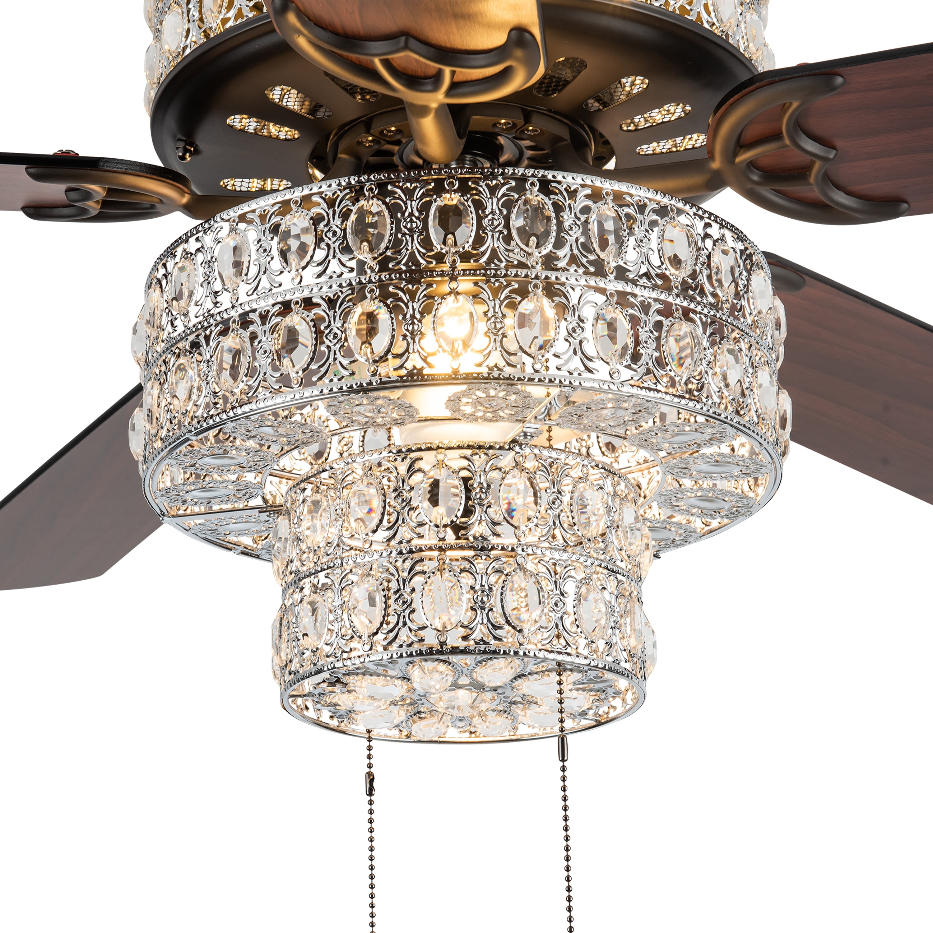 Illuminate your room in style with this punched metal and crystal River of Goods ceiling fan. Featuring a chrome pierced metal chandelier ceiling fan adorned with over 140 clear glass crystals; woodgrain reversible blades is black on one side, while the opposite side features mahogany, this fan offers a luxurious aesthetic. Three fan speeds and a reversible switch help keep you comfortable year-round. In warm weather, run the fan counterclockwise to stay cool. In cold weather save money by reversing the ceiling fan direction to push warm air down.