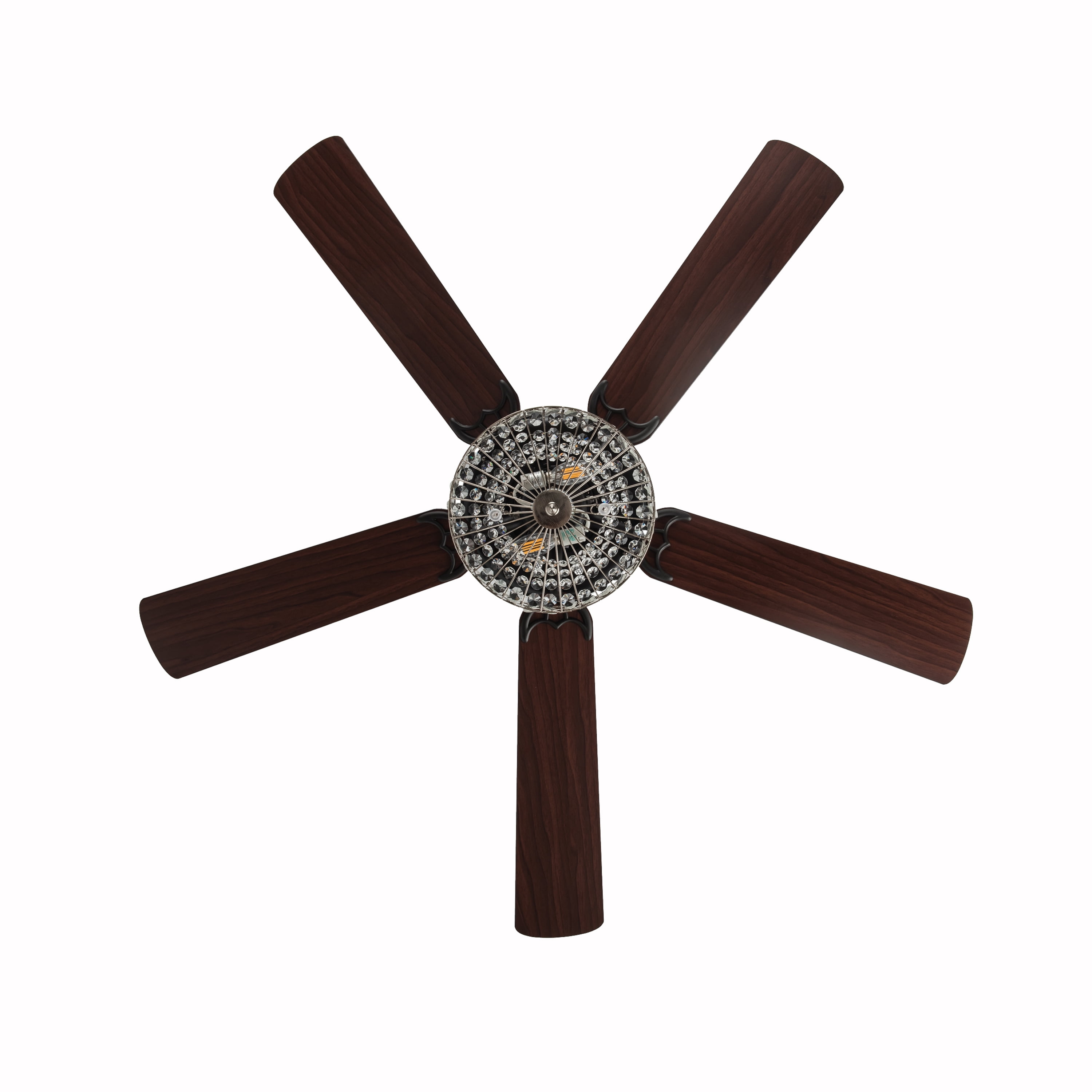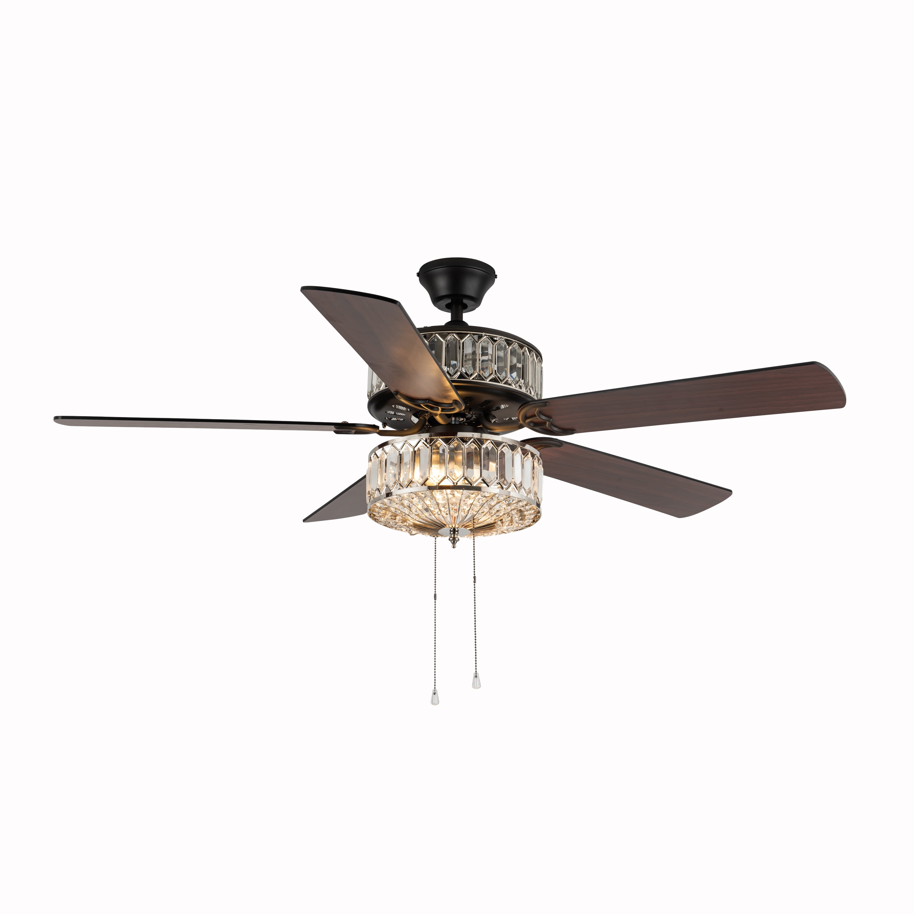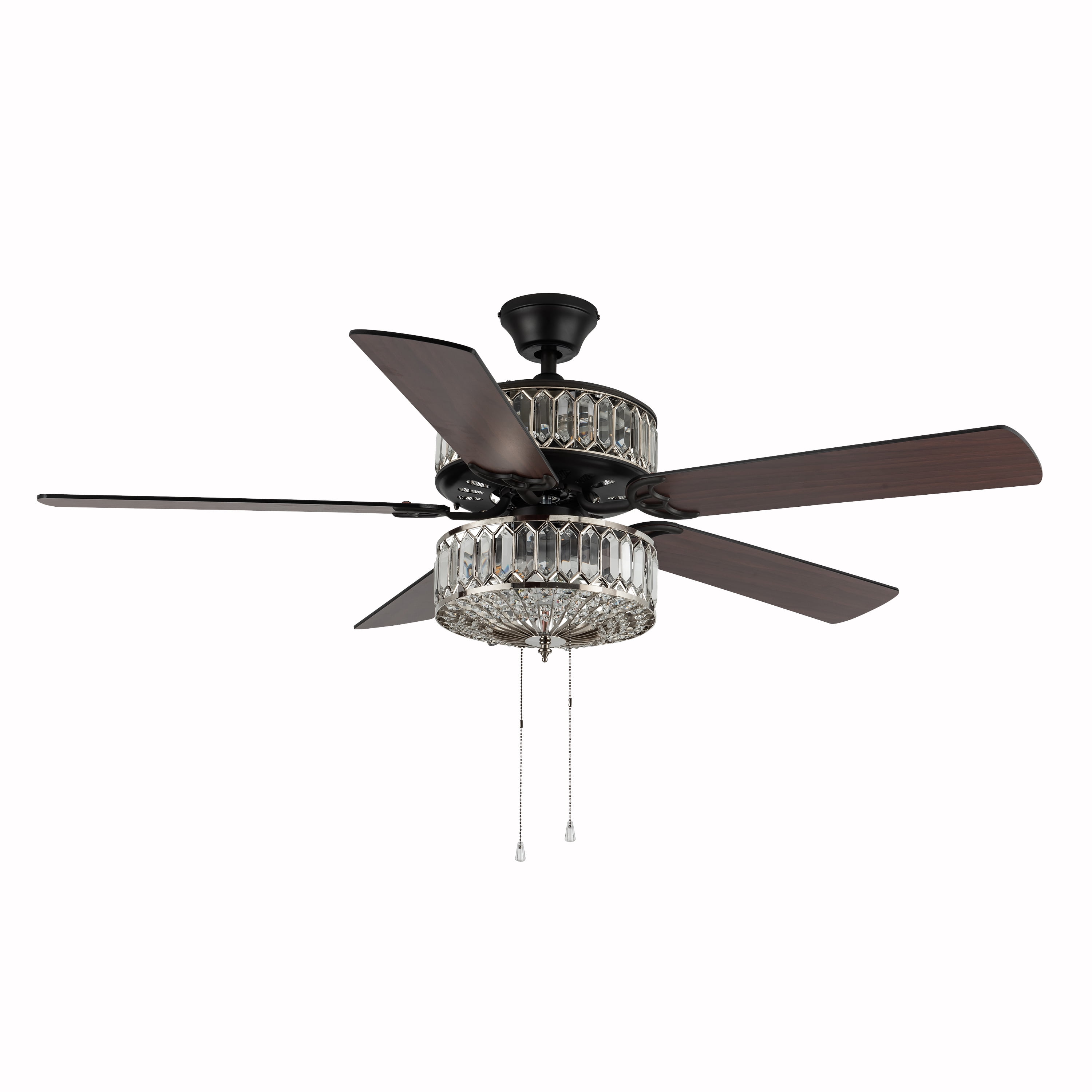 Double-layered, shiny silver and clear faceted K-9 crystals. Illuminate your room in style with this geometrically glamorous jeweled glass ceiling fan. Six lights highlight the 75 glass jewels on all tiers within the upper and lower components for the ultimate in shine and design. Five wood grain textured blades allow for maximum air movement and are reversible! One side features a traditional mahogany finish, while the opposite side features a sleek, antique black color. Pull chain switches allow for manual power off/on, light operation, and three-speed motor (reversible). A short 4″ down rod and longer 21″ down rod are included for two display options, as well as flush mount. This item must be hardwired and installed by a qualified electrician. Three fan speeds and a reversible switch help keep you comfortable year-round. In warm weather, run the fan counterclockwise to stay cool. In cold weather save money by reversing the ceiling fan direction to push warm air down.