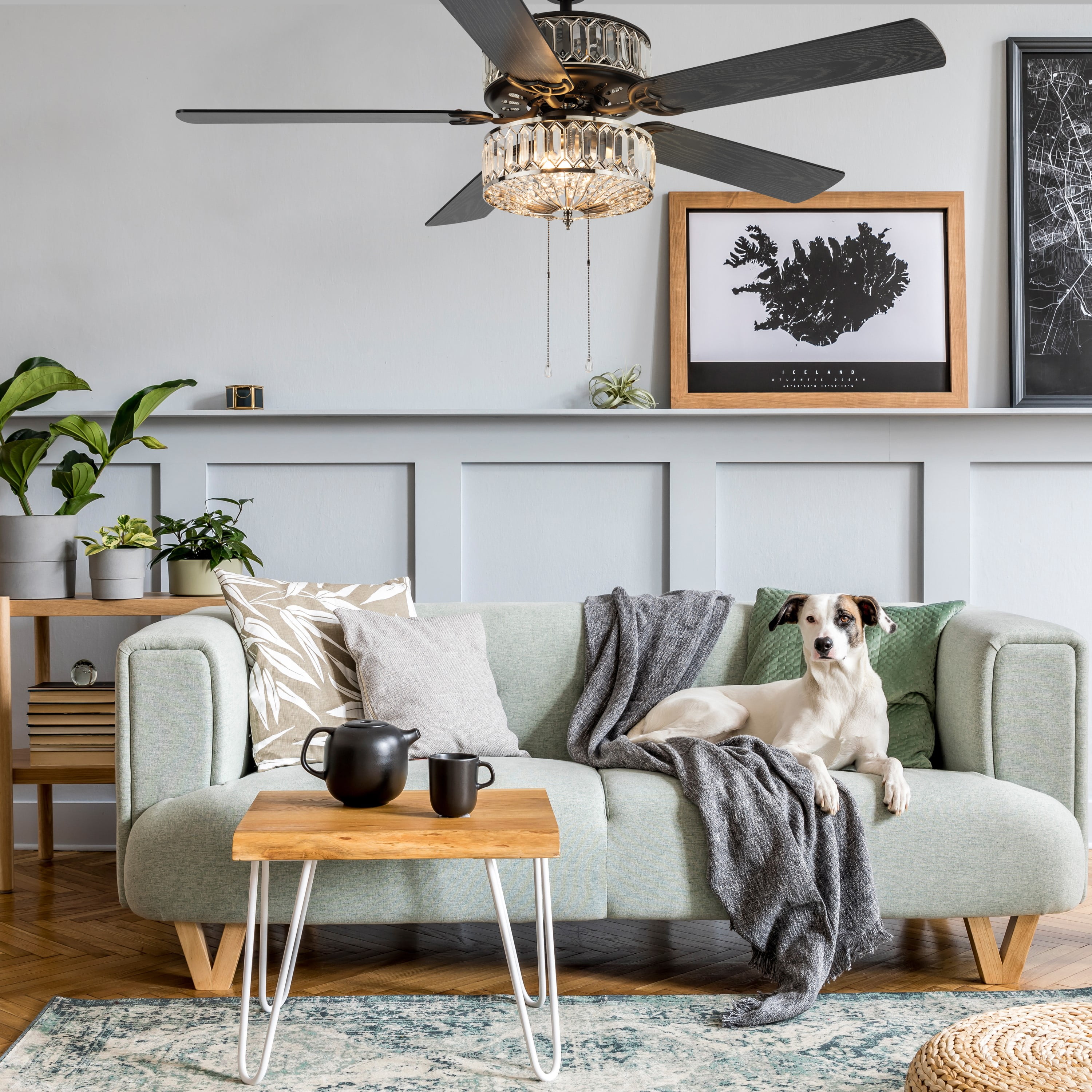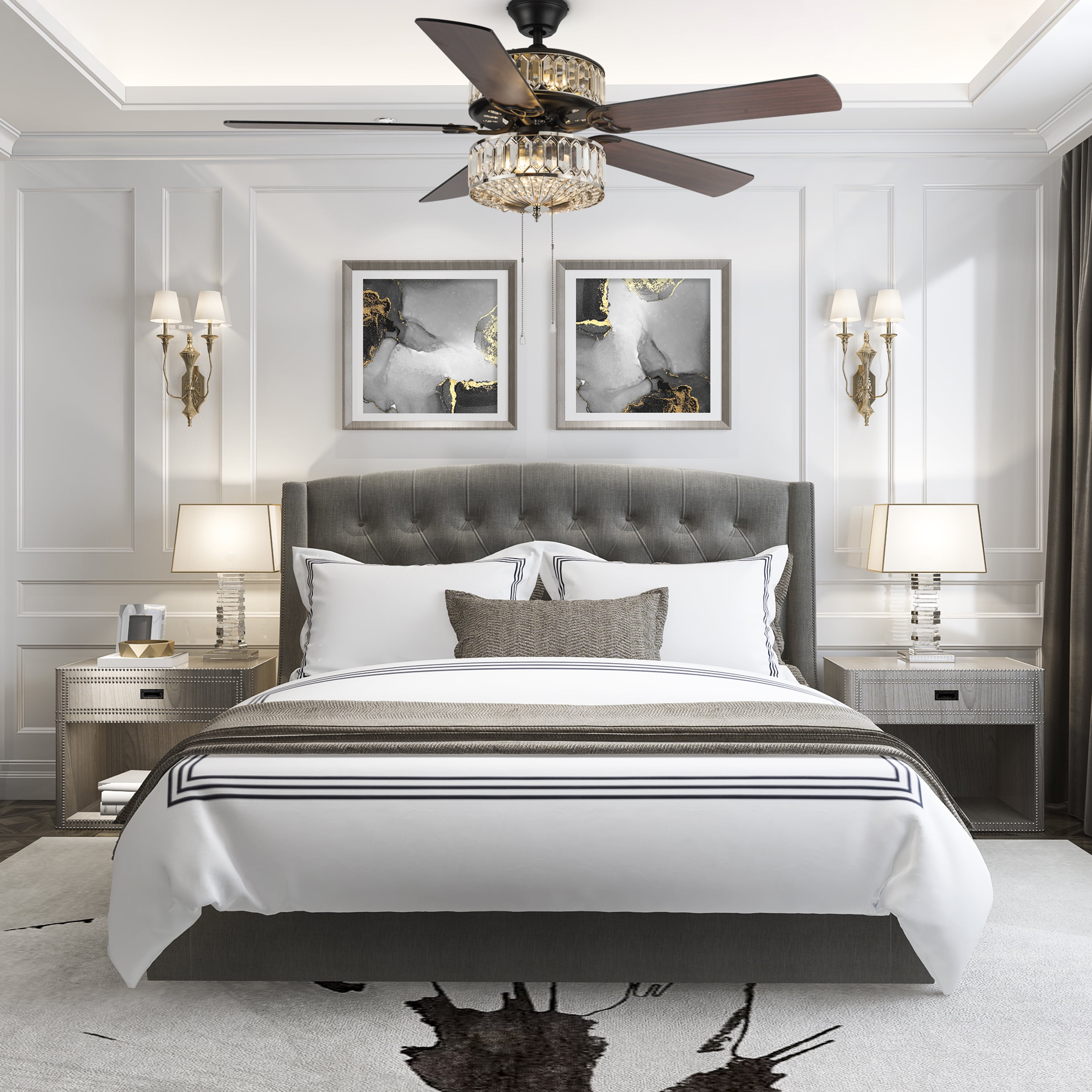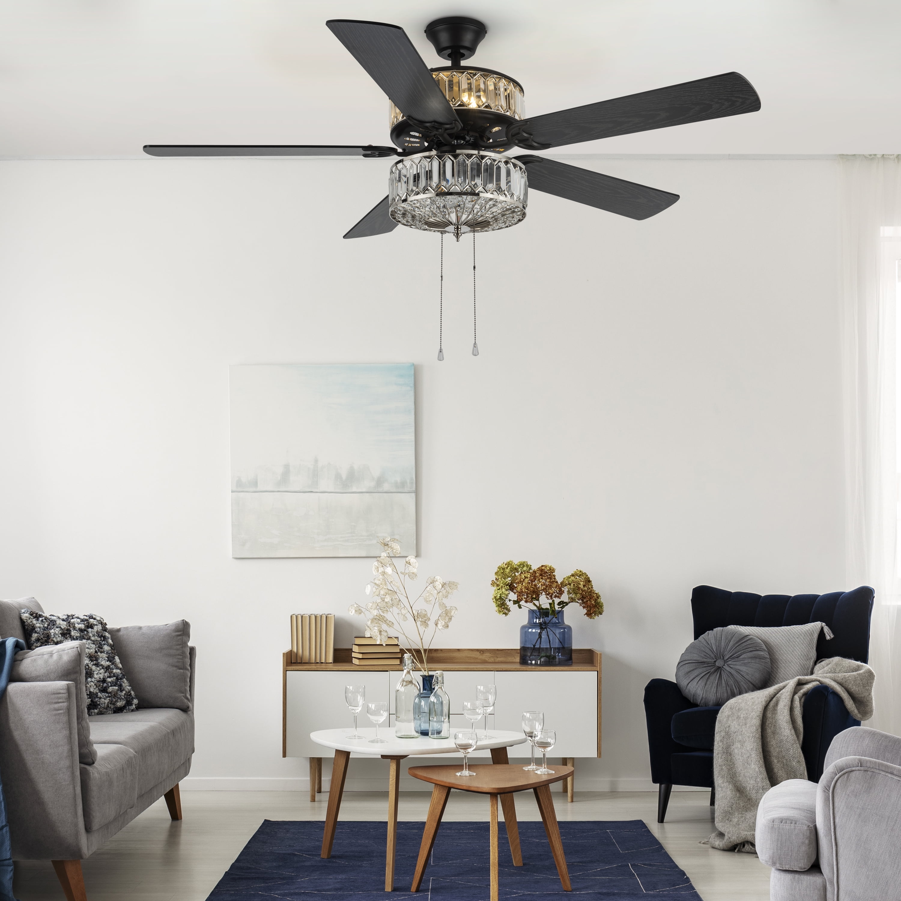 Double-layered, shiny silver and clear faceted K-9 crystals. Illuminate your room in style with this geometrically glamorous jeweled glass ceiling fan. Six lights highlight the 75 glass jewels on all tiers within the upper and lower components for the ultimate in shine and design. Five wood grain textured blades allow for maximum air movement and are reversible! One side features a traditional mahogany finish, while the opposite side features a sleek, antique black color. Pull chain switches allow for manual power off/on, light operation, and three-speed motor (reversible). A short 4″ down rod and longer 21″ down rod are included for two display options, as well as flush mount. This item must be hardwired and installed by a qualified electrician. Three fan speeds and a reversible switch help keep you comfortable year-round. In warm weather, run the fan counterclockwise to stay cool. In cold weather save money by reversing the ceiling fan direction to push warm air down.