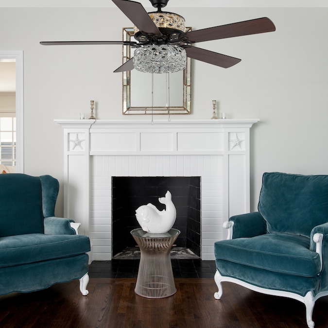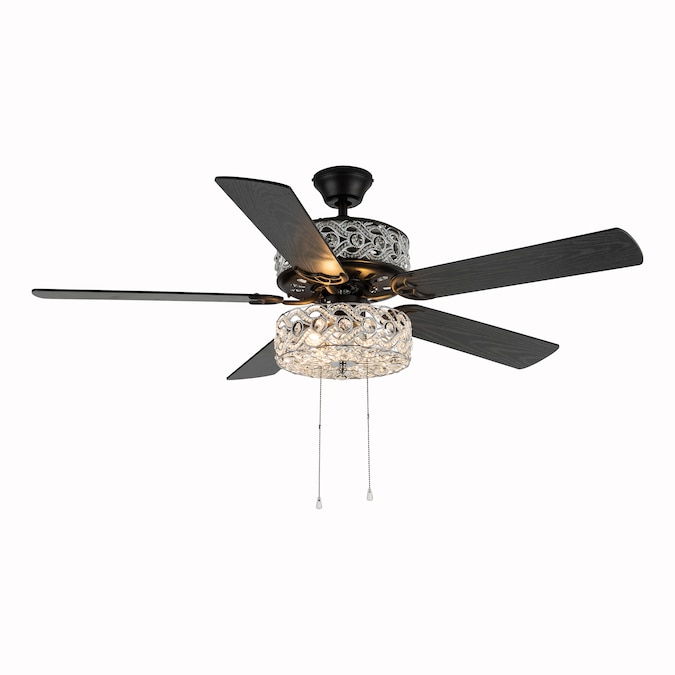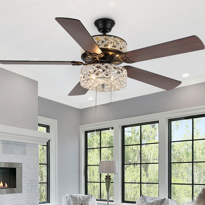 The River of Goods 52-in Olivia Double-Lit Beaded Braid Wedding Band LED Indoor Downrod Mount Ceiling Fan with Light Kit (5-Blade) is a stunning beauty combined with the modern functionality of a lighted ceiling fan. Featuring an elegant satin nickel tiered chandelier designed with woven clear faceted K-9 crystals for soft illumination; reversible wood blades in a soft grey/black with grey woodgrain color finish. Three fan speeds and a reversible switch help keep you comfortable year-round. In warm weather, run the fan counterclockwise to stay cool. In cold weather save money by reversing the ceiling fan direction to push warm air down.