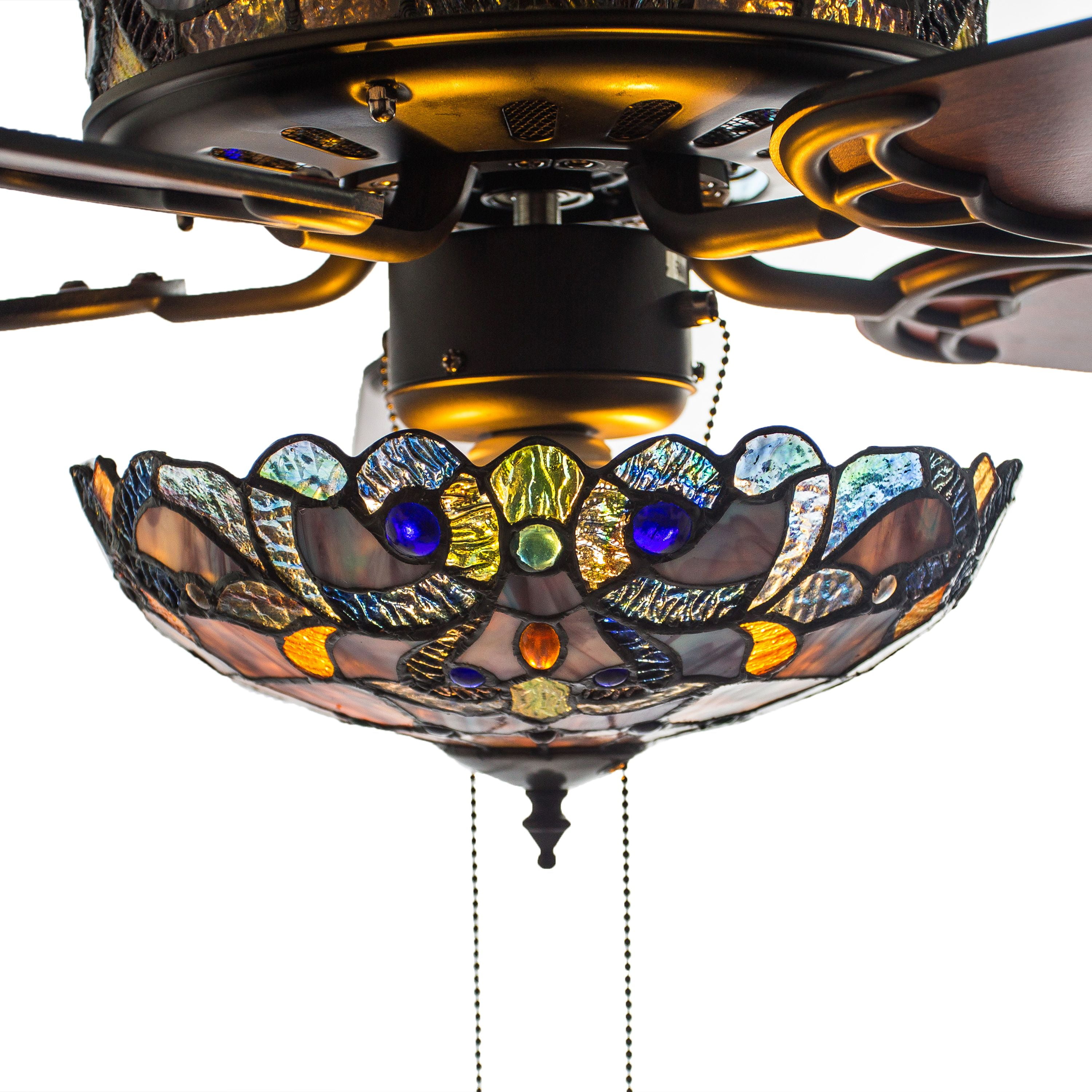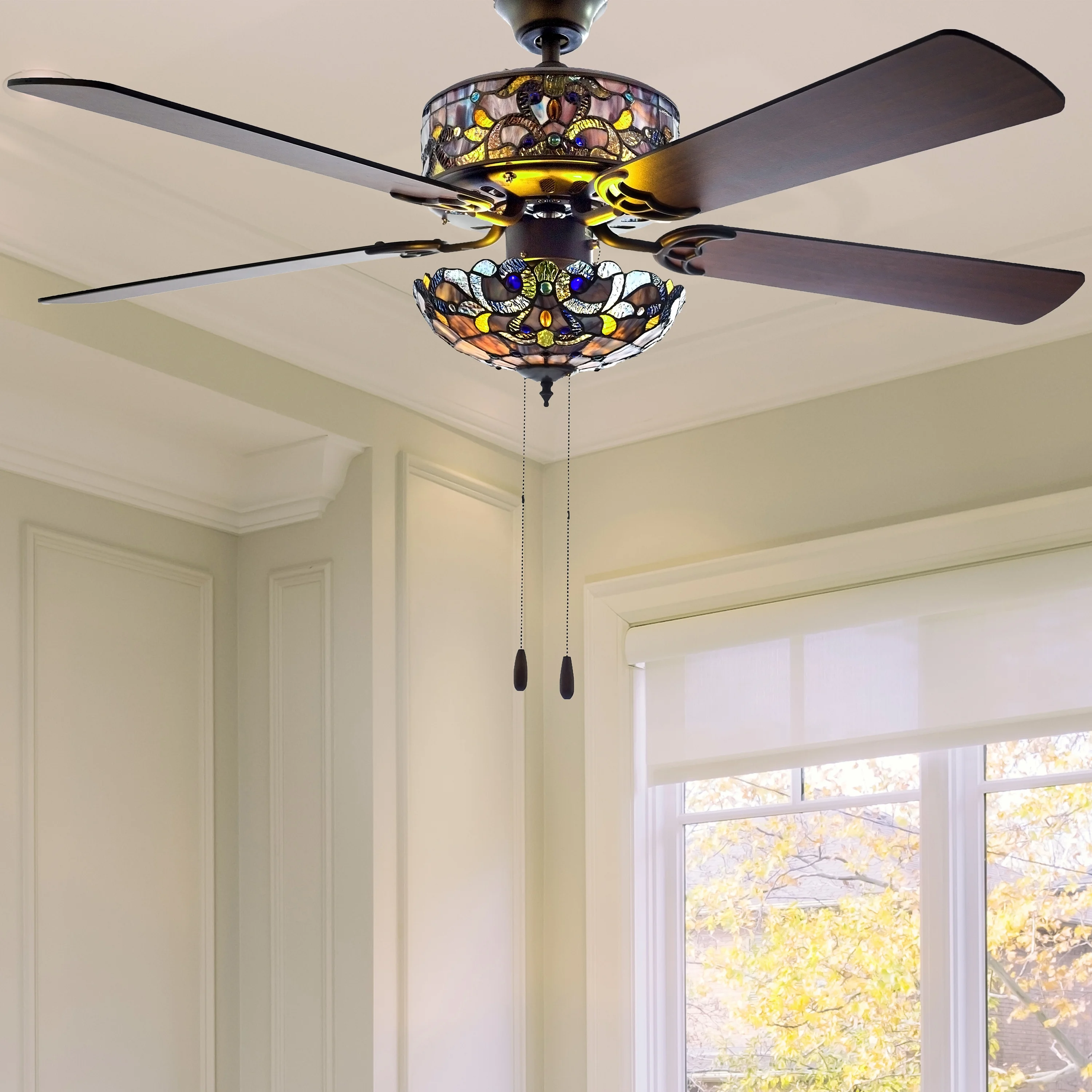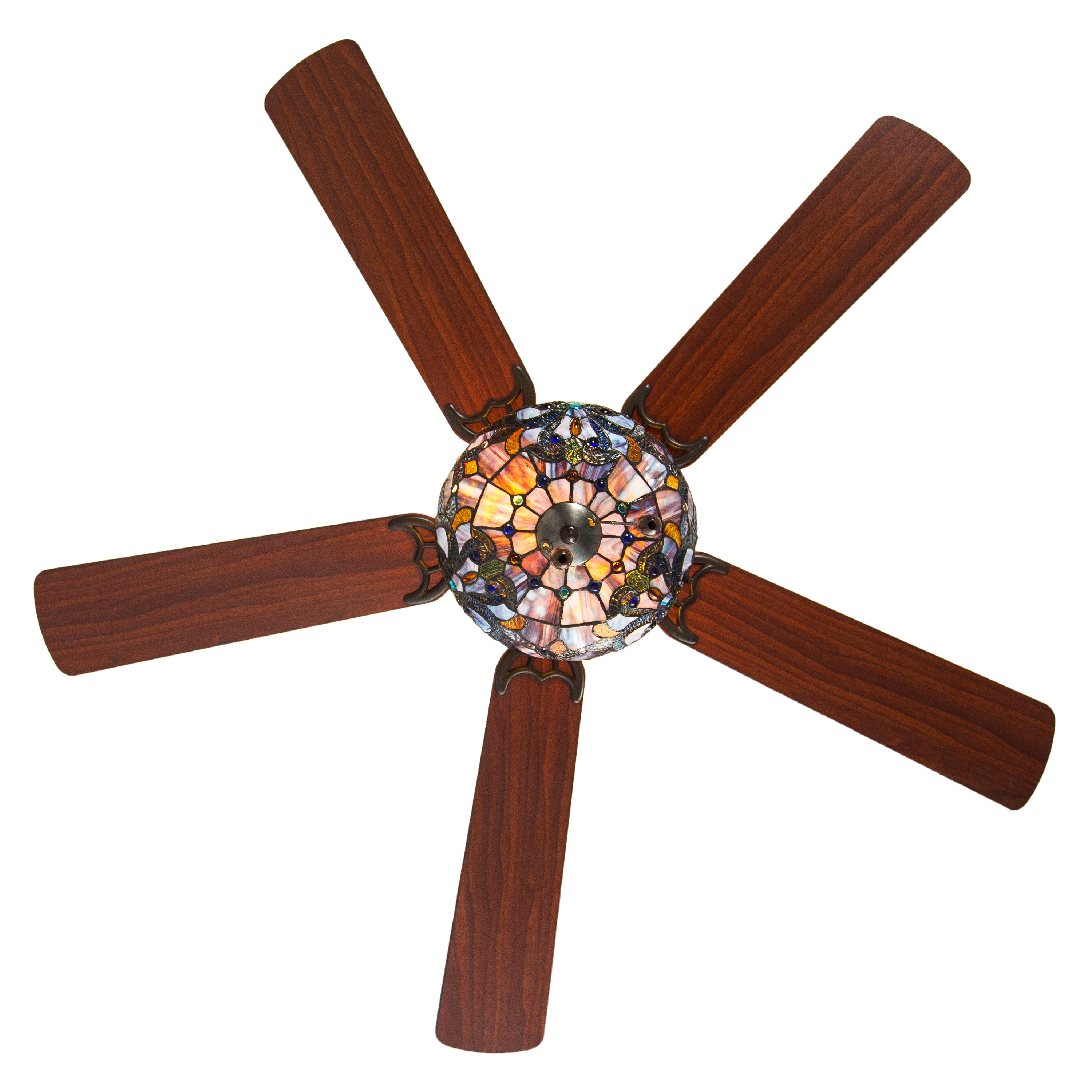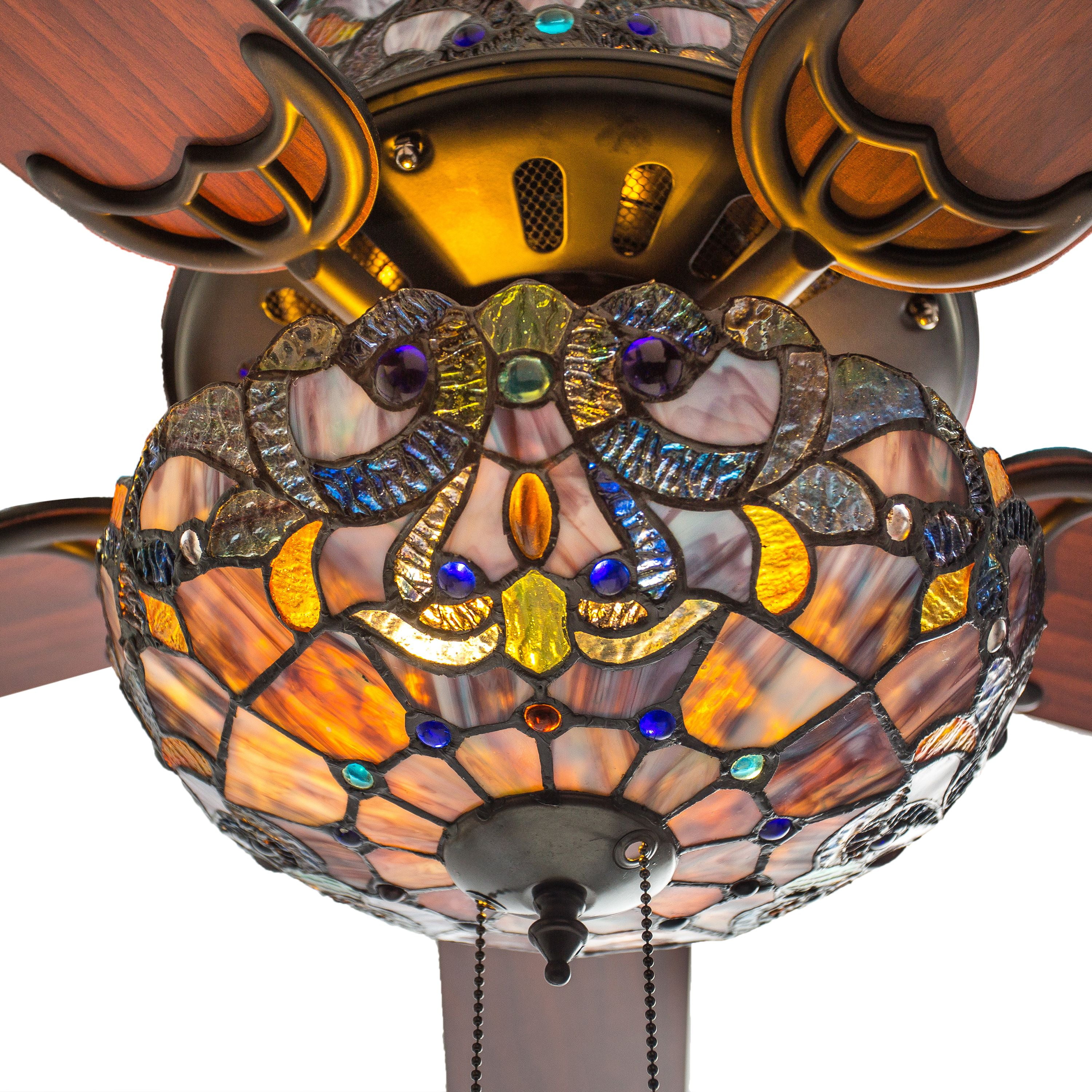 The beauty of stained glass in a functional ceiling fan. Illuminate your home in style and comfort with this Magna Carta designed ceiling fans. Six lights highlight the more than 250 total glass cuts and bring shine to the over 60 glass cabochons. This traditional baroque design is created with striated and ripple glass. Each glass cut has been soldered together using the copper foil method, made famous by Louis Comfort Tiffany in the early 1900s. Every piece of glass is unique in color, so variations may occur making each style special. Five wood grain-textured blades are included with black on one side, and mahogany on the other for reversible color options. Pull chain switches allow for manual power off/on, light operation, and three-speed motor (reversible) . A short 4″ down rod and longer 21″ down rod are included for two display options, as well as flush mount. Three fan speeds and a reversible switch help keep you comfortable year-round. In warm weather, run the fan counterclockwise to stay cool. In cold weather save money by reversing the ceiling fan direction to push warm air down.