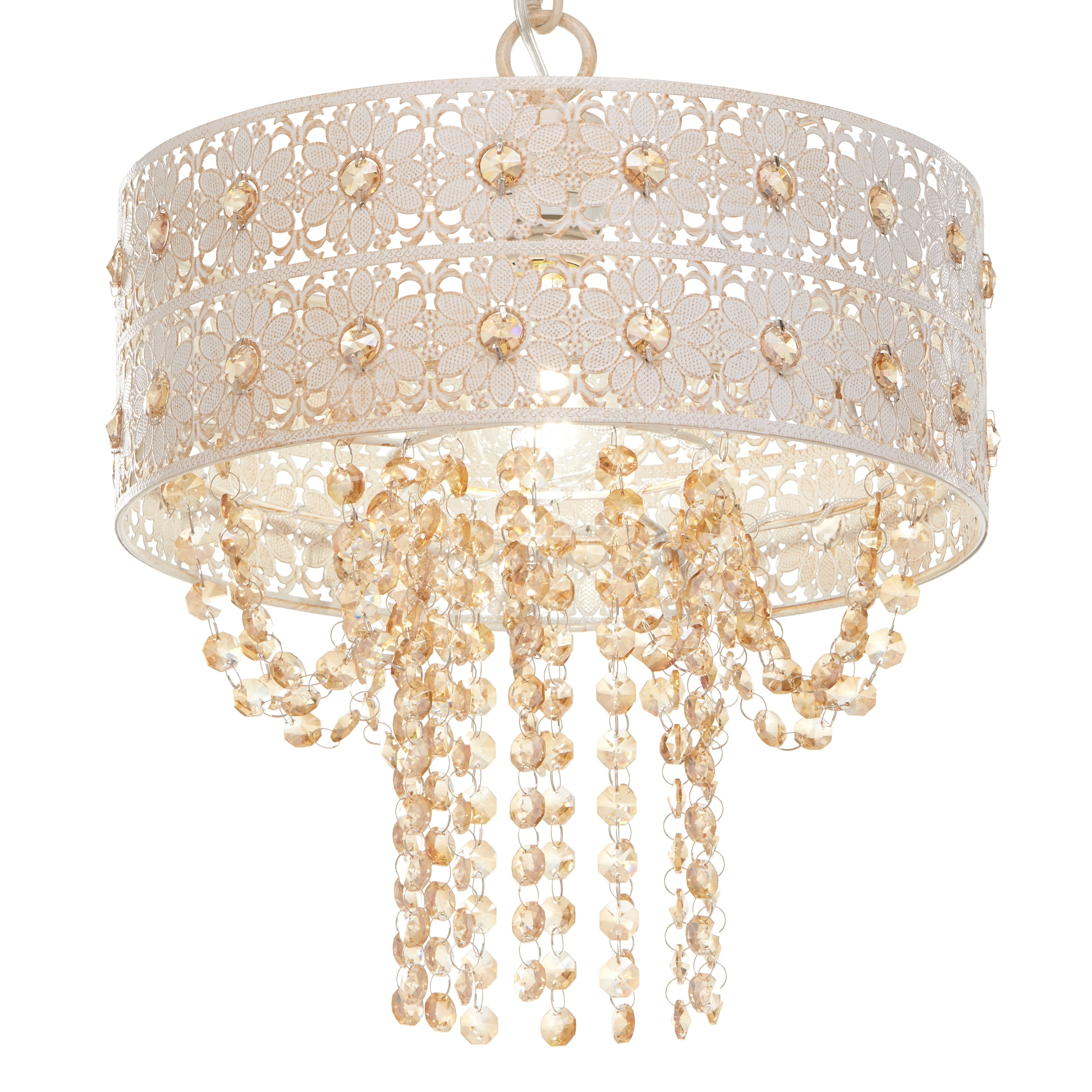 Create a romantic atmosphere well-suited for fairy tales with this glamorous hanging lamp. Rows of dainty flowers pinpointed by champagne-colored baubles grace the cutout shade, offering a beautiful play of flickers and reflections. Shade Material: Acrylic, Metal Bulb Wattage: 60 W Lighting Type: Pendant Number of Lights: 1 Light Material: Metal, Acrylic Setting: Indoor Lighting Style: Contemporary, Glam Color: Gold 12.75 inches long x 12.75 inches wide x 12.5 inches high This fixture does need to be hard wired. Professional installation is recommended. This fixture needs to be hardwired. Professional installation is recommended.