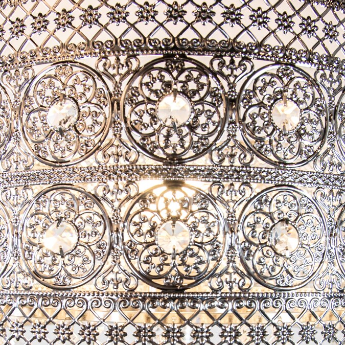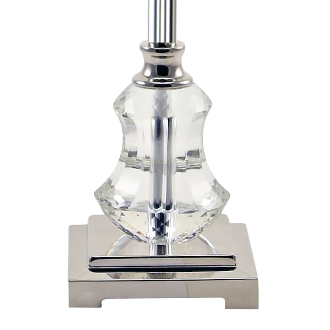 This River of Goods 24.75-in Alouette Silver with Crystals Table Lamp is a statement piece that effortlessly adds sophistication and glamour to your home’s décor. It’s designed with a square, polished nickel platform base underneath clear glass. The shade features polished nickel in a repeating medallion pattern with multi-layers of more than 55 hanging faceted clear K-9 crystal jewels. This luxurious piece is the perfect addition to your living room, bedroom or office space.