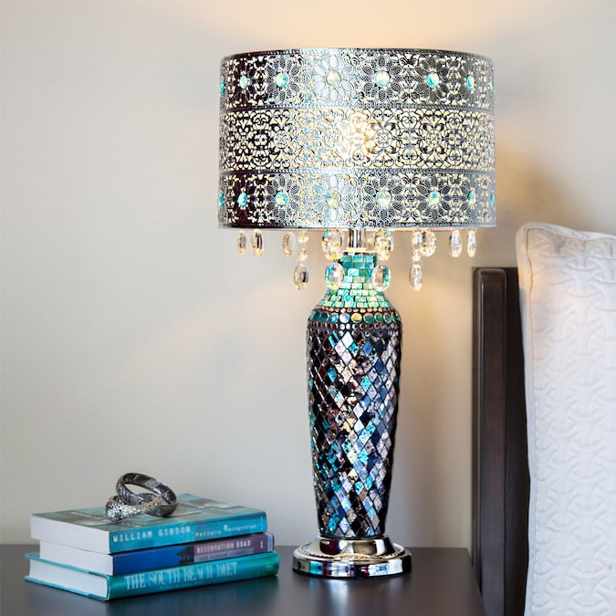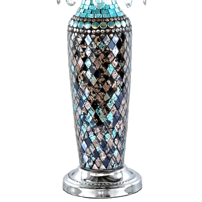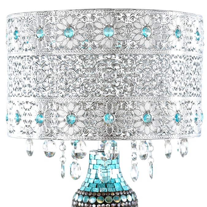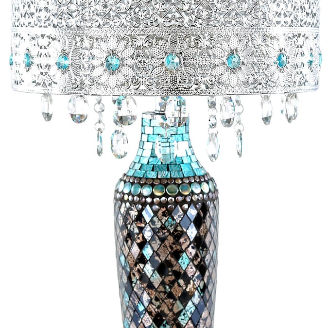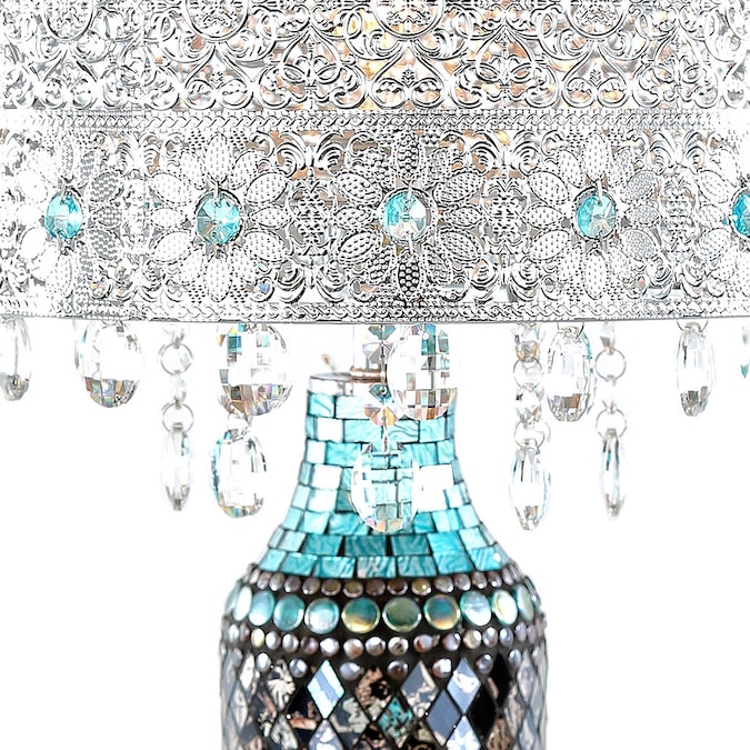 This River of Goods 24.25-in Calixta Turquoise Mosaic Table Lamp adds Boho artistic charm to your home’s décor. It’s exotic designed features a filigree silver metal shade that’s accented with light turquoise glass crystal inside a repeating floral pattern. The crystals are also draped along the bottom of the shade. But it’s the base that really shines with mosaic glass in shades of blues, silver and gold that reflect the soft illumination from the shade. This stunning piece is the perfect addition to your living room, bedroom or office space.