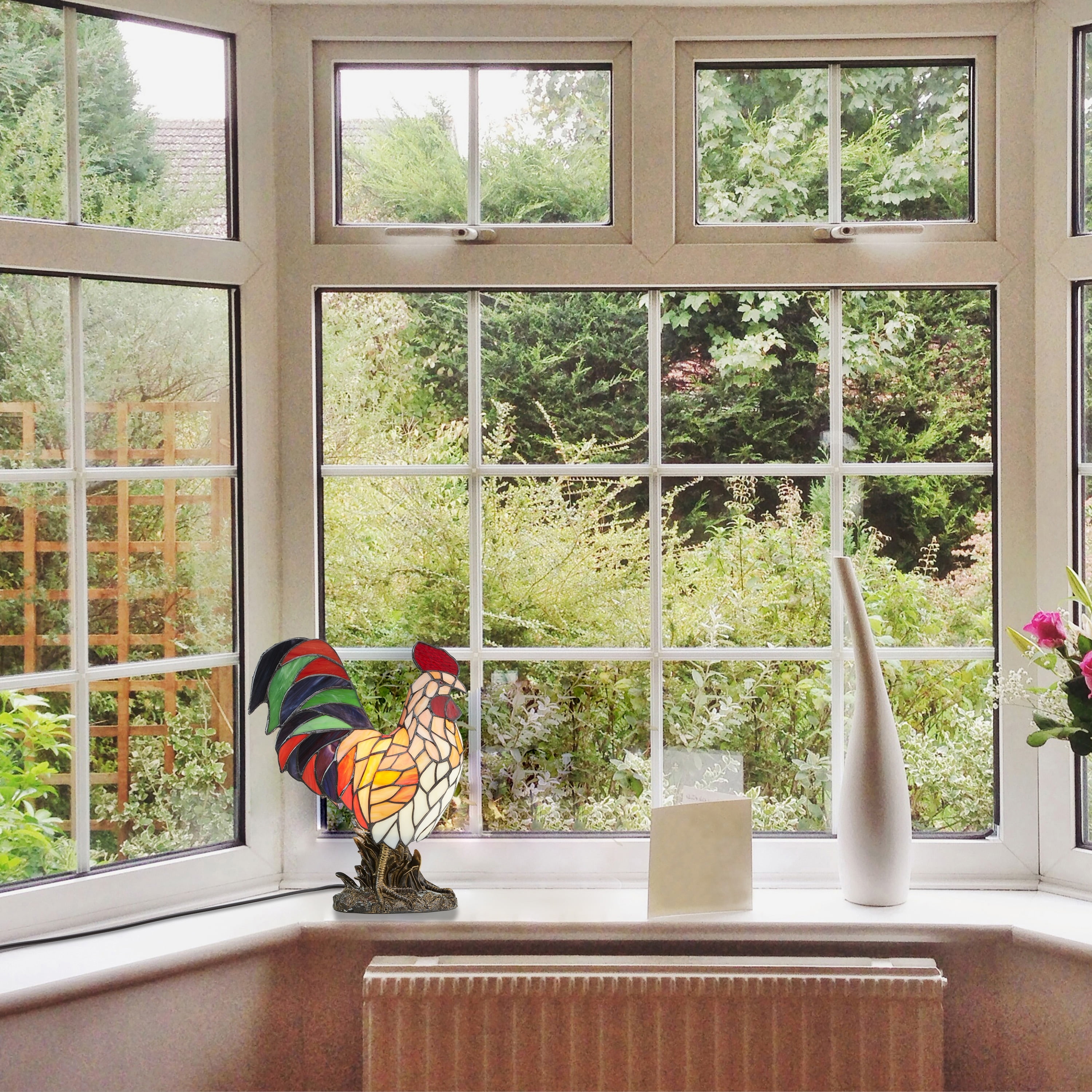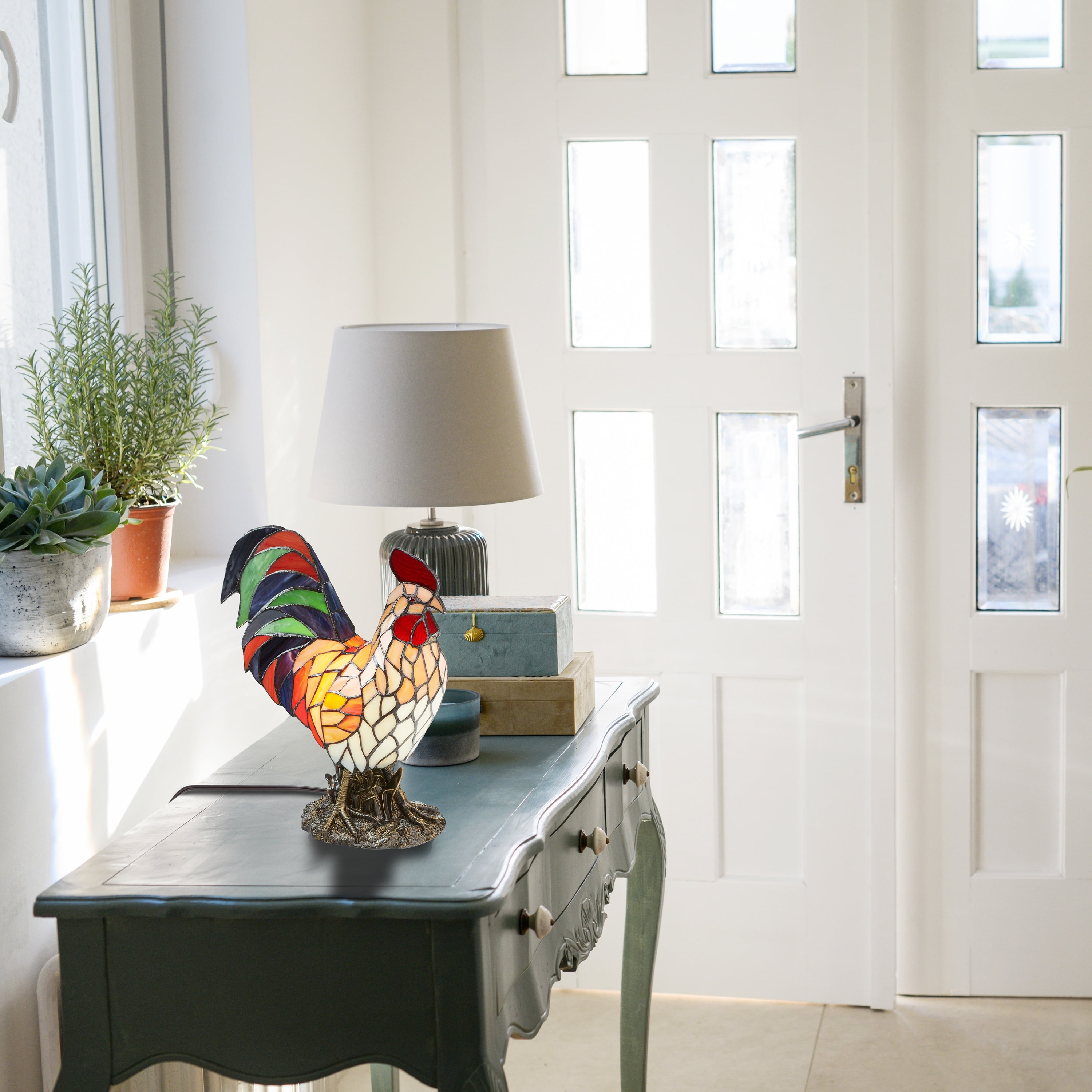 Novelty rooster-shaped shade sits atop a polyresin base with an antiqued finish Features a vibrant blend of red, green, and blue cuts of glass Multi-directional light casts a warm, inviting glow around the room