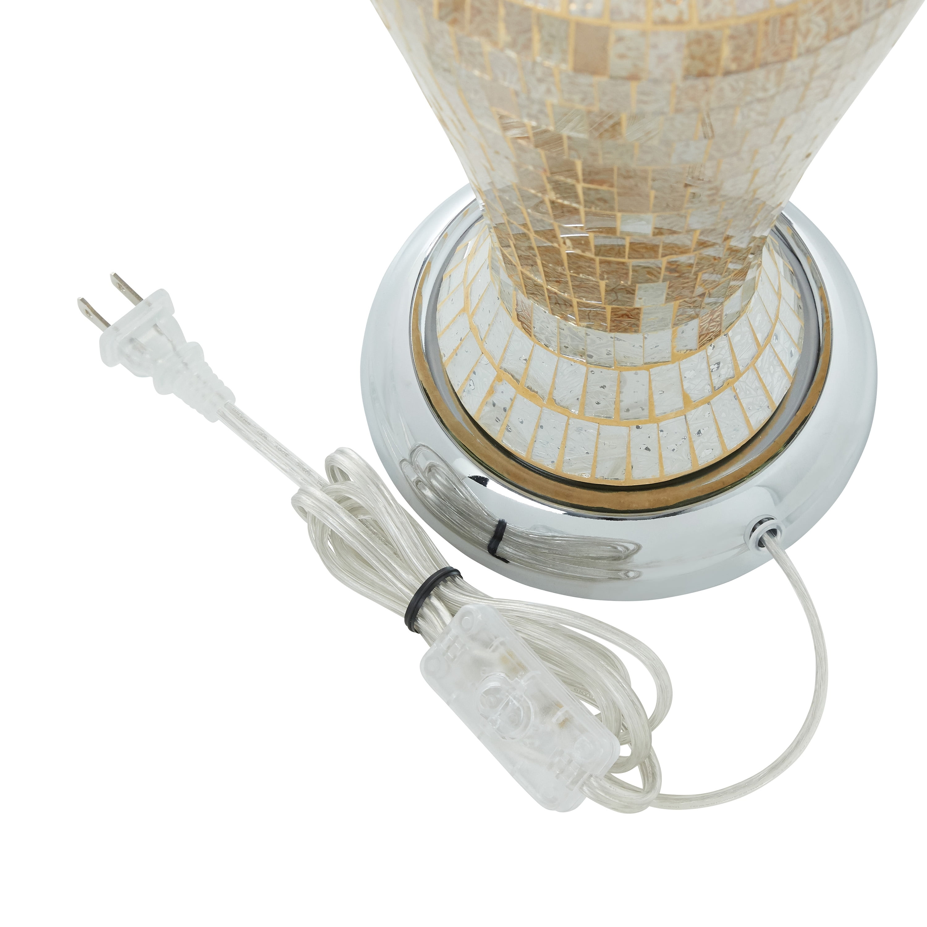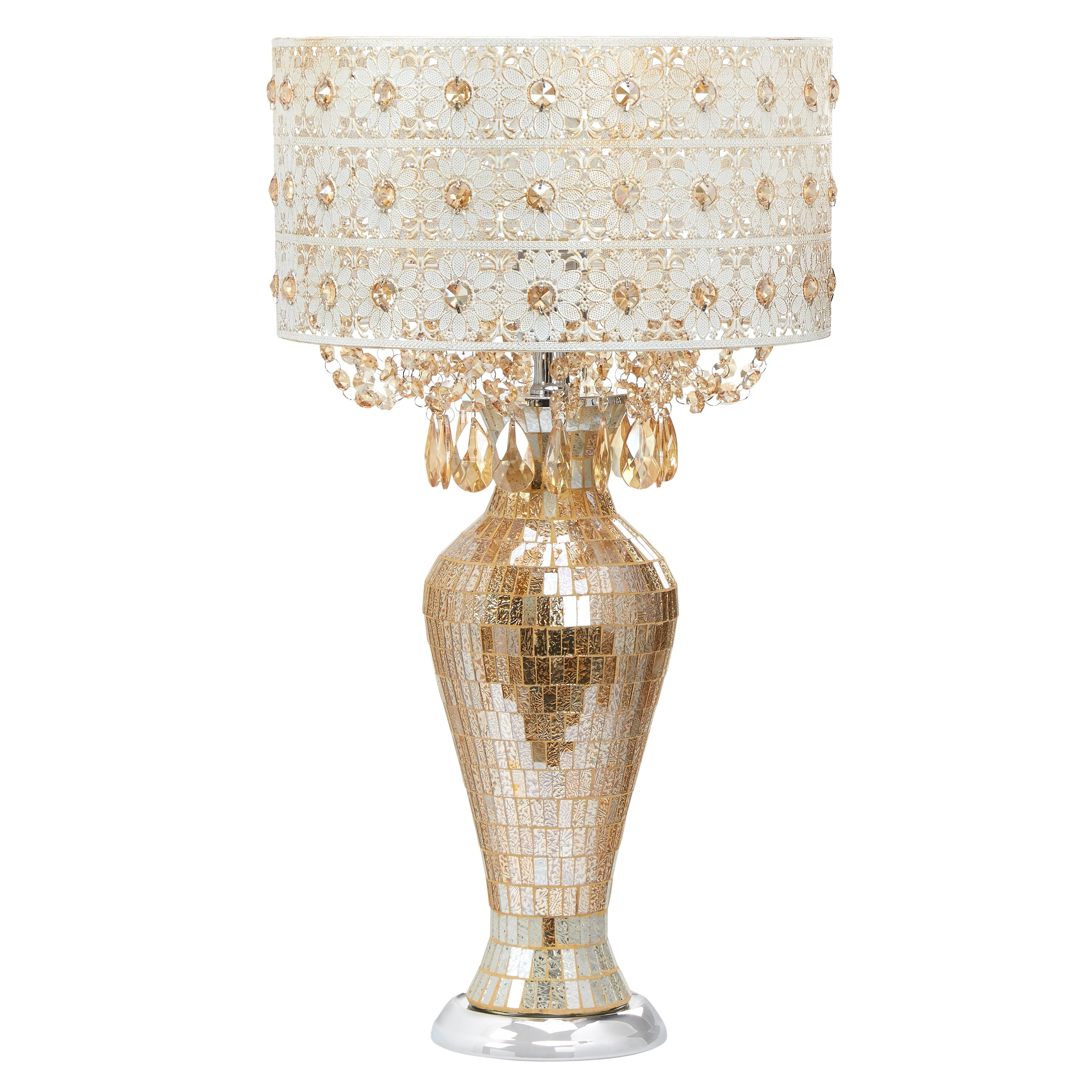 Bring resplendence to your decor with this Solvang table lamp from Poetic Wanderlust by Tracy Porter. Boasting a round shade with metal filigree floral motifs, cascading colored glass crystals, and a mosaic base, this lamp has a bohemian vibe inspired by the beauty of Parisian life. Features: Dimensions: 14 inches long x 14 inches wide x 25 inches high Light Bulb Type: Incandescent Lighting Type: Table Lamp Material: Metal, Glass Lamp Type: Specialty, Table Lamp, Accent Lamp Lighting Shade Color: Gold Height: 23 in or more Shade Shape: Round Switch Type: On-Off Line Switch Shade Material: Glass, Metal Bulb Wattage: 60 W Number of Lights: 1 Light Light Direction: Multi-directional Setting: Indoor Lighting Style: Bohemian, Vintage, Specialty Exact Color: Champagne Finish: Metal Finish Width: 16 in or less Color: Gold