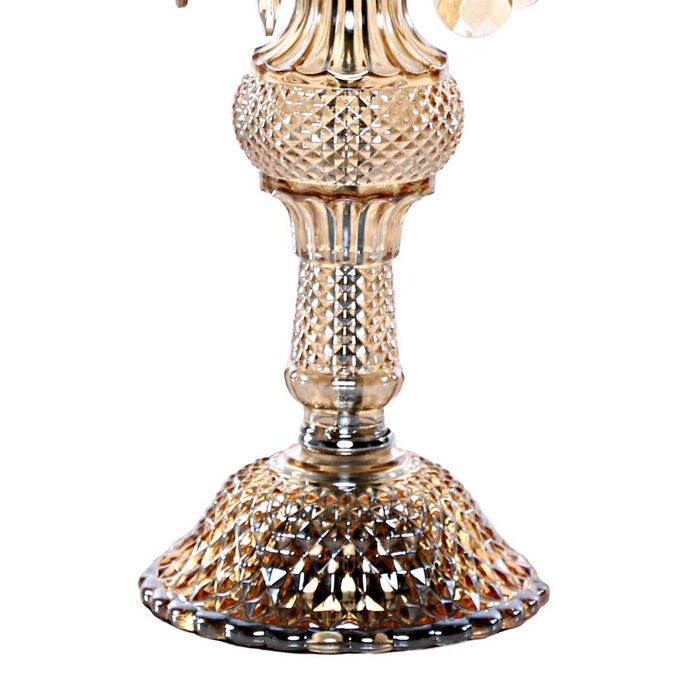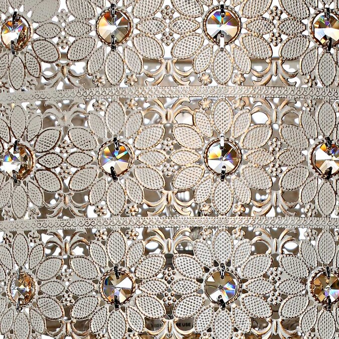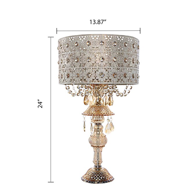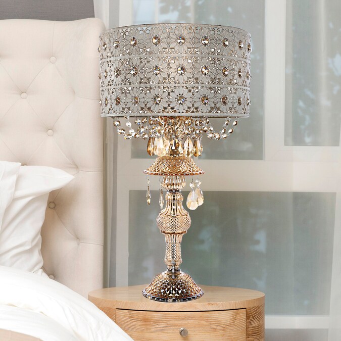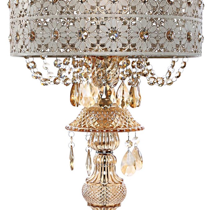 This River of Goods 24-in Tegan Gold Table Lamp with Champagne Jeweled Shade is an captivating, heirloom piece that will add a sophisticated flare to your home’s décor. It’s dazzling design features a gold metal frame with 150 champagne-colored jewels in a repeating floral pattern. Crystals generously drape from the shade as well as the base. The tiered base is made of glass, reflecting the soft illumination from the shade. This luxurious piece is the perfect addition to your living room, bedroom or office space.