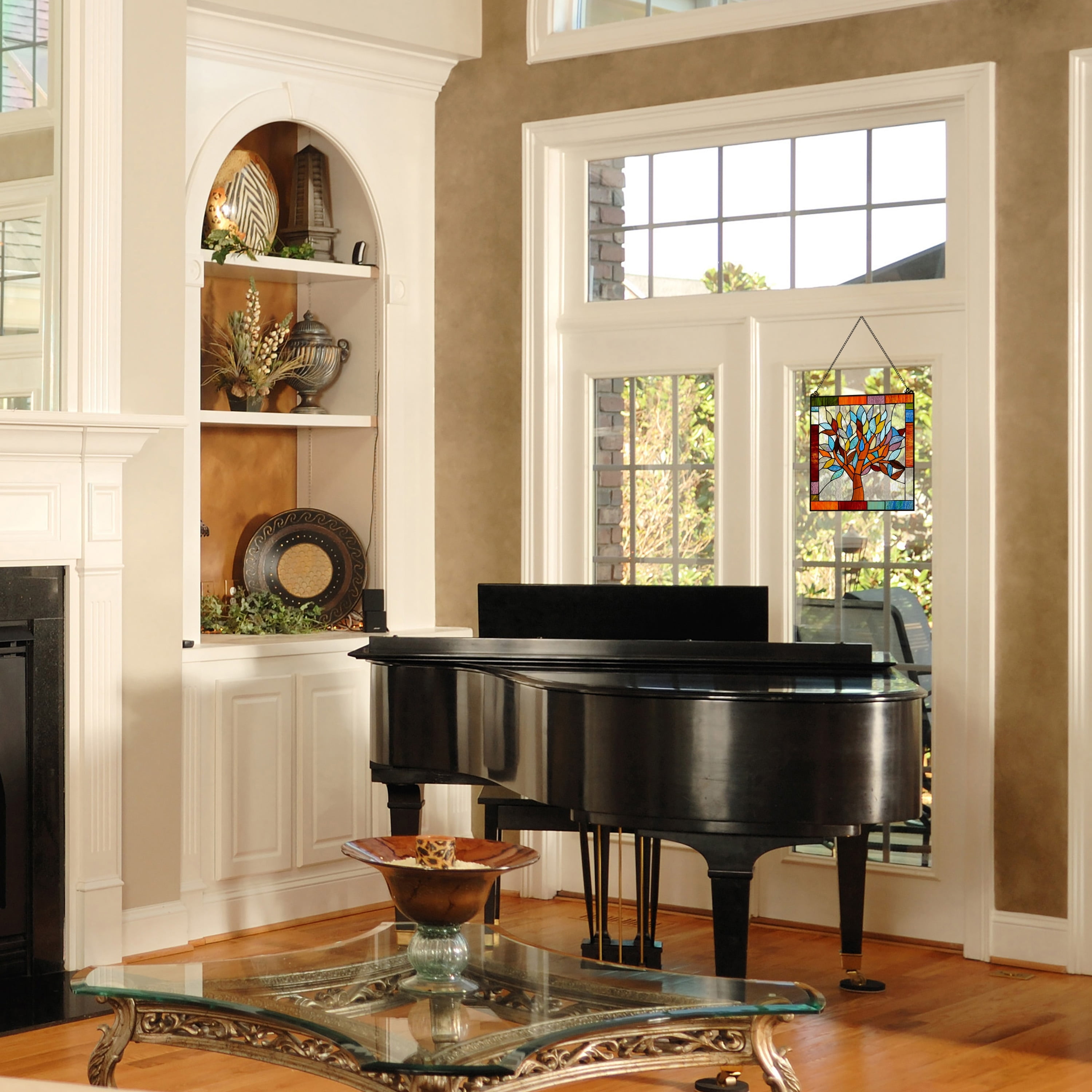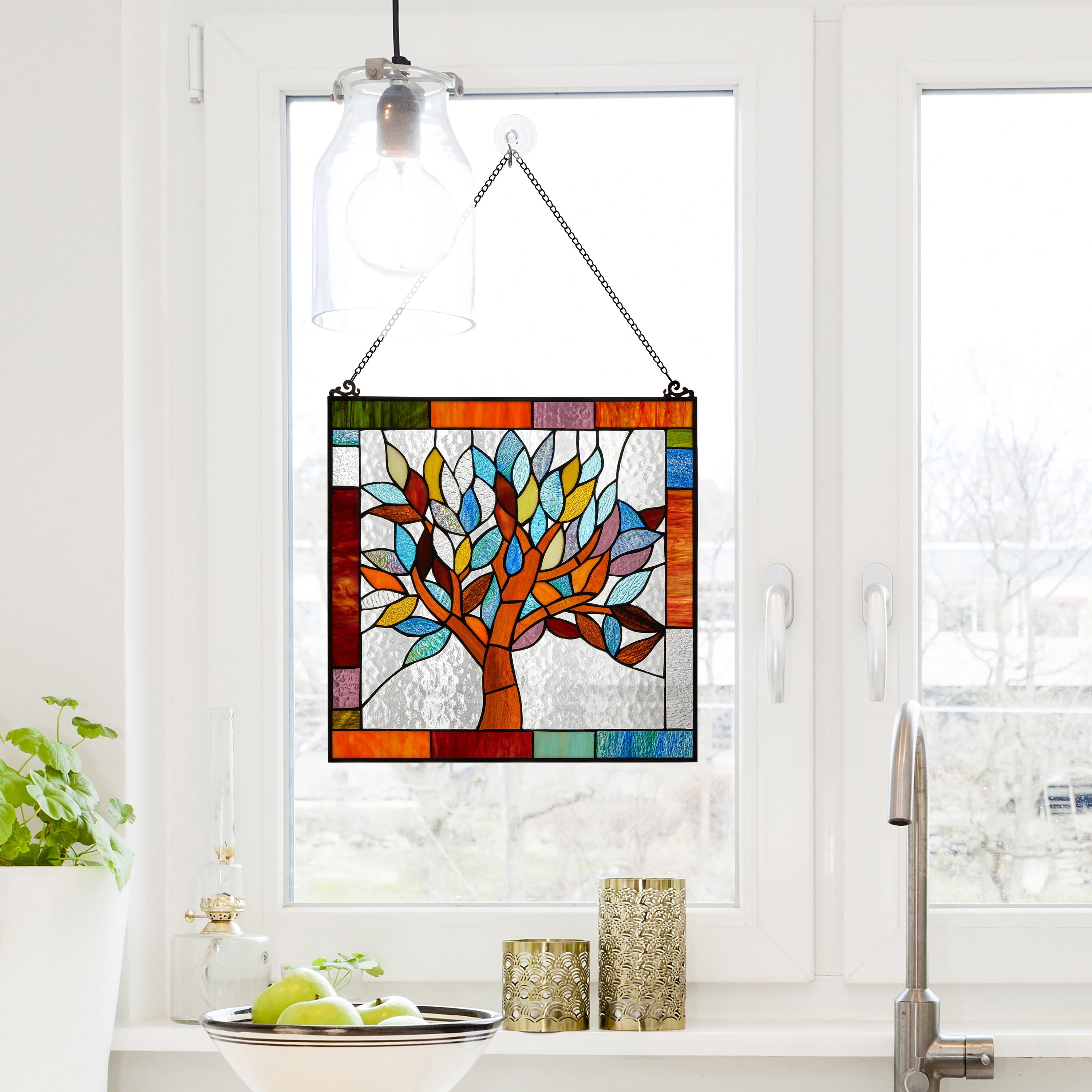 CONNECT TO THE WORLD: Trees have been known to symbolize a deep connection with the world – place this in your home to remember the importance. REAL STAINED GLASS: This glass panel features 131 pieces of hand cut striated and ripple glass in hues of blue, green, red, brown and purple. VERSATILE: Window panels are not only great for adding color to your window, but they also add privacy without the weight of draperies and blinds. Panels can also be displayed against a wall for a more contemporary, gallery feel. INCLUDES: 28″ chain for convenient display options. OVERALL DIMENSIONS: 18″L x 0.25″W x 18″H