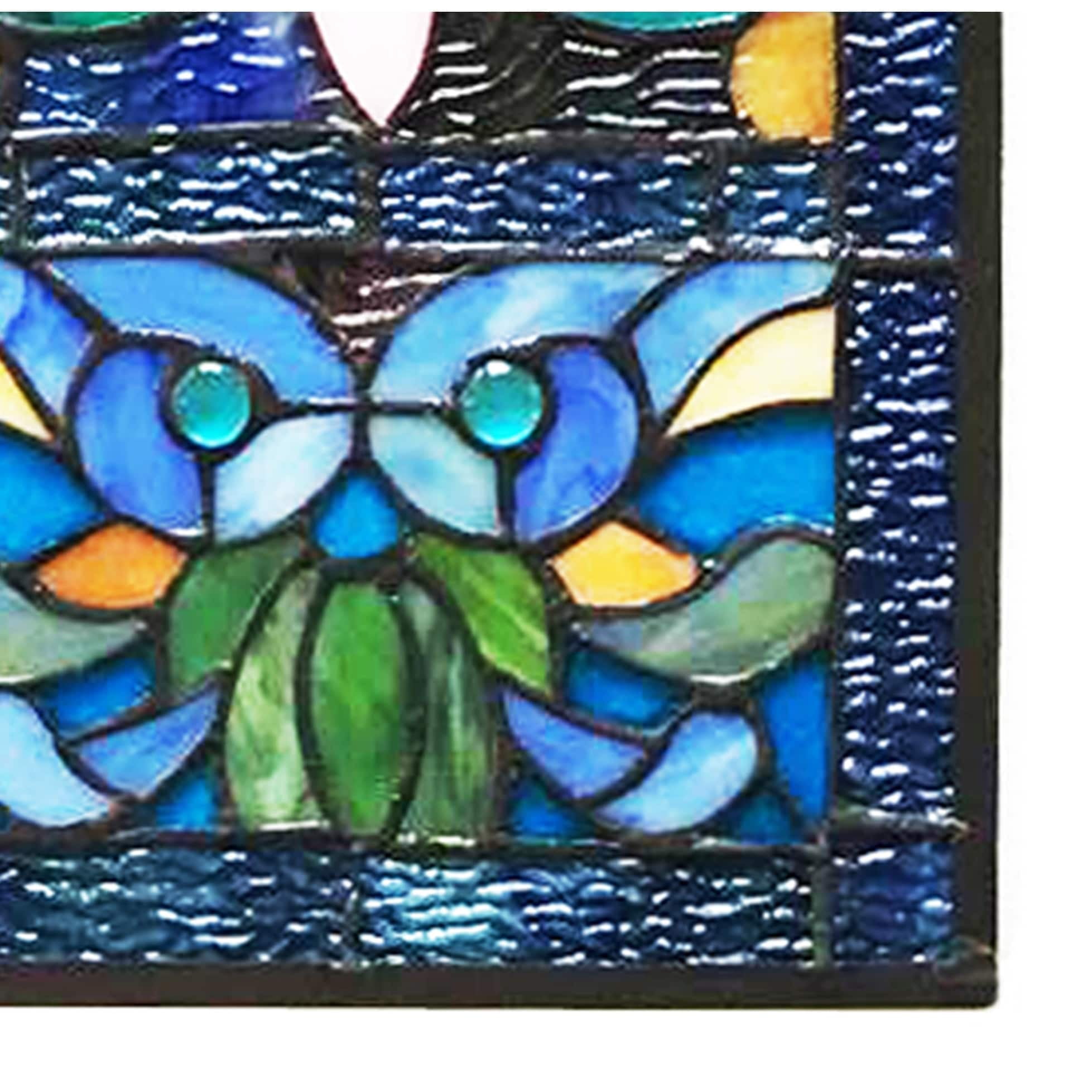 Add privacy and beauty to your home with this Victorian-style stained glass window panel from River of Goods. The exquisite Fleur De Lis design is handcrafted with brilliant blue, teal, and red colors that catch the sun’s rays and reflect light throughout any room. This panel comes with a decorative hanging chain for easy installation and can be displayed as a sun catcher, wall hanging, or next to your front door. Delight your loved ones with this stunning glass panel that adds warmth and happiness to any living space. Features: Handcrafted stained glass Fleur De Lis design catches the sunlight and reflects light throughout any room Decorative hanging chain included for easy installation Versatile display options as a sun catcher, wall hanging, or next to your front door Traditional Fleur De Lis themed art adds brilliant blue, teal, and red colors to any living space Overall dimensions: 9.5″L x 0.25″W x 36″H