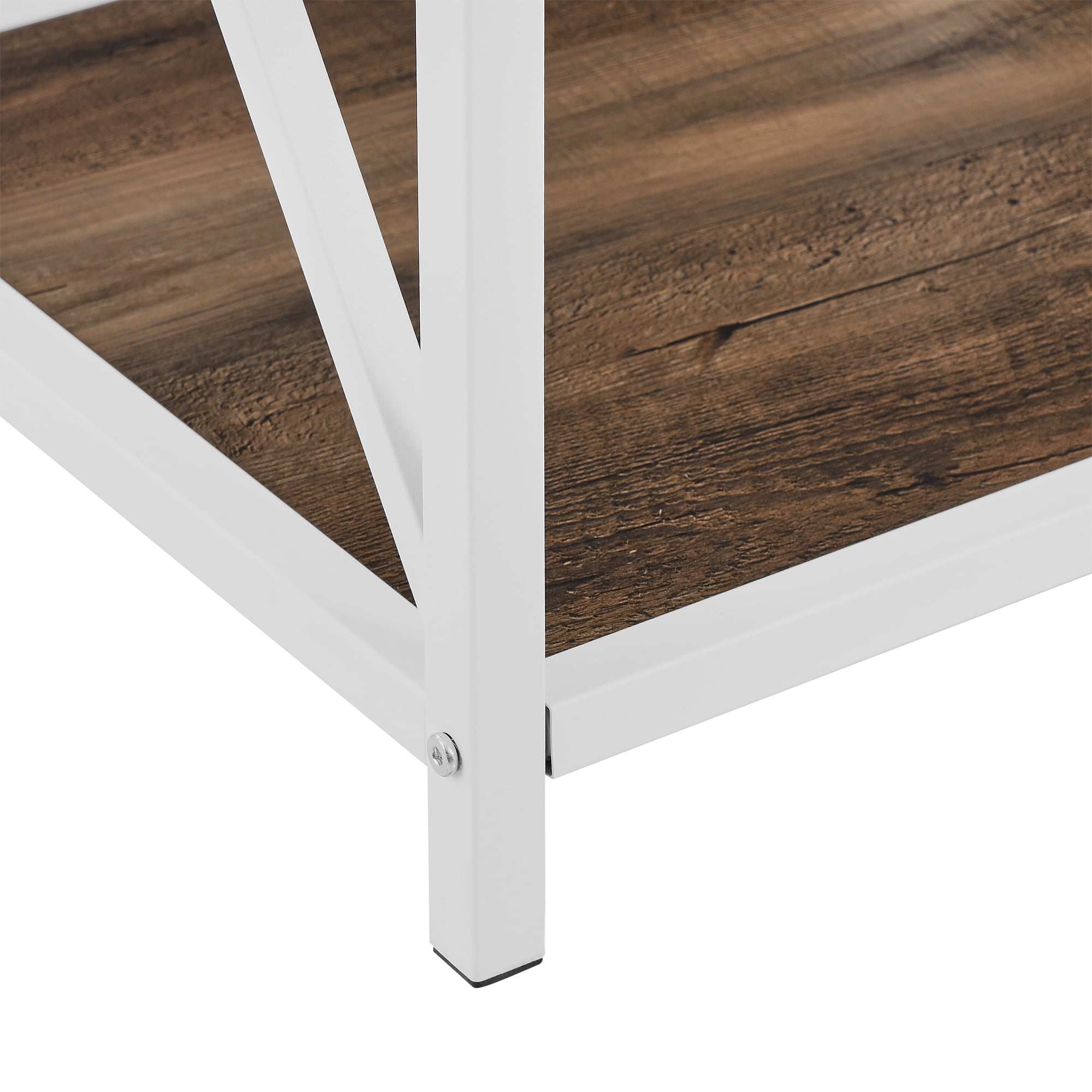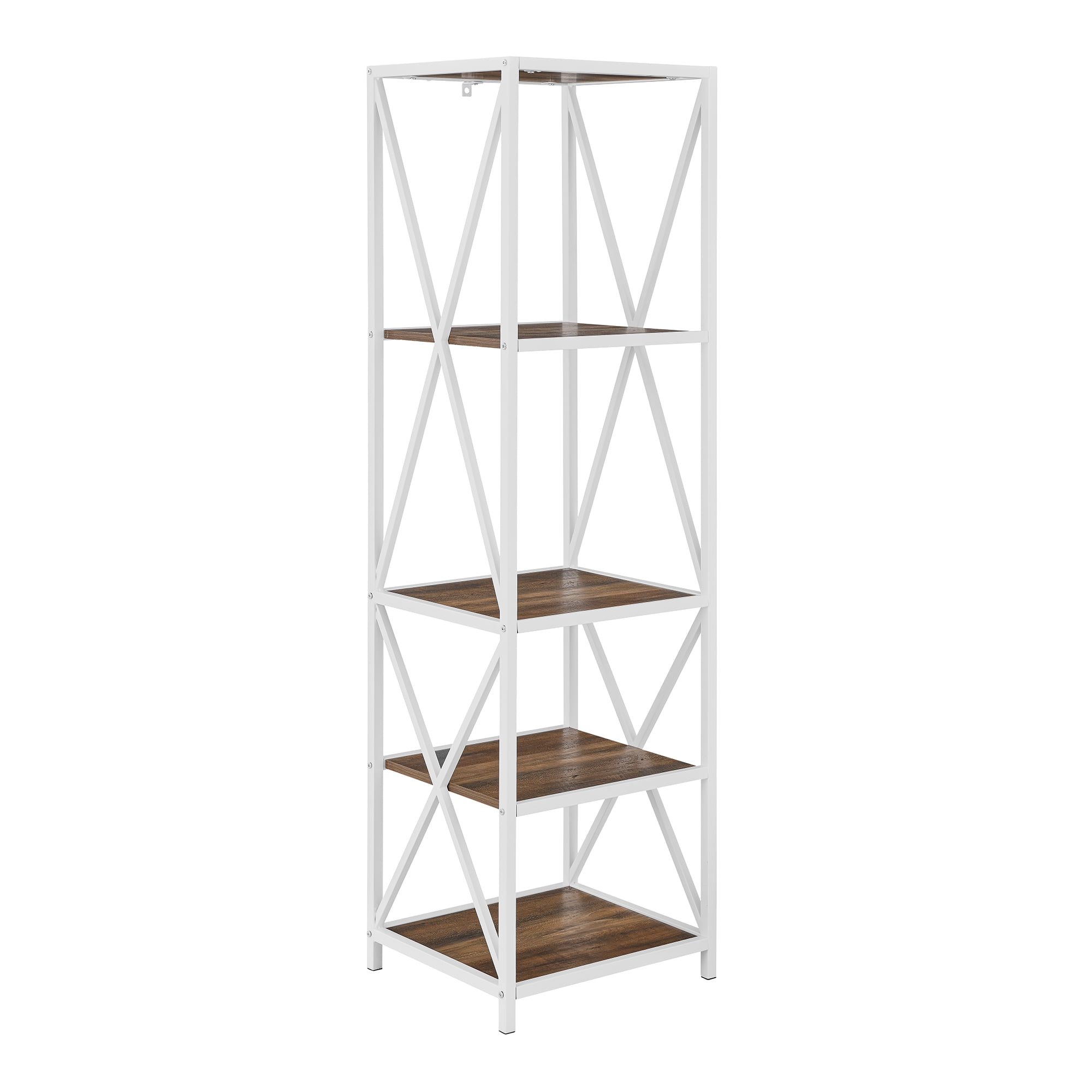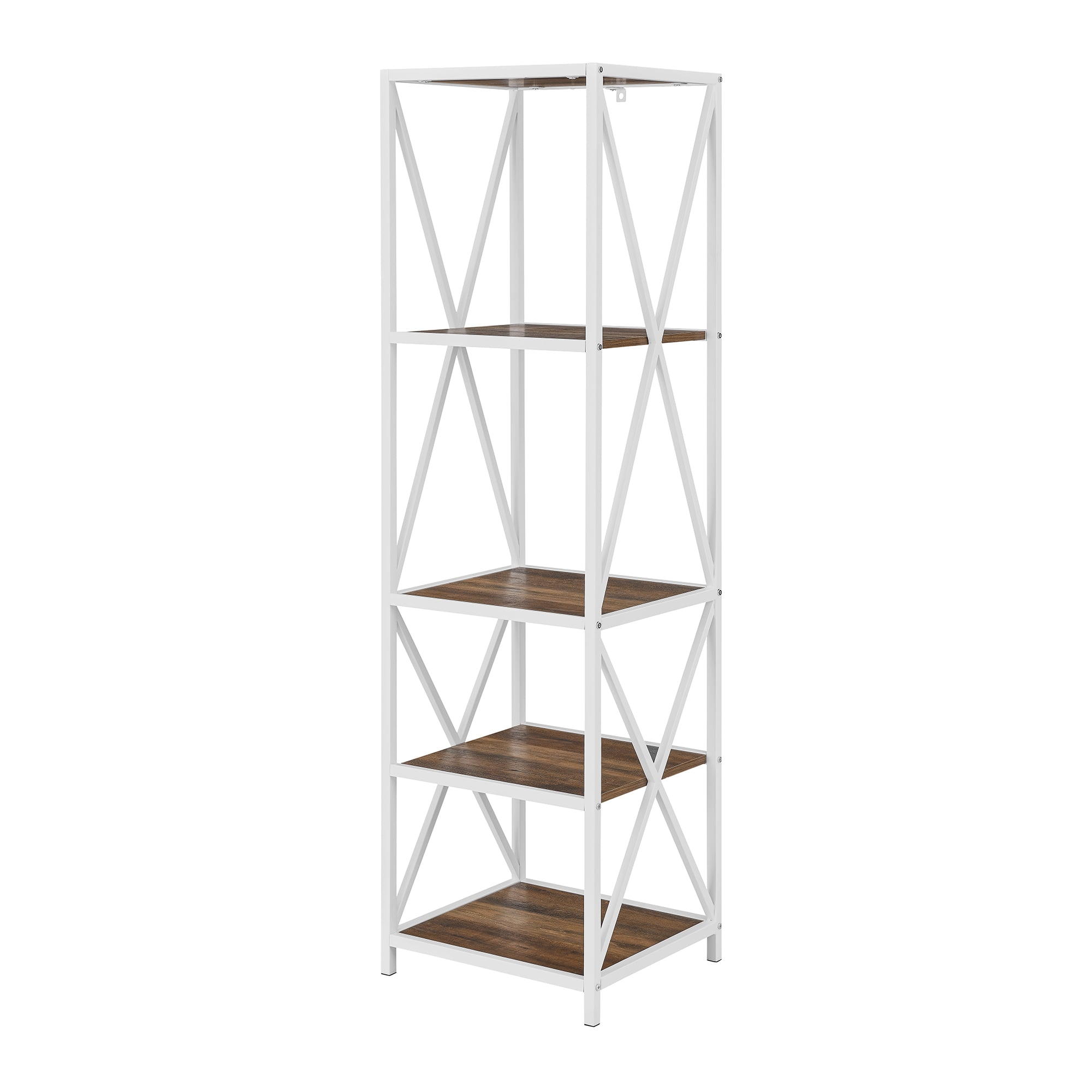 Charlie 4 Shelf Rustic Oak / White Bookshelf by River Street Designs: X-shaped sides for a stylish appeal Urban industrial style to add to your home Four shelves provide ample storage space for your items Made of high-grade MDF and powder-coated metal Reliable construction to hold your decor, books, and more 61″ H x 18” L x 16” W 41LBS High-grade MDF, durable laminate, metal