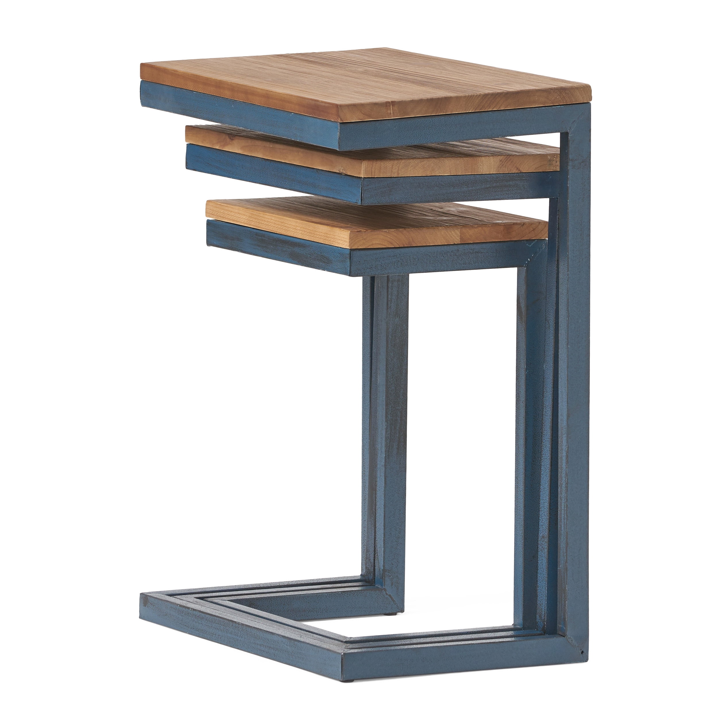 Accessorize your indoor space with a set of nested tables that can be easily stored away when not in use. Including three tables in small, medium, and large, this set offers incredible versatility whenever you need some extra table space. When your guests have gone and you need your living room back, you can simply tuck these tables together for easy storage. Built with sturdy iron frames and finished with stunning firwood tops, this set will provide outstanding durability and style for years to come. MODERN INDUSTRIAL: Our table set incorporates a powder-coated iron frame with firwood tabletop to create an understated modern industrial design. Featuring smooth metal contrasted by natural wood, this set offers a chic aesthetic to any home. NESTING TABLES: This set of tables can be nested for easy storage when not in use. Cleverly designed to tuck into each other, this set also offers an exquisitely curved structure that elevates the vibe of your decor. FIRWOOD: The tabletops are created with refined firwood for a resilient structure that features straight, tight grains. This durable wood less prone to warping or twisting due to its dense nature. IRON FRAME: Constructed of iron, the frame of this table set is made to be incredibly durable, ensuring that this piece will hold up under heavy use. Refined with a matte finish, the base brings an elegant touch to this piece, making it an understated yet chic addition to your home. DIMENSIONS: Choose an accessory that is the perfect size for you and your furniture. The smallest table is 10.25” W x 12.75” D x 19.00” H. The middle table is 11.50” W x 15.50” D x 22.25” H. The largest table is 12.75” W x 18.25” D x 25.25” H. You will love how much your space can transform with the simple addition of this charming table set.