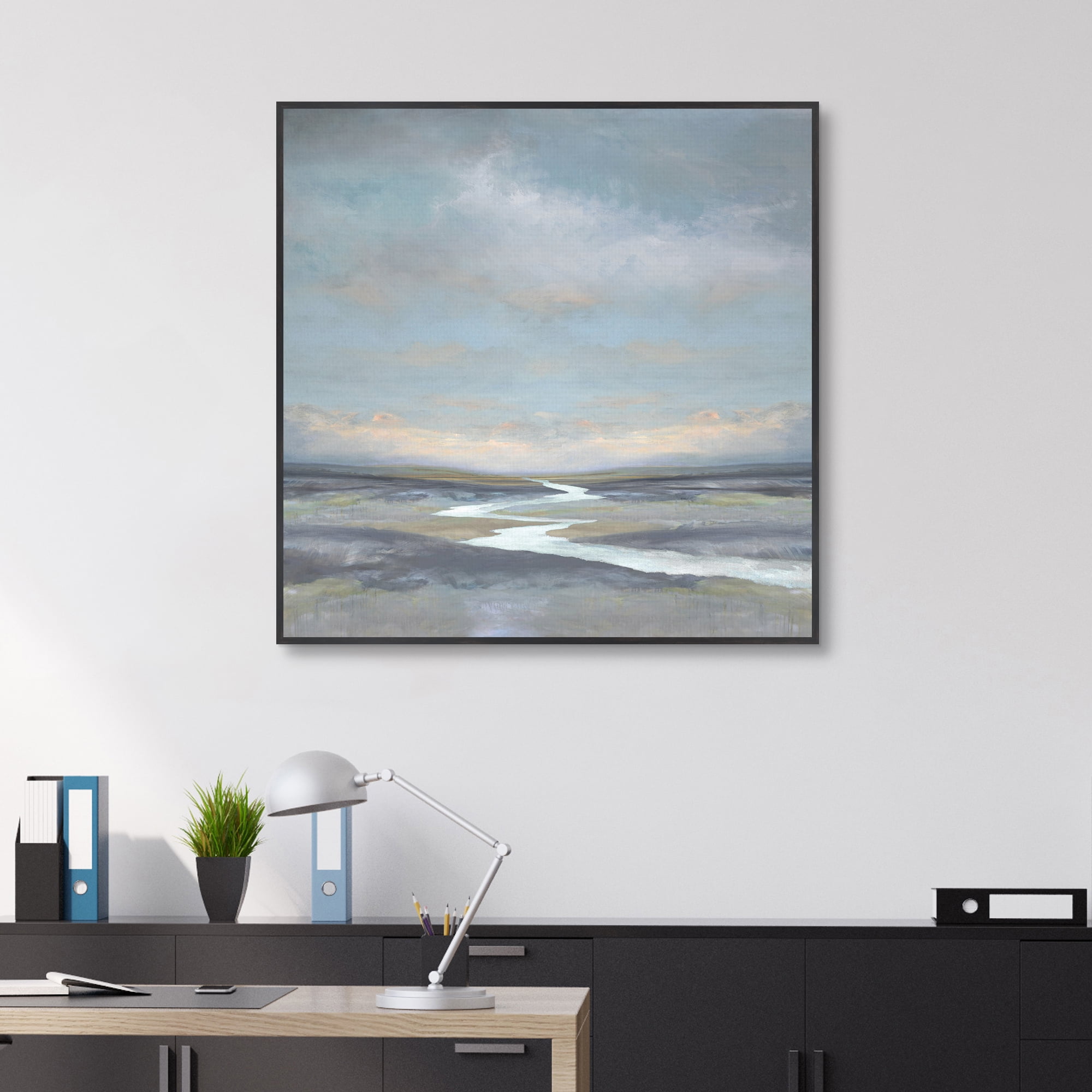 Saturated charcoal gray colored wood-L frame Impressionist landscape Ready to hang