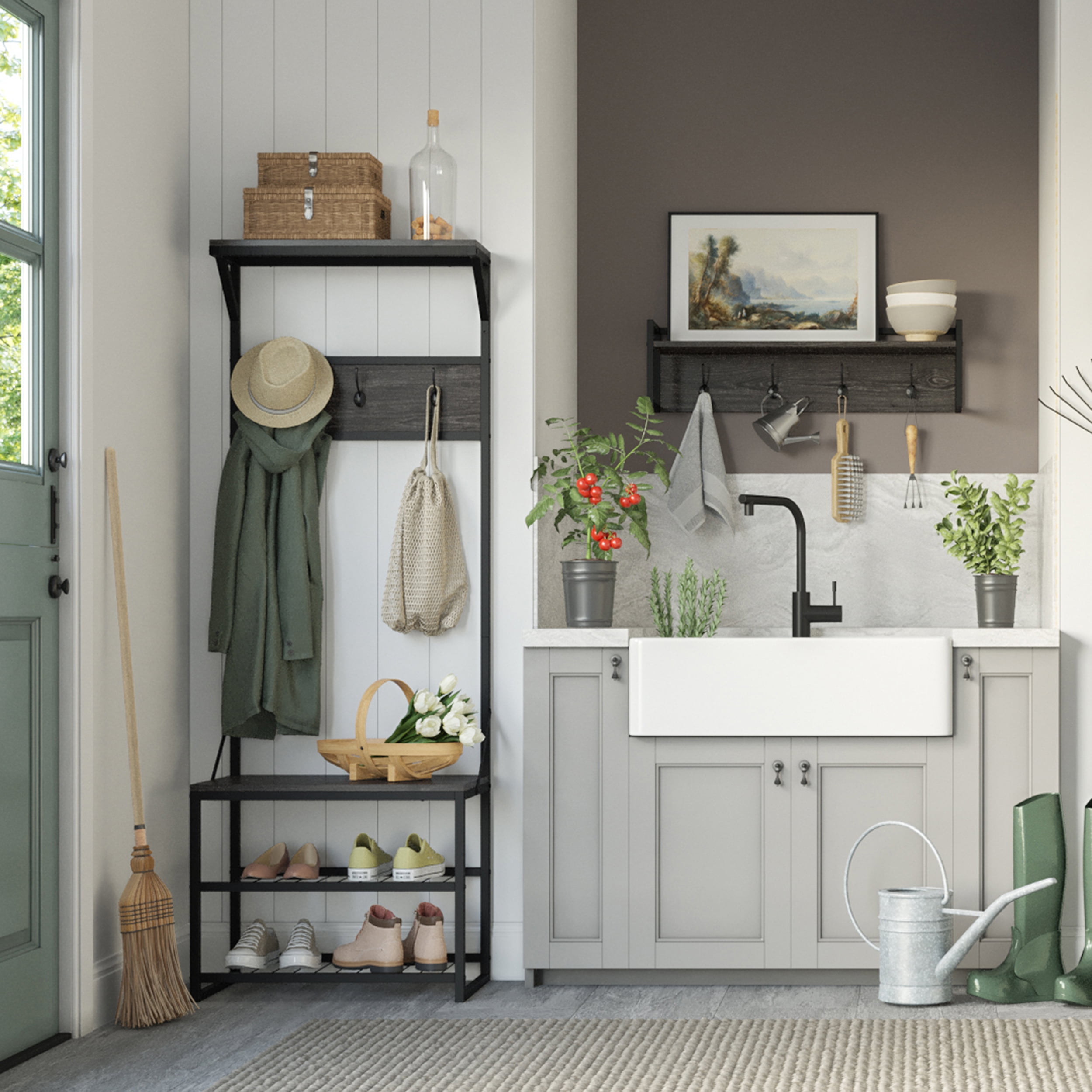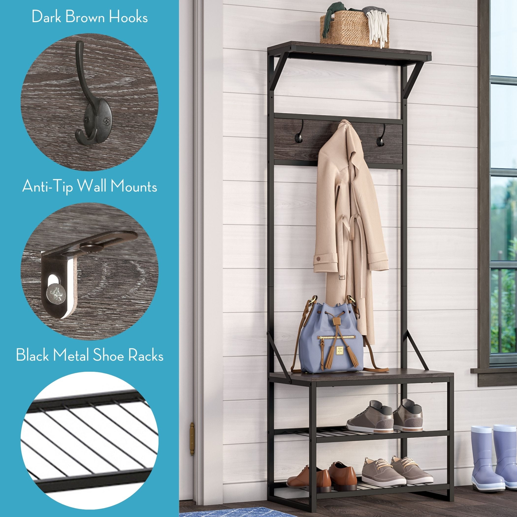 Assembled Dimensions: 14.19-in. D x 23.69-in. W x 66.75-in. H. Additional Dimensions: Top Shelf: 23.56” W x 7.88” D; Bench Seat: 23.63” W x 14.19” D; Seat Height: 19 in. H; Bottom Shelves: 22” W x 14.25” D x 7.06” H Entryway Hall Tree will hold up to 10 pounds per shelf, 5 pounds per hook for a total weight of 45 pounds. Bench seating weight capacity is 200 pounds. Shoe capacity on racks: 4-6 pairs Entryway shoe and coat rack is made of particle board with weathered woodgrain veneer, three metal dark brown double coat hooks and metal racks and frame. Modern hall tree features two shoe racks, one bench seat, 3 double coat hooks and one open top shelf. Weathered woodgrain, black metal frames and dark brown coat hooks add simple, contemporary charm to any space. Perfect for entryways and mud rooms. Shoe storage bench offers a narrow design perfect for maximizing storage in smaller entryways and mudrooms. Give your entryway a modern makeover with all Afton Collection items Anchors to the wall for added stability. Hardware included.