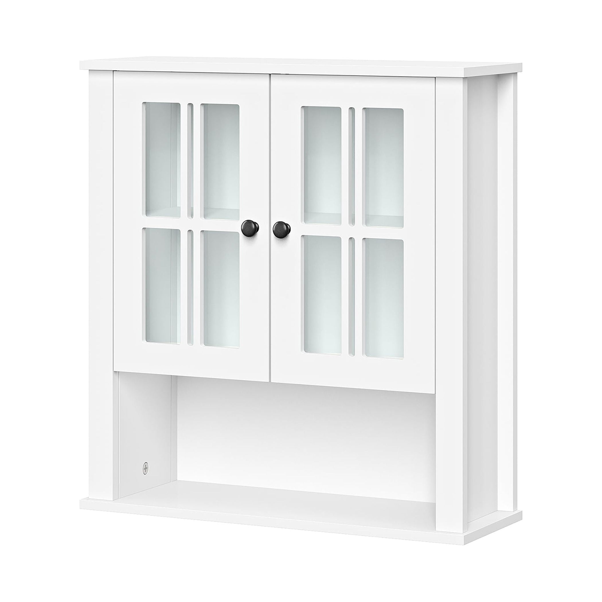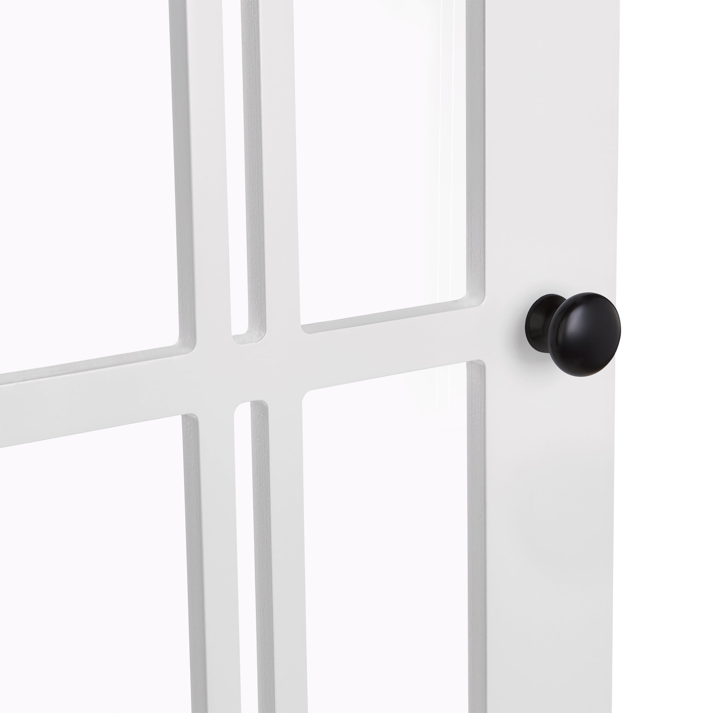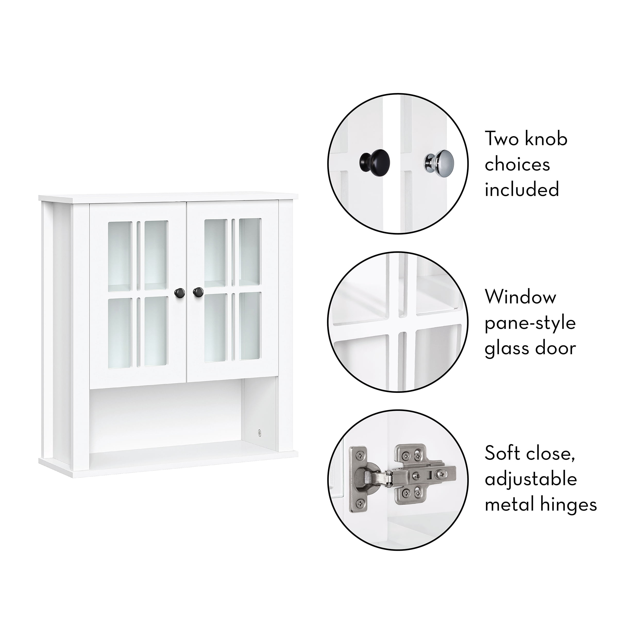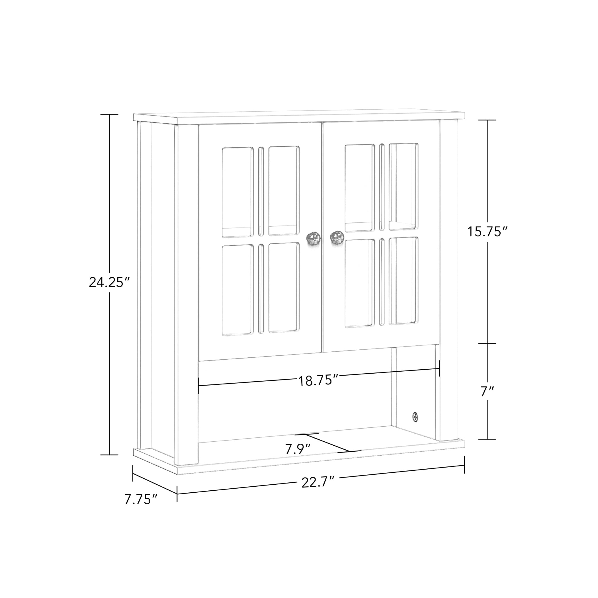 Functionality meets style with this charming two-door wall cabinet featuring windowpane-style glass doors and soft-close hinges Includes two interior fixed shelves and one open shelf below for a variety of storage and display options Classic design features smooth, white painted finish and includes two knob choices (polished silver and black) Includes detailed instructions for easy assembly and mounting to the wall Package includes your choice of door knobs (polished silver or black) Pair with any of the additional RiverRidge Home Danbury Collection items to add even more style and organization to your space Finished Assembled Size: 22.69″ W 7.75″ D 24.25″ H Overall Cabinet Interior: 18.75″ W 6.31″ D 15.25″ H Interior Shelves: 18.75″ W 6.31″ D Top Shelf Height: 7″ H Bottom Shelf Height: 7.5″ H