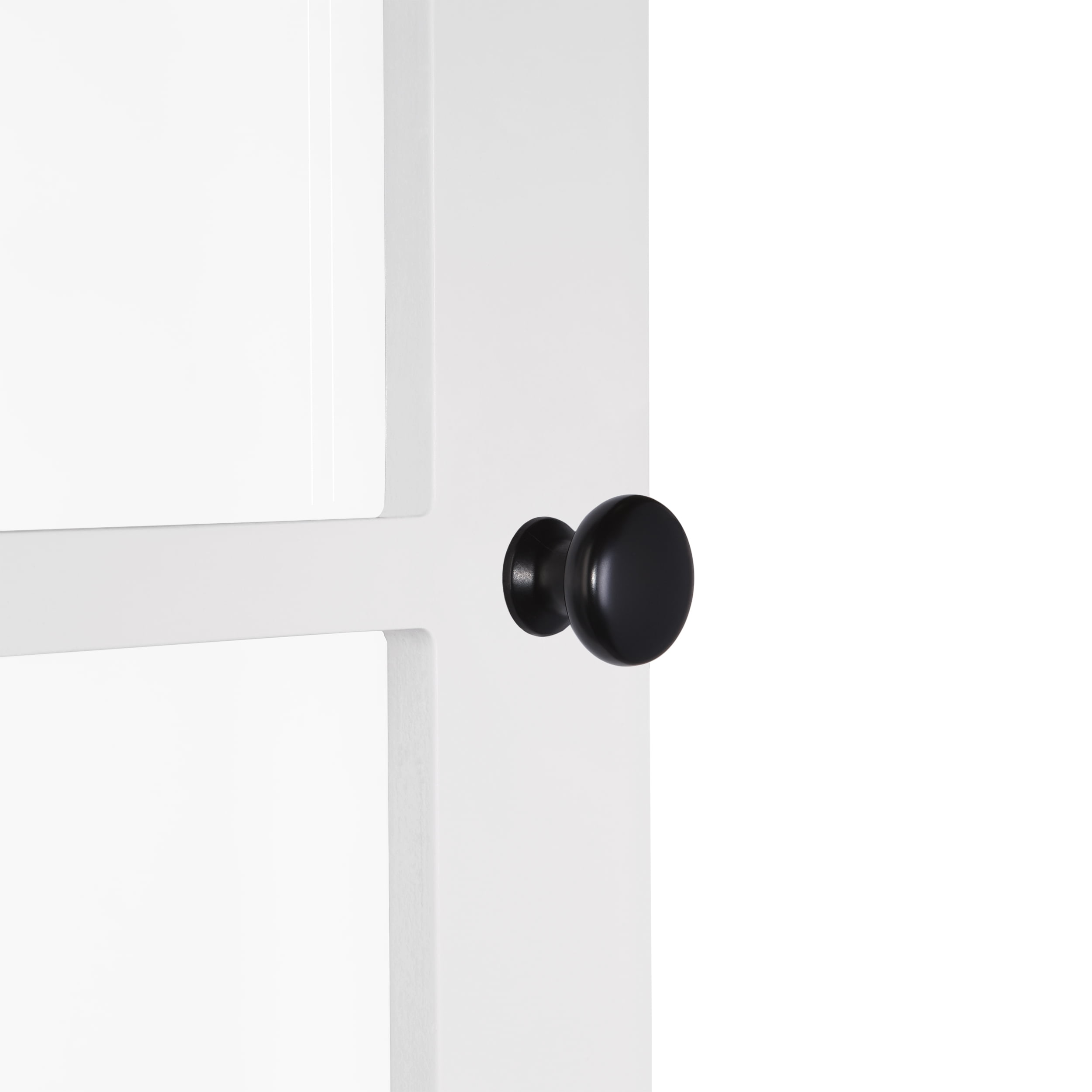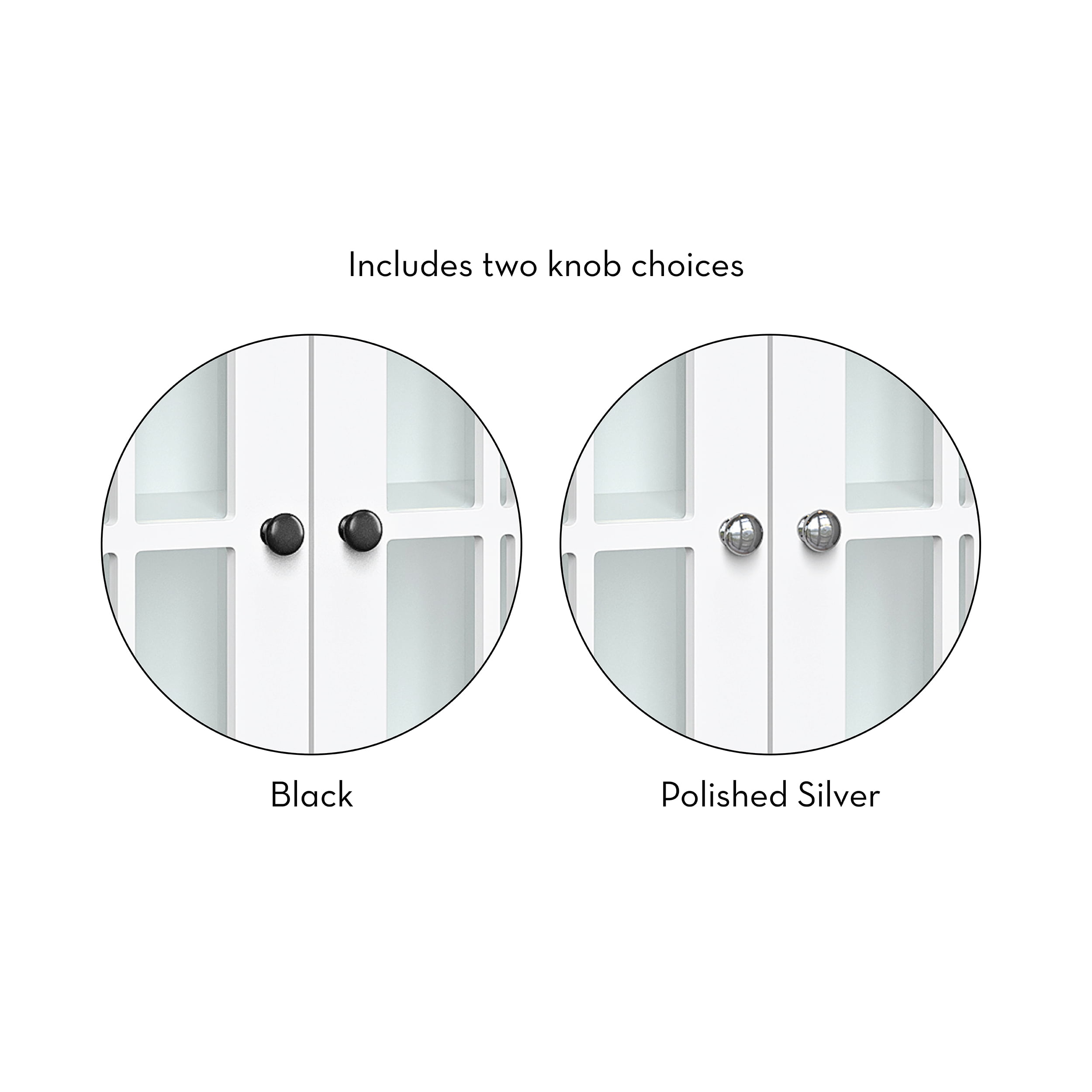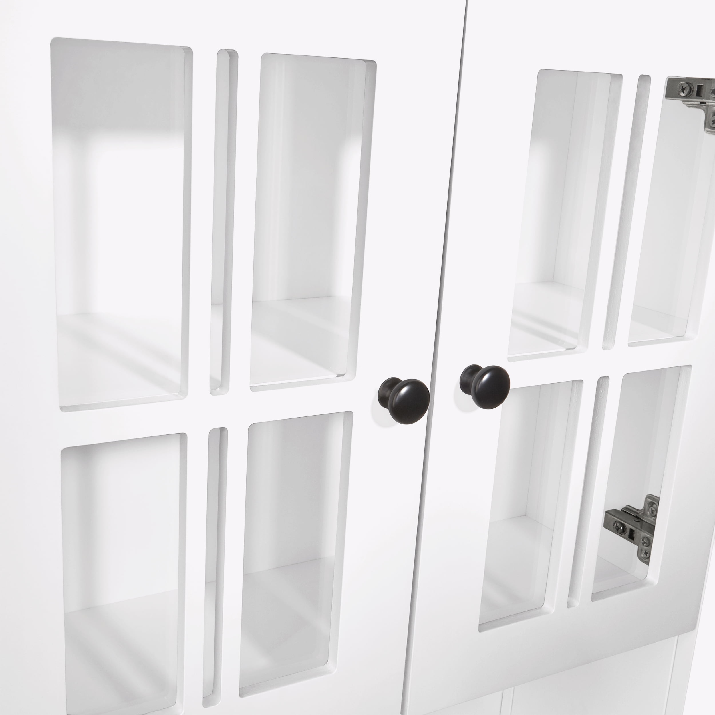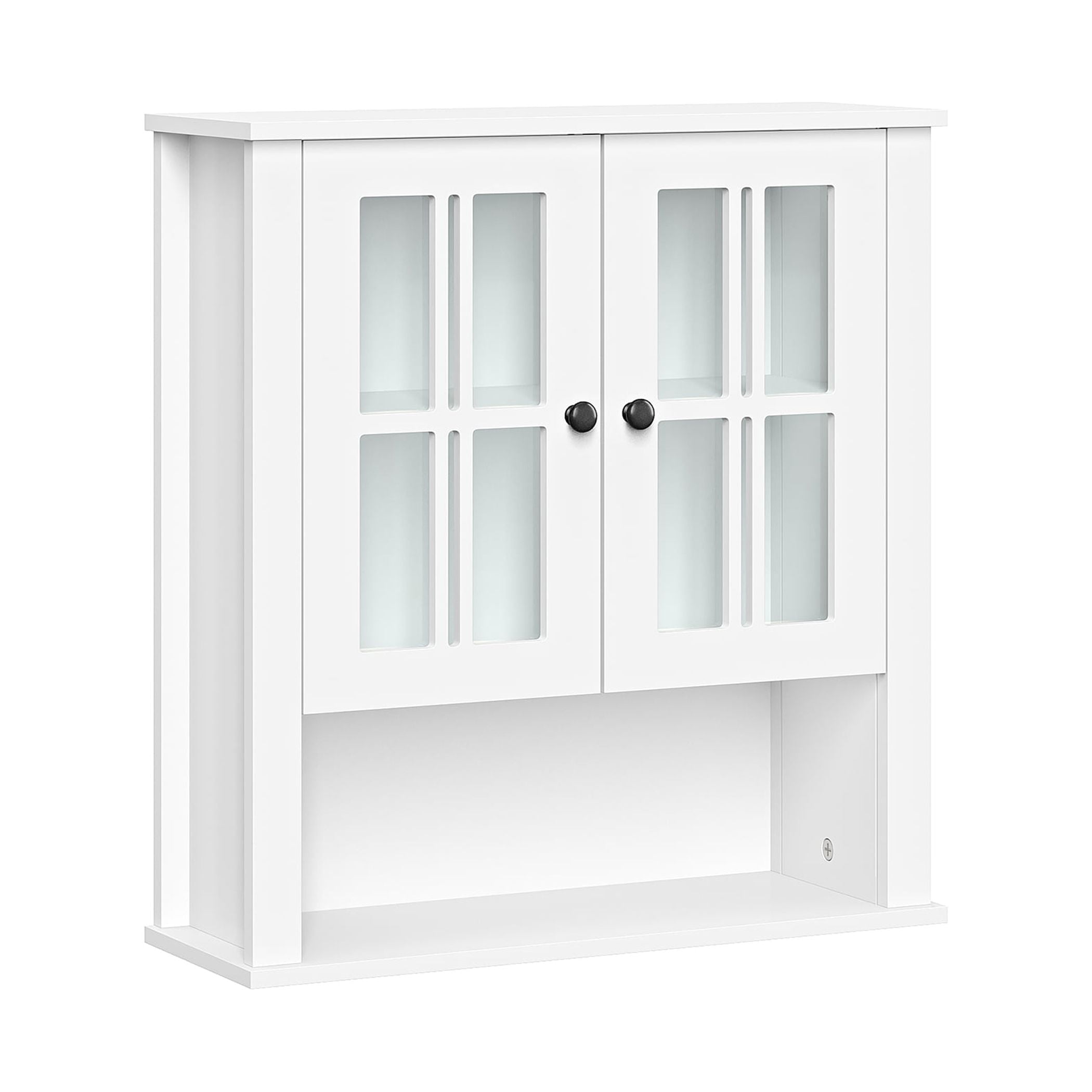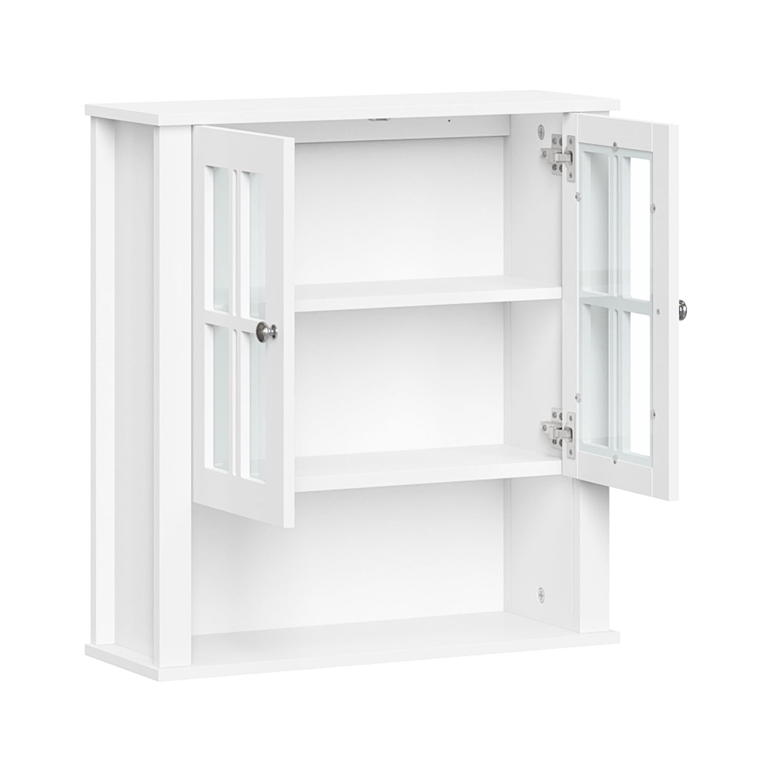 Functionality meets style with this charming two-door wall cabinet featuring windowpane-style glass doors and soft-close hinges Includes two interior fixed shelves and one open shelf below for a variety of storage and display options Classic design features smooth, white painted finish and includes two knob choices (polished silver and black) Includes detailed instructions for easy assembly and mounting to the wall Package includes your choice of door knobs (polished silver or black) Pair with any of the additional RiverRidge Home Danbury Collection items to add even more style and organization to your space Finished Assembled Size: 22.69″ W 7.75″ D 24.25″ H Overall Cabinet Interior: 18.75″ W 6.31″ D 15.25″ H Interior Shelves: 18.75″ W 6.31″ D Top Shelf Height: 7″ H Bottom Shelf Height: 7.5″ H