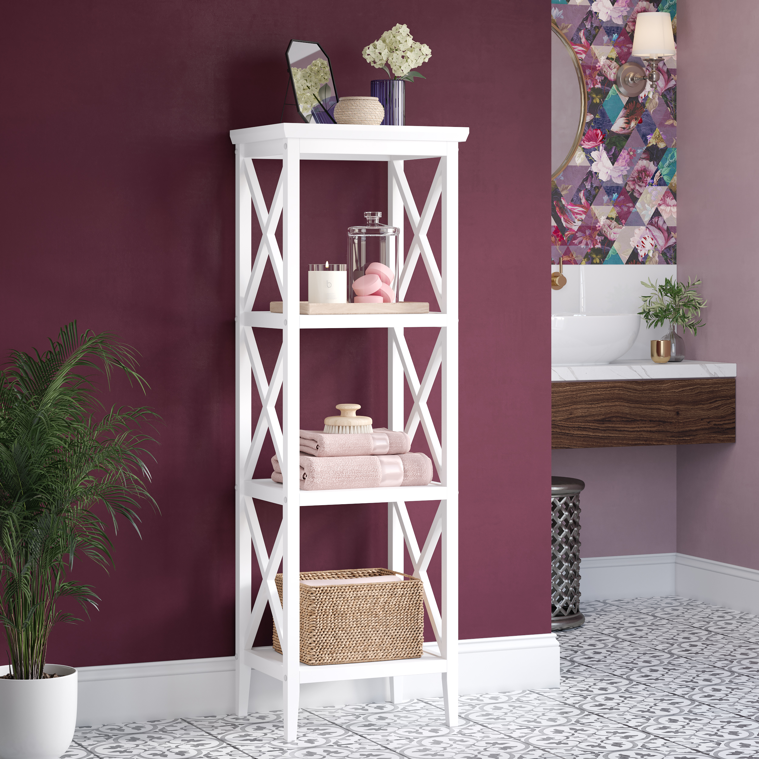 Stylish, contemporary shelving unit with cross-frame details and a smooth painted finish Features three open shelves and a top shelf, perfect for storing towels, toiletries, and displaying decorative accents Versatile design ideal for bathrooms, living rooms, offices, or entryways Includes instructions for easy assembly and secures to the wall with an adjustable anchor bracket for added stability Pair with the additional items in the RiverRidge® Home La Crosse Collection to give your space an organizational makeover Painted MDF