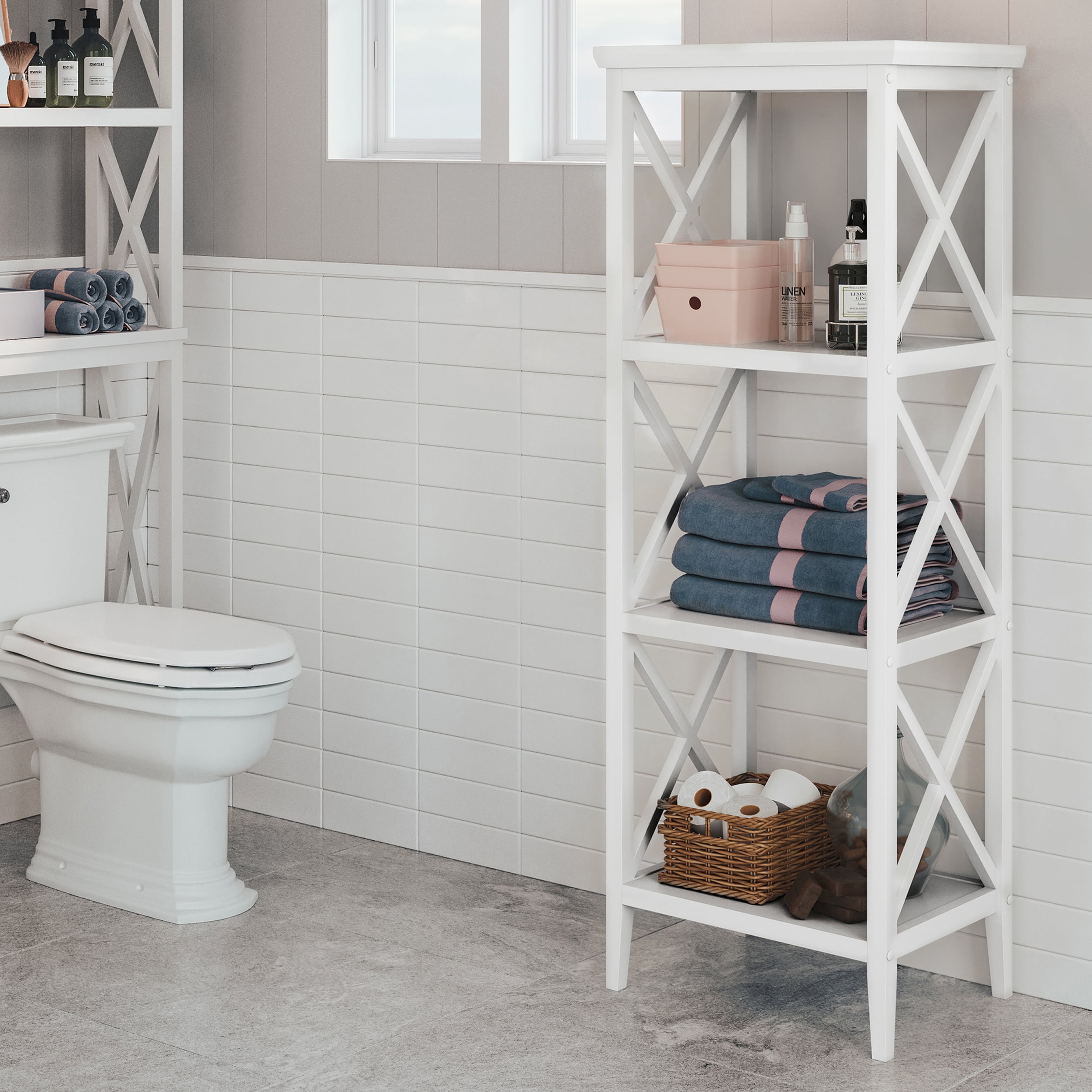 Functionality meets style in this stylish, contemporary shelving unit. Perfect for toiletries, towels and decorative accents, this cross-frame storage tower includes three open shelves and a top shelf for maximizing storage and display space. Use in the bathroom for extra towels and decorative baskets, or in the living room or office to organize books, photo albums and more. Includes instructions for easy assembly and secures to the wall with an adjustable anchor bracket for added stability. Pair with the additional items in the RiverRidge® Home La Crosse Collection to give your space an organizational makeover.