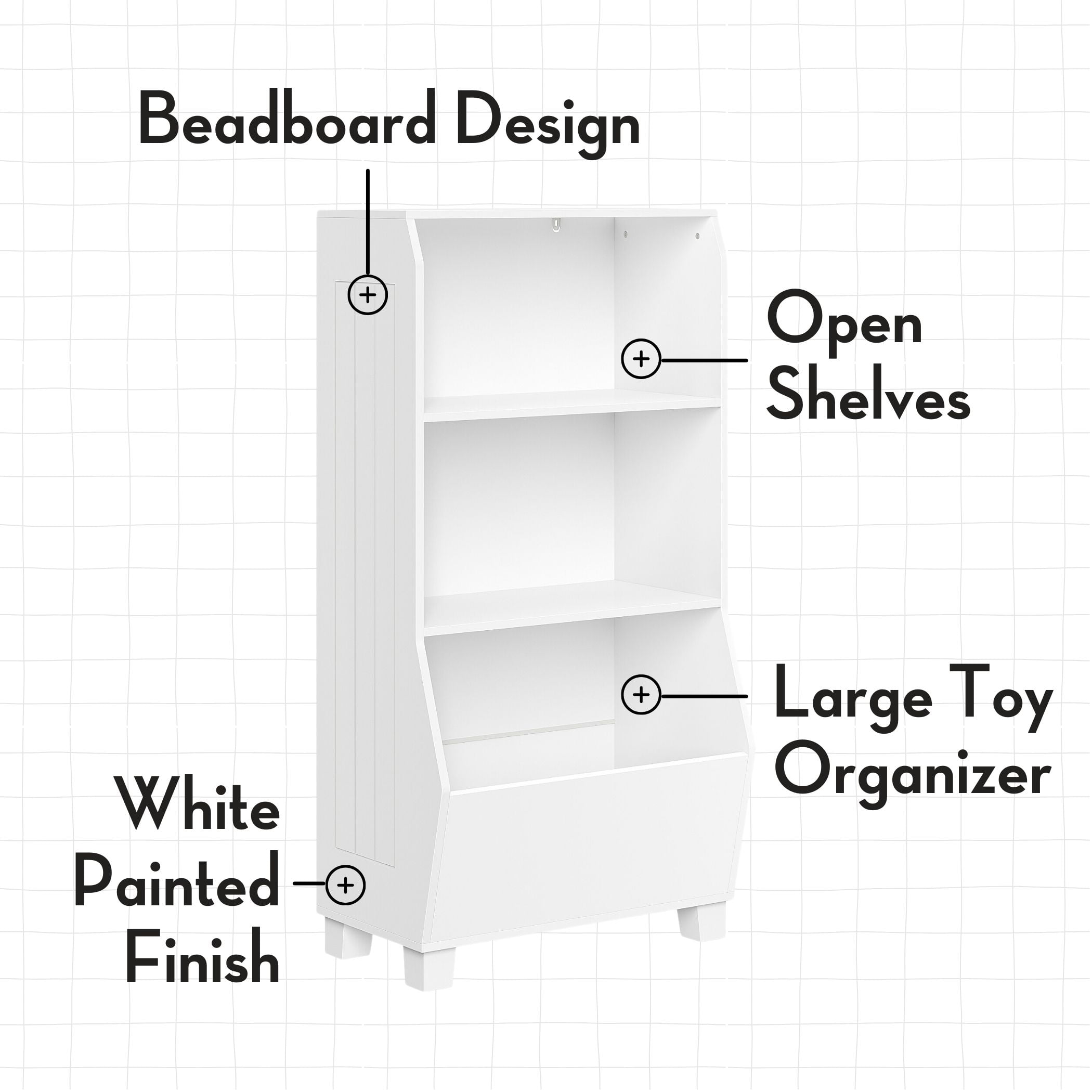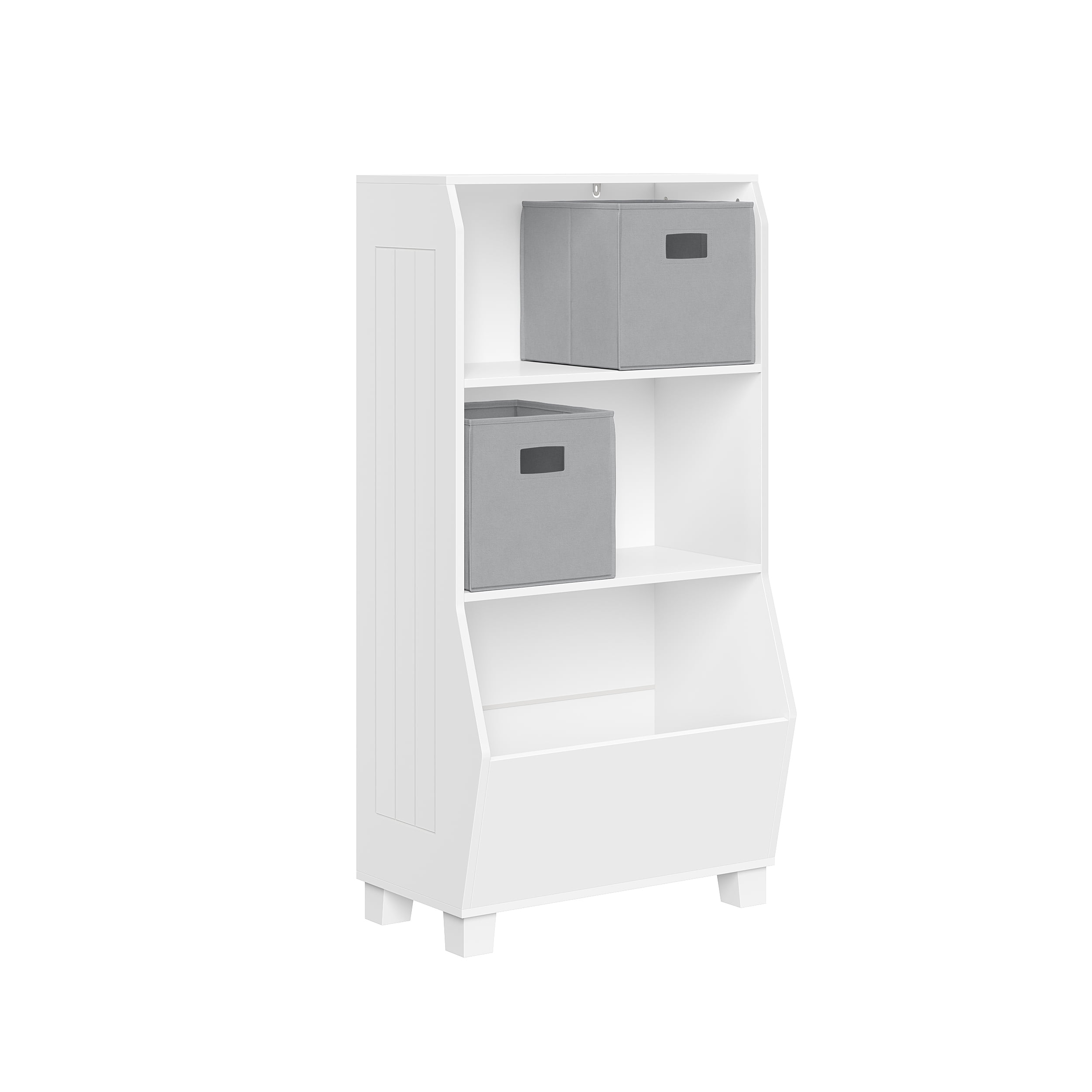 Assembled size 24″ W x 11.5″ D x 44.63″ H and weighs 33.34 lbs., Exterior shelf height: 11″ & 17.5″, Exterior shelf width: 21.75″, Exterior shelf depth: 10.75″ & 13″, Leg height: 2.375″. Ideal size for children at just under 45” tall. This kids’ bookcase with storage will hold 20 lbs. per shelf for a total weight of 80 lbs. Features two open shelves, and one deep veggie bin, offering ample toy storage and book storage for kids. The toy organizer and bookshelf is made from painted MDF for long lasting durability. The 2pc bins are made from non-woven polypropylene. Our RiverRidge 2Pc Gray Fabric Folding Storage Bins are included! A perfect way to give your playroom a fresh, new look. The children’s bookcase offers a sleek white finish and complements any kid’s furniture décor. Ideal size for children at just under 45” tall Securely anchor the bookcase to the wall for enhanced stability with the provided tip-over restraints and wall mounting hardware, along with an easy to follow assembly guide Recommended for children ages 3 and up