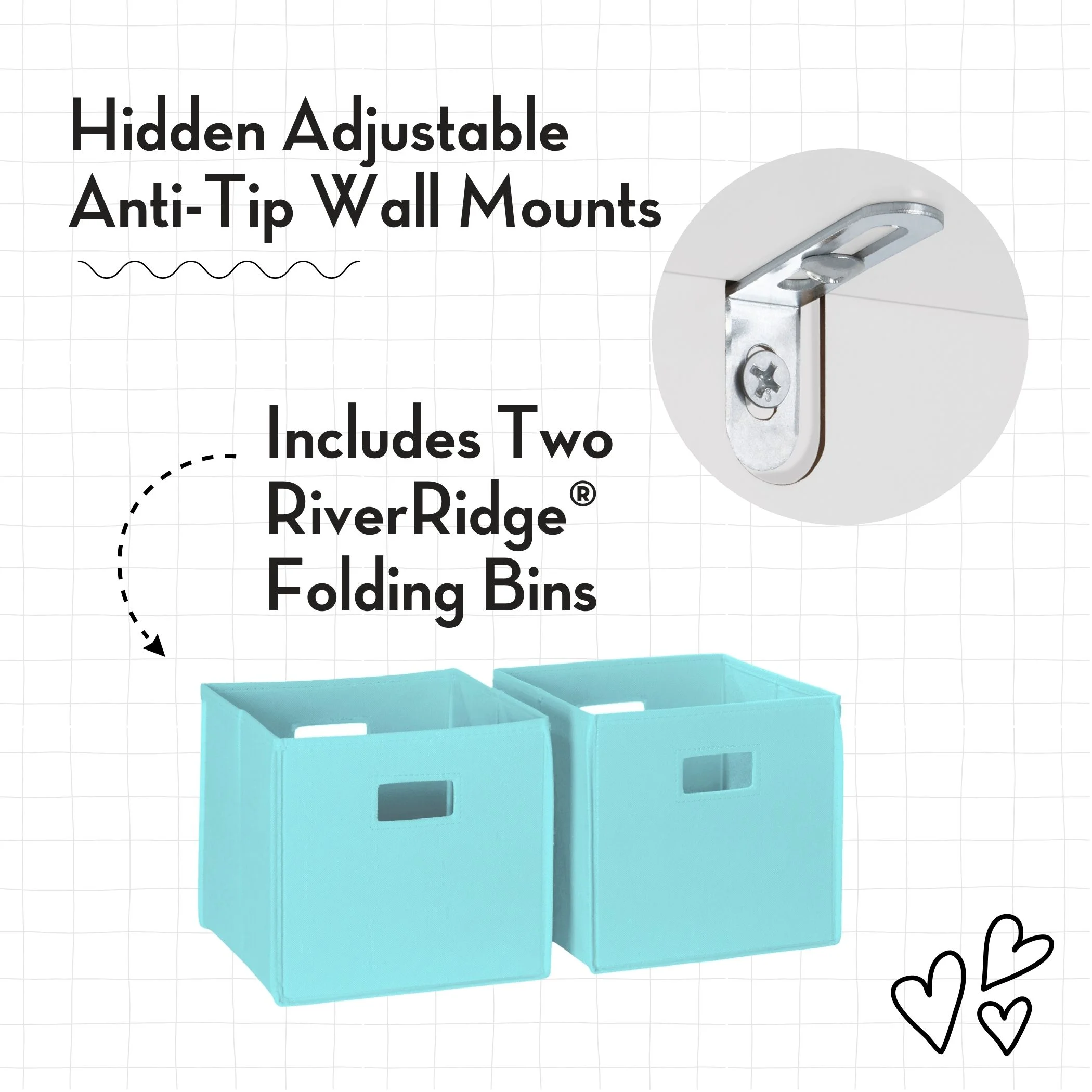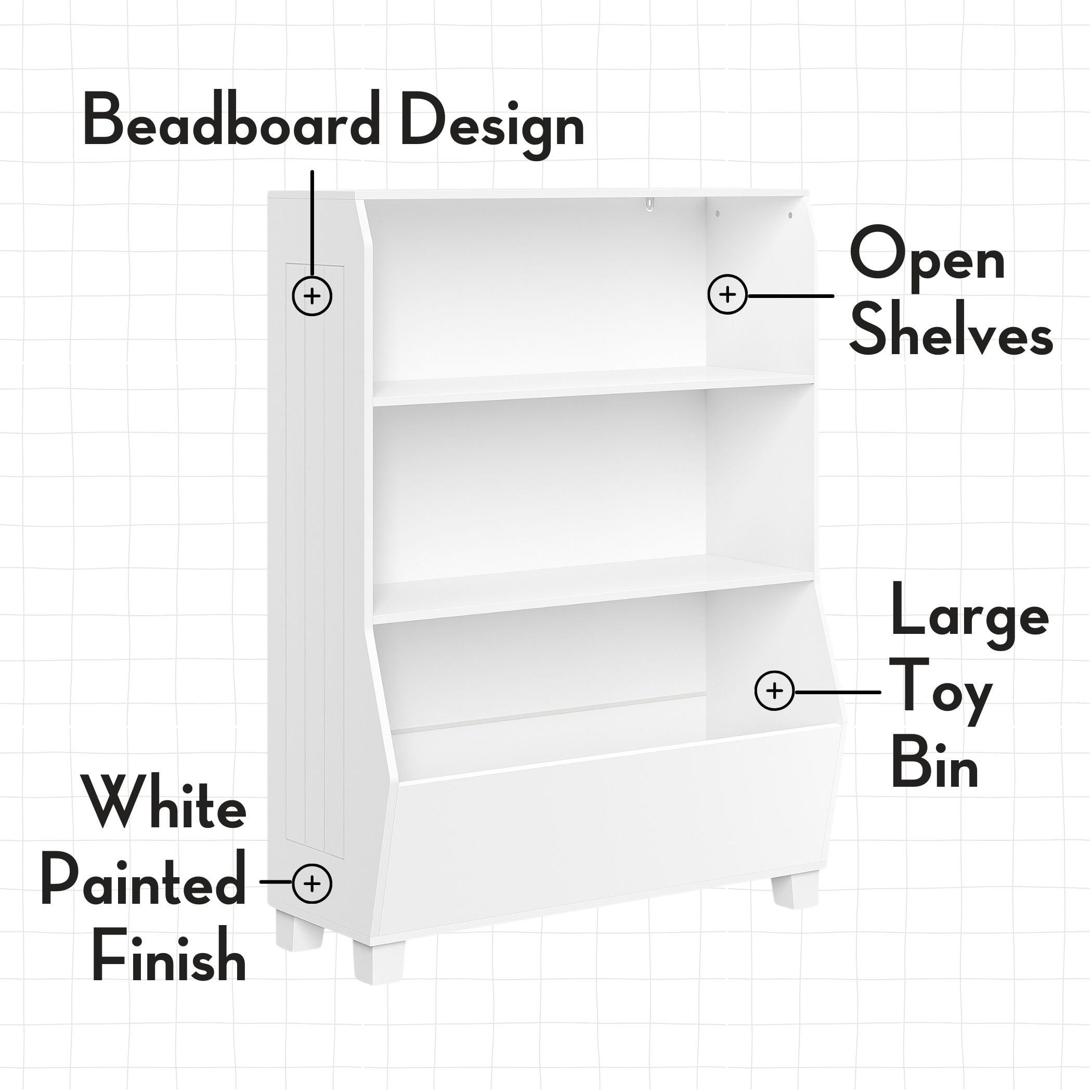 Assembled size 33.5″ W x 13.75″ D x 44.6″ H. and weighs 48.79 lbs., Exterior shelf height: 11″ & 17.5″, Exterior shelf width: 32.38″, Exterior shelf depth: 10.75″ & 13″, Leg height: 2.375″. Ideal size for children at just 45” tall This kids’ bookcase with storage will hold 20 lbs. per shelf, for a total weight of 80 lbs. It features two open shelves and one deep veggie bin, offering ample toy and book storage for kids. The toy organizer and bookshelf is made from painted MDF with solid pine legs for long lasting durability. The 2pc bins are made from non-woven polypropylene. Includes RiverRidge 2pc Gray Fabric Folding Storage Bins This multifunctional bookshelf offers a classic finish and complements any kid’s furniture décor. Securely anchor the bookcase to the wall for enhanced stability with the provided tip-over restraints and wall mounting hardware, along with an easy to follow assembly guide Recommended for children ages 3 and up