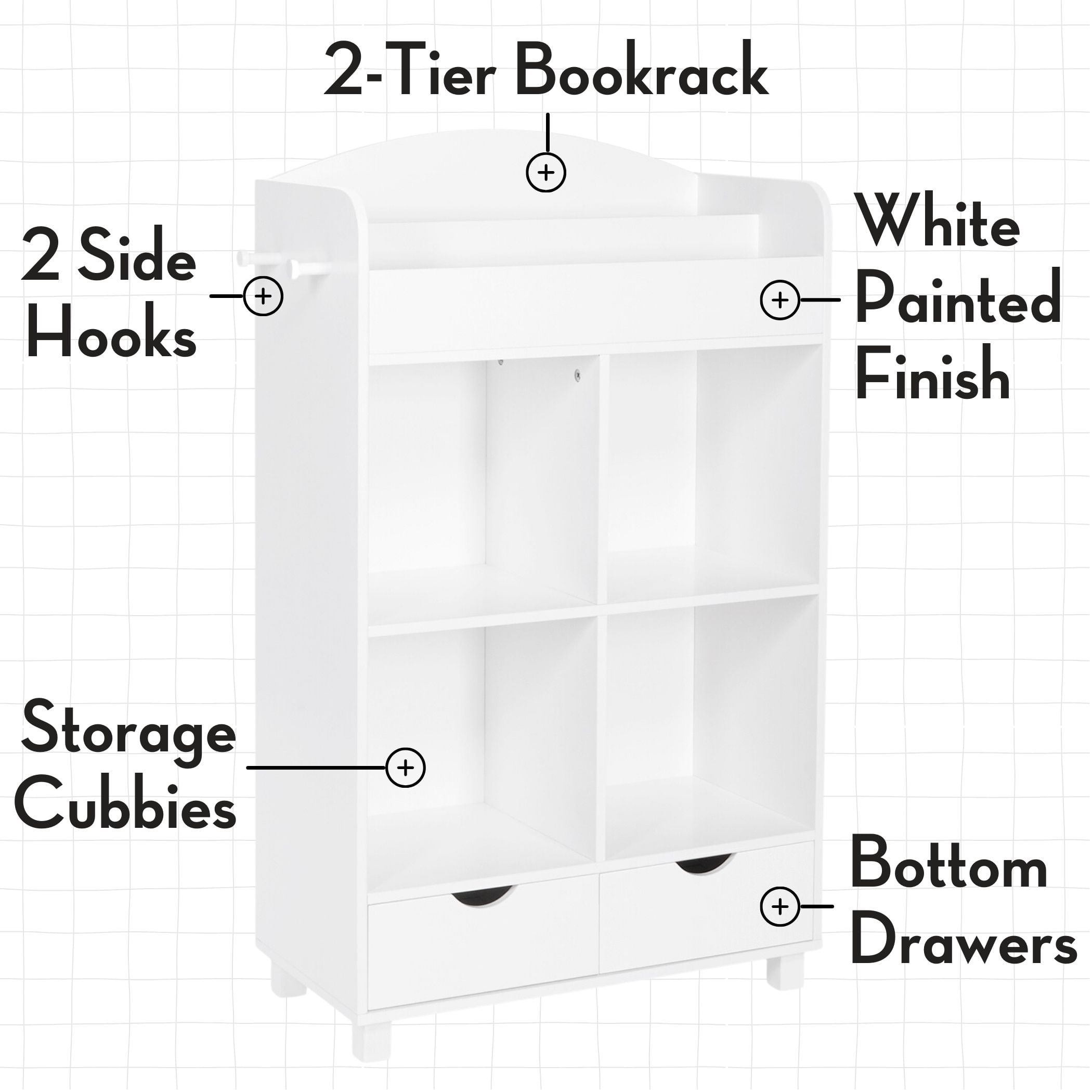 Our Kids’ Book Nook Cubby Storage Cabinet with Bookrack is a game-changer for kids’ bedroom furniture and playroom decor. With its four spacious cubbies, two drawers, and a two-slot bookrack, this clever storage solution keeps toys, books, and clutter neatly organized. Bid farewell to scattered chaos and embrace a tidy kids’ room organization system that instills a sense of order and responsibility in little ones. Crafted with a sturdy MDF frame and a beautiful white painted finish, this kids’ storage organizer seamlessly blends into any room’s decor. The included hooks provide a convenient spot for hanging backpacks or jackets, while the optional two-piece folding storage bins (sold separately) offer extra toy storage options. With a weight capacity of up to 120 lbs., this robust unit can handle even the most extensive toy collections. Imagine the joy of having a dedicated toy organizer and storage system that encourages independent play and easy cleanup. Our Kids’ Book Nook Cubby Storage Cabinet with Bookrack is the ultimate toy organizer and storage bin solution, making it a breeze for children to access their favorite playthings and tidy up when the fun is done.