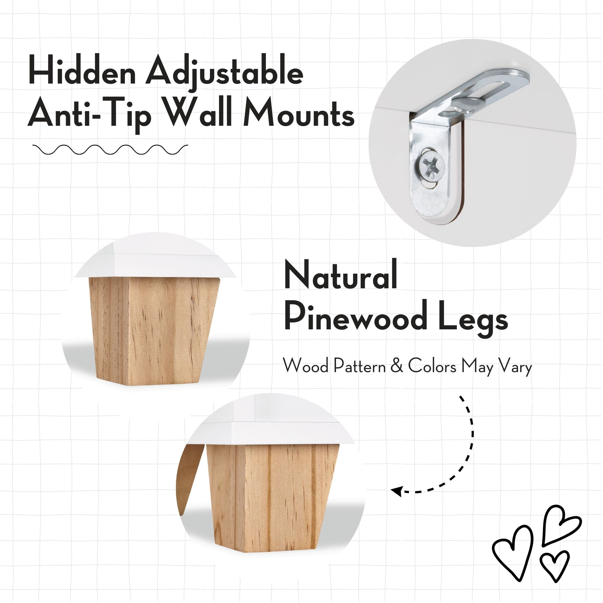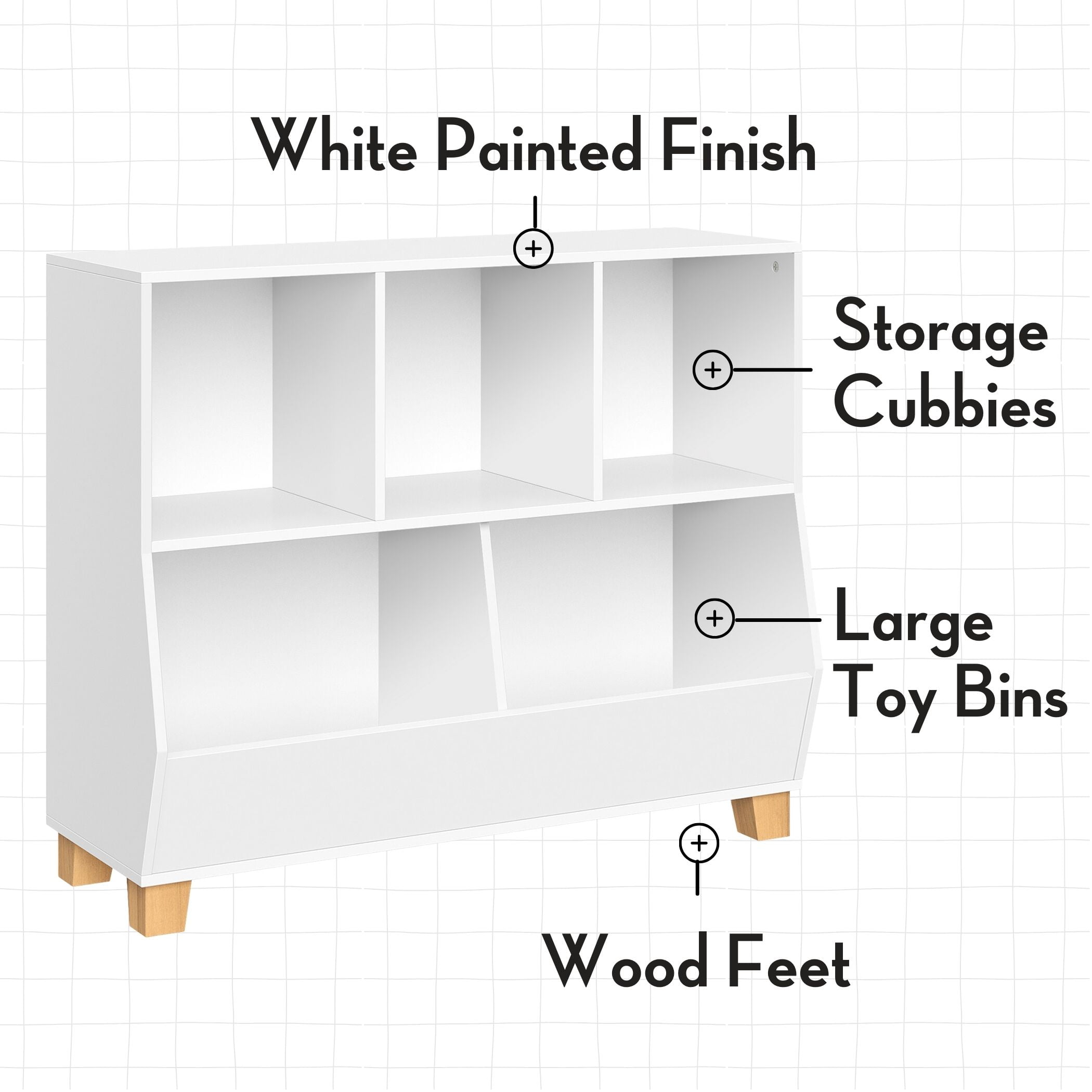 Assembled size: 13.31-in. D x 35.1-in. W x 29.1-in. H. Cube size: 10.75-in. D x 10.9-in. W x 11.25-in. H This RiverRidge Kids 35″ Wide Catch-All Toy Storage Organizer is the perfect solution to manage clutter. With three cubbies each holding 20 lbs, Two deep veggie bins each holding up to 20 lbs and the top holding up to 20 lbs you can organize books, toys, building blocks, puzzles and so much more. Use in kid’s playroom, craft room or out in your living areas to keep all of your children’s things neat and tidy. The toy organizer and bookshelf is made from painted MDF with solid pine legs for long lasting durability. The 2pc bins are made from non-woven polypropylene. Includes 2 Gray Fabric Bins for a pop of color while concealing clutter Create the perfect “catch-all” spot for all of the kids’ things with this multi-cubby organizer. Featuring three square cubbies and two spacious storage compartments. Storage unit is the perfect height for children at just 29” tall. Securely anchor the toy organizer to the wall for enhanced stability with the provided tip-over restraints and wall mounting hardware, along with an easy to follow assembly guide Pair with additional RiverRidge® kids storage items to give the playroom a fresh, new look. Recommended for children ages 3 and up.